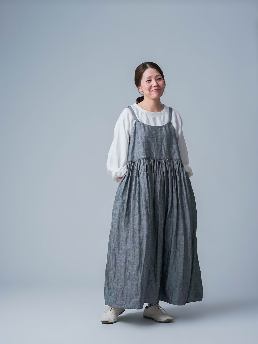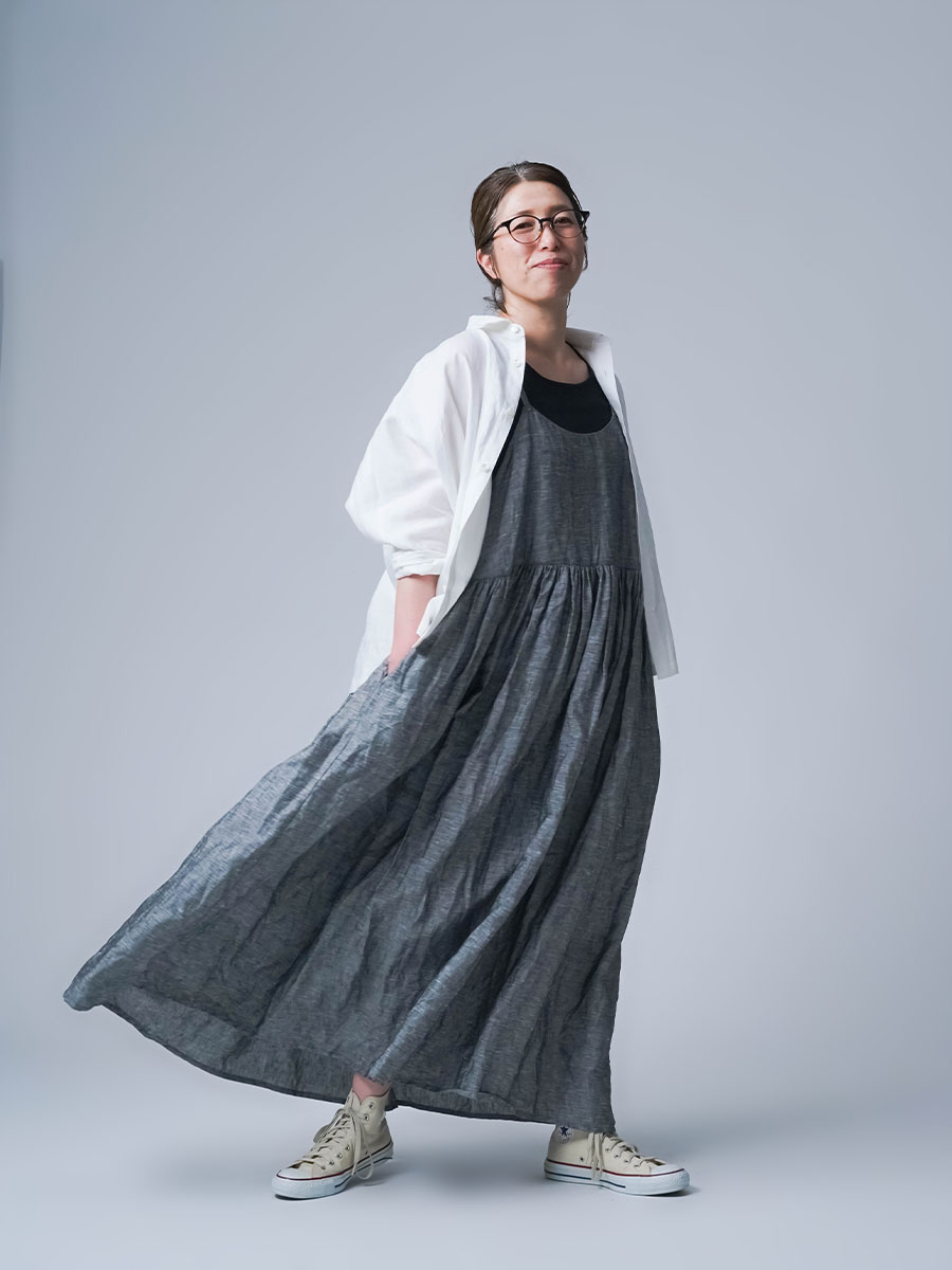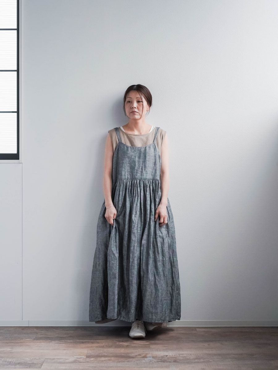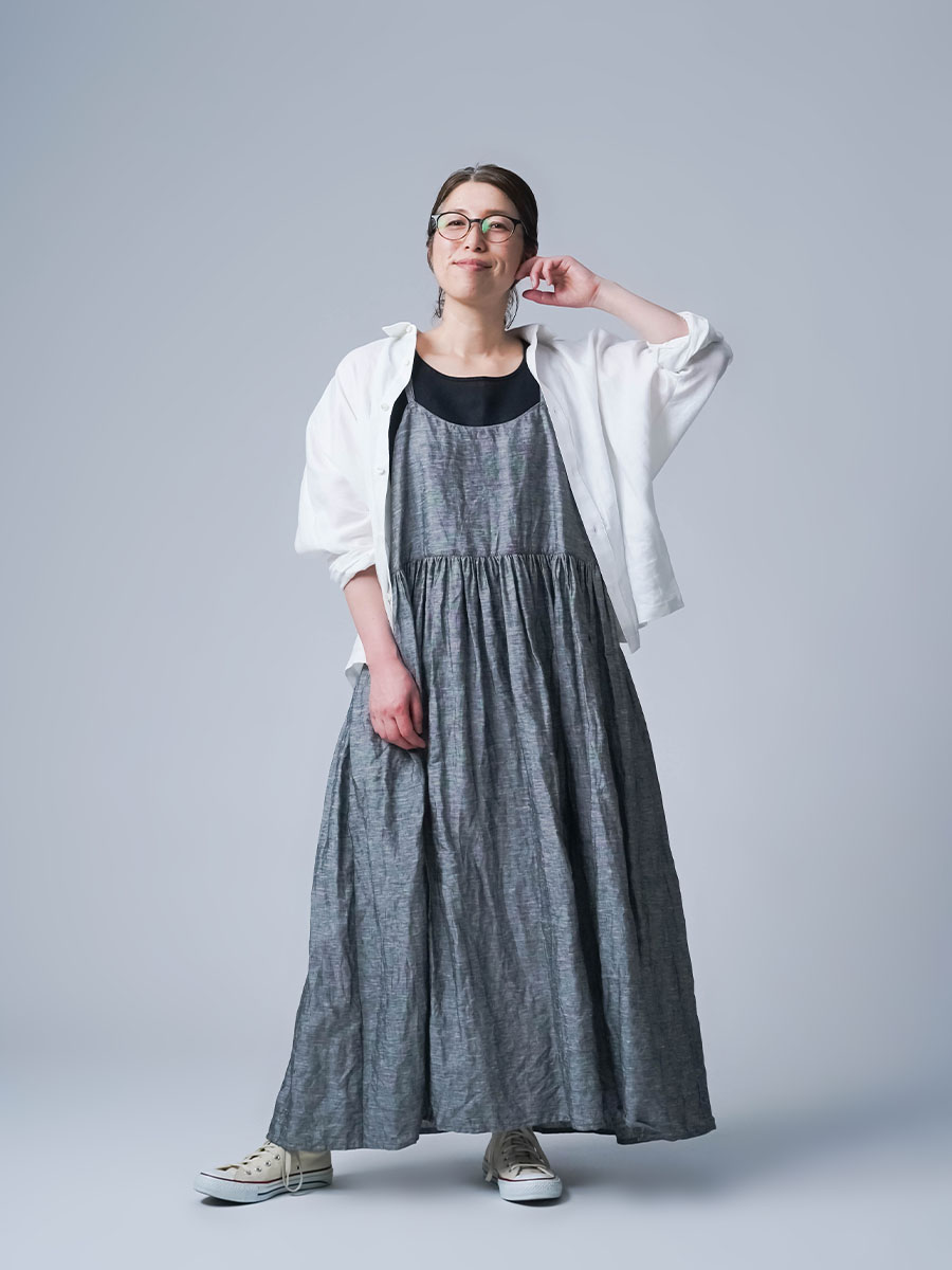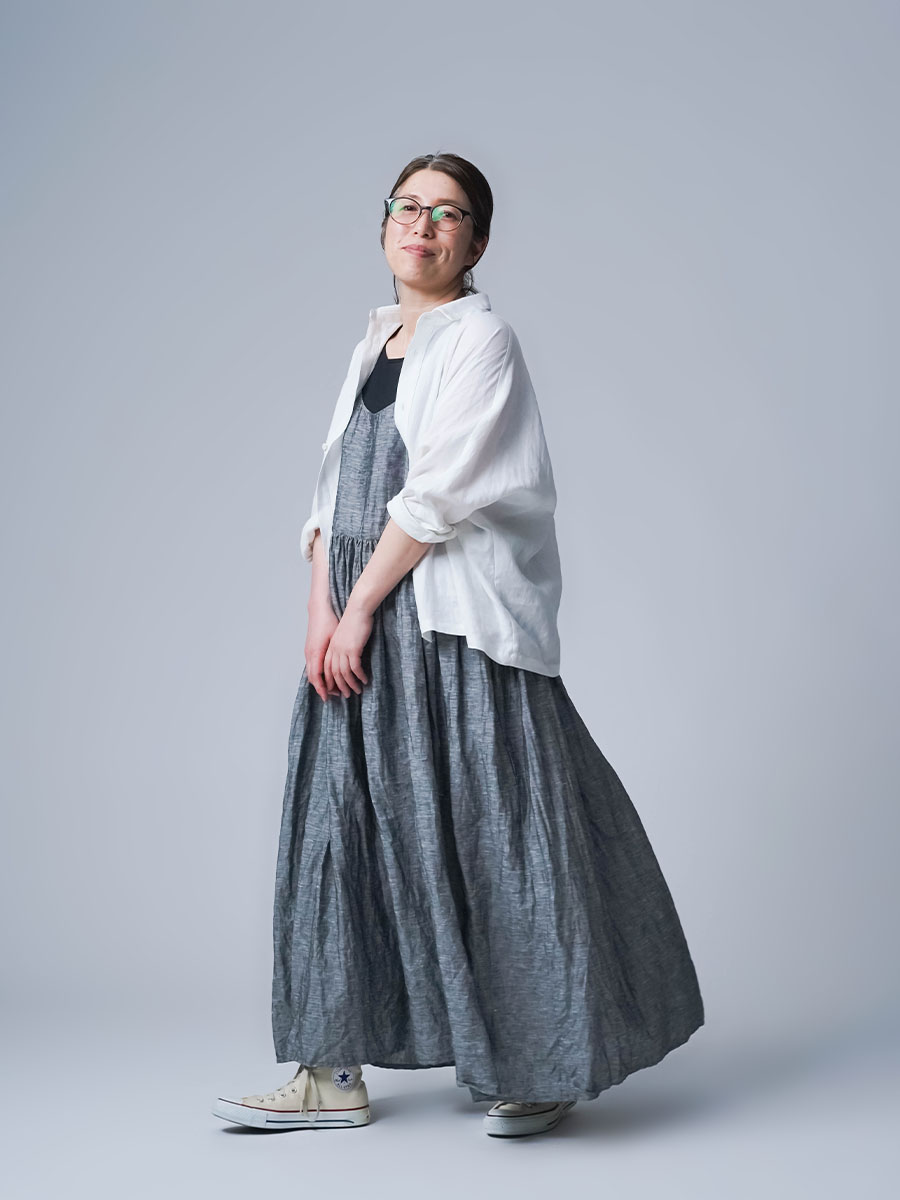 ゆるっと着たかったので、私はLサイズを選びました。このデザインのやわらかさはそのままに、シャンブレーになると甘さが少し引き締まって、ぐっと大人っぽくなります。色も少し濃いめなので、着た時に陰影が出てかっこいいんです。可愛さもあるのに、ちゃんと落ち着いて見えるのがいいですね。歳を重ねても無理せず着られる、そんなワンピースだなと思いました。重ね着しても締め付け感がなくて、これは夏にぴったりです。着丈は踝丈、バストはゆったりしています。透け感はほとんど感じません。