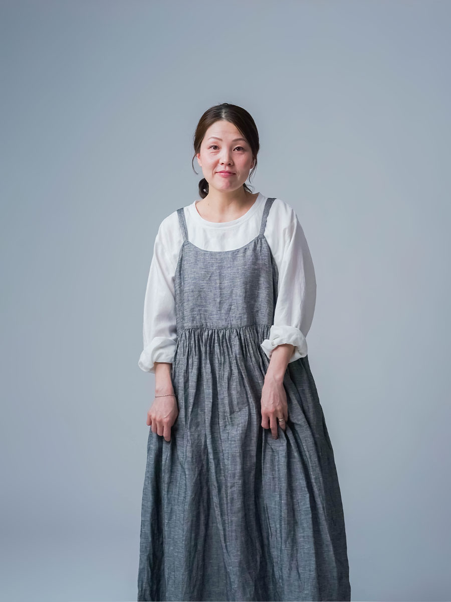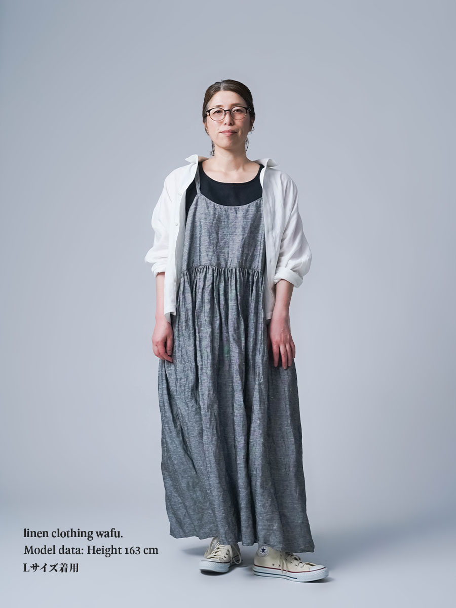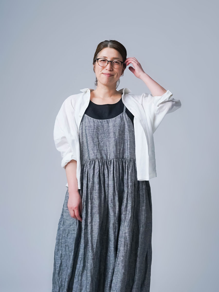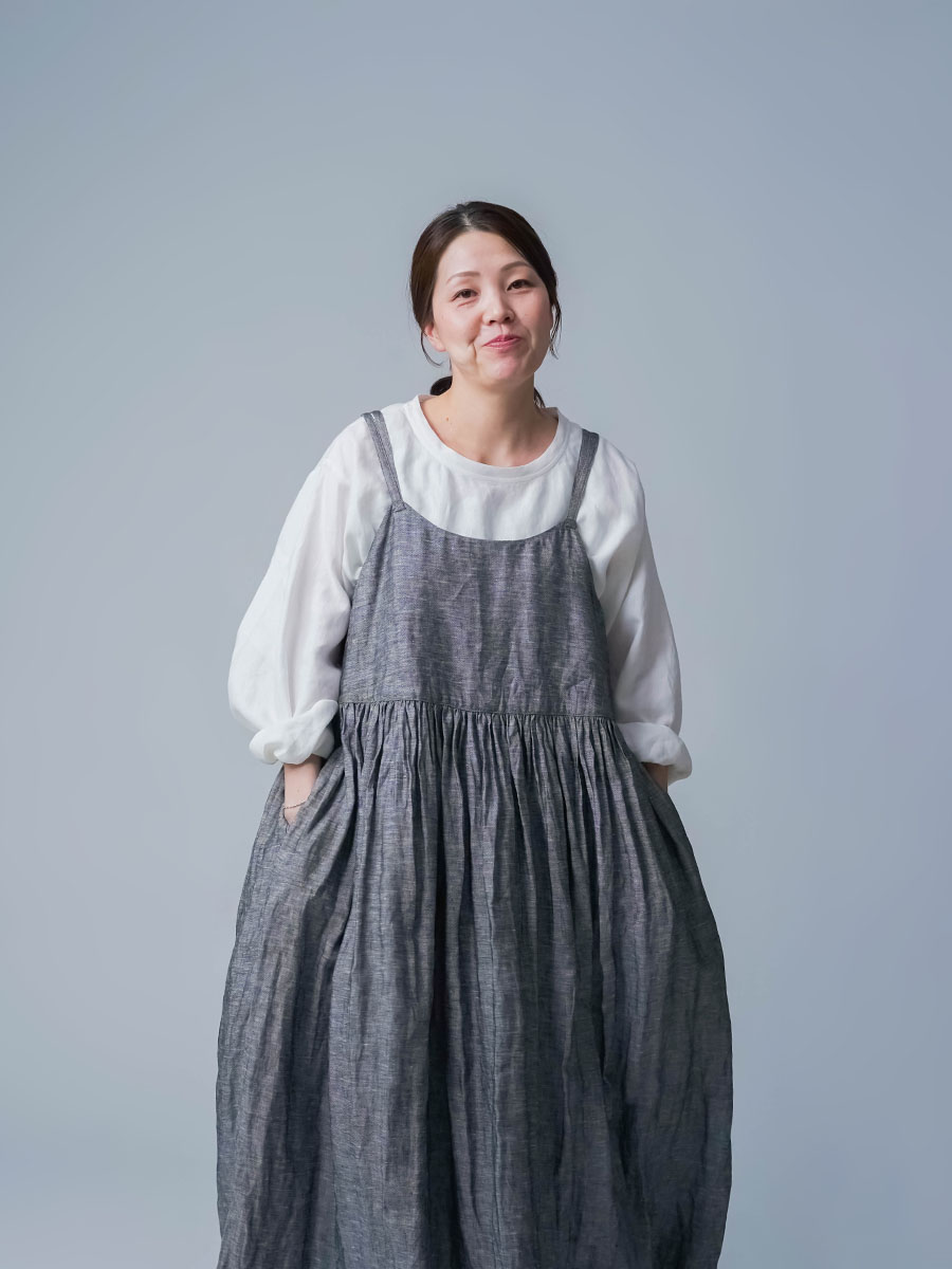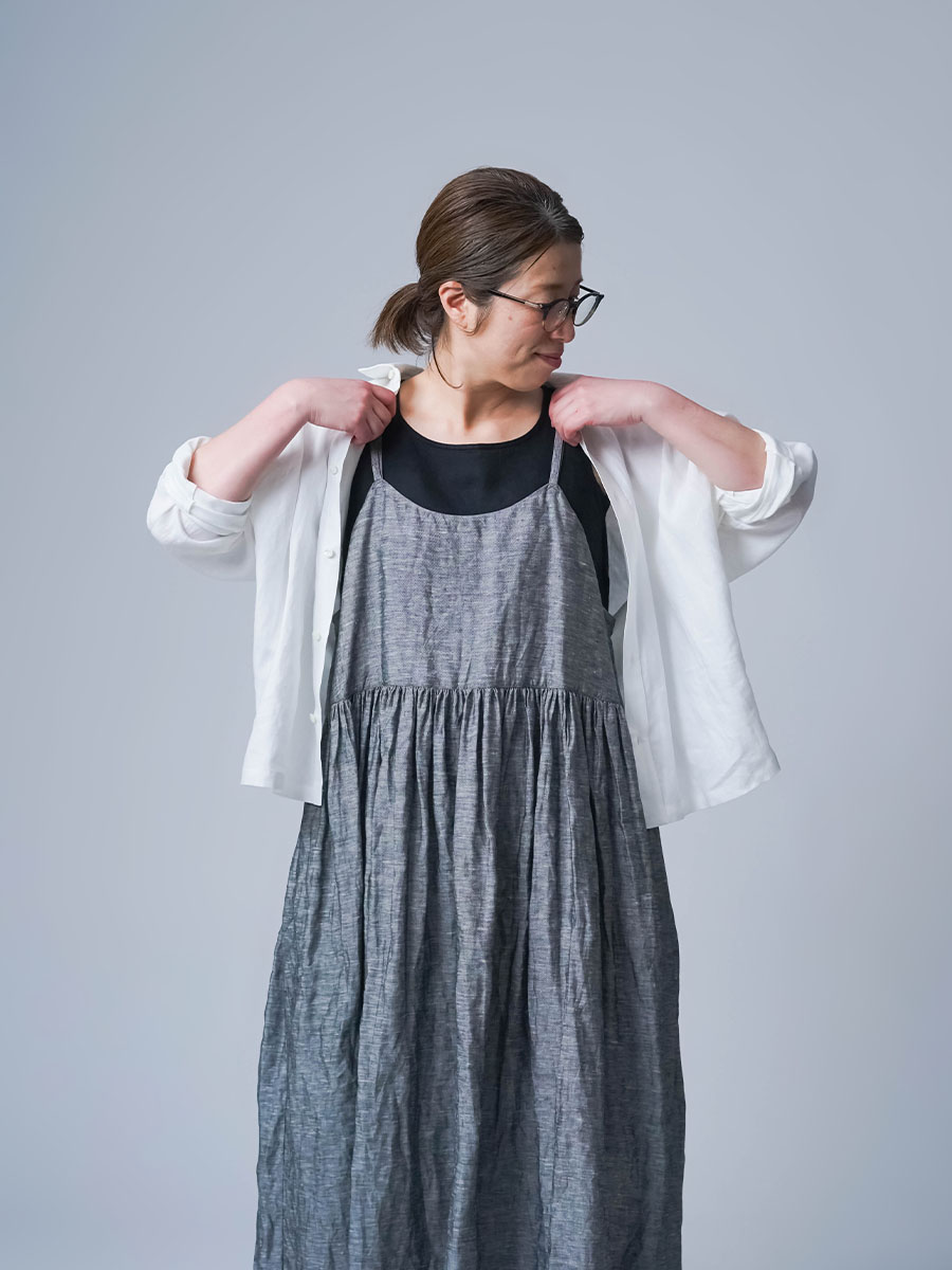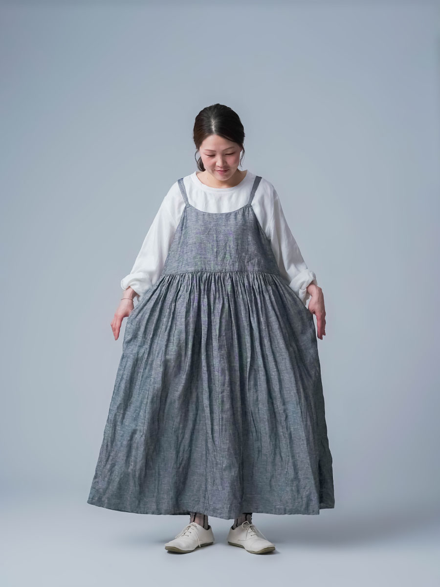 ゆるっと着たかったので、私はLサイズを選びました。このデザインのやわらかさはそのままに、シャンブレーになると甘さが少し引き締まって、ぐっと大人っぽくなります。色も少し濃いめなので、着た時に陰影が出てかっこいいんです。可愛さもあるのに、ちゃんと落ち着いて見えるのがいいですね。歳を重ねても無理せず着られる、そんなワンピースだなと思いました。重ね着しても締め付け感がなくて、これは夏にぴったりです。着丈は踝丈、バストはゆったりしています。透け感はほとんど感じません。