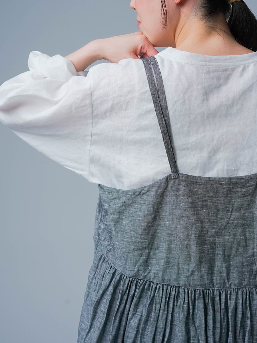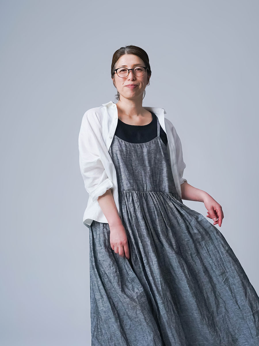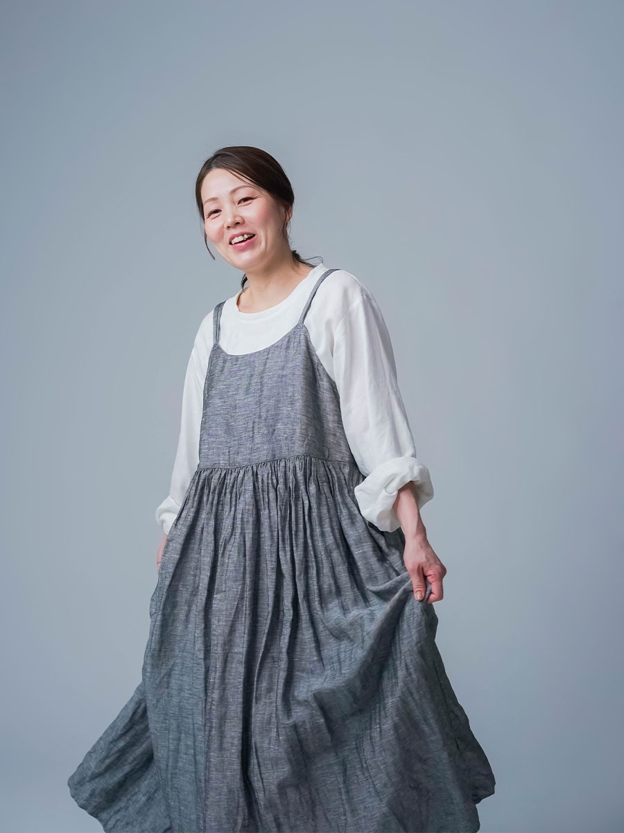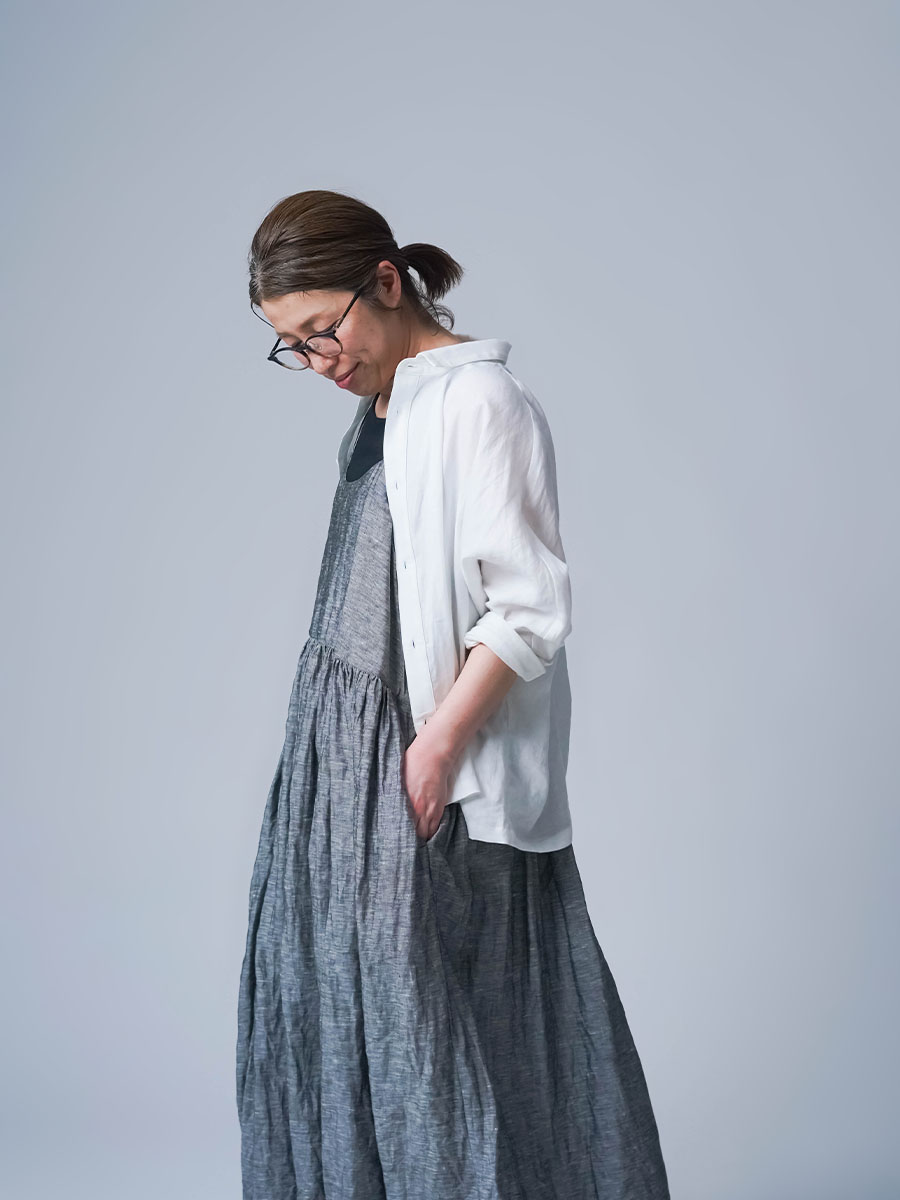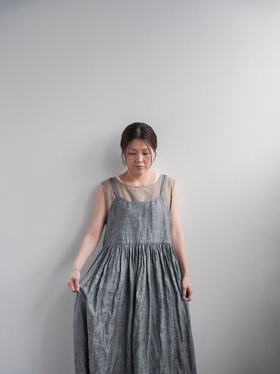 ゆるっと着たかったので、私はLサイズを選びました。このデザインのやわらかさはそのままに、シャンブレーになると甘さが少し引き締まって、ぐっと大人っぽくなります。色も少し濃いめなので、着た時に陰影が出てかっこいいんです。可愛さもあるのに、ちゃんと落ち着いて見えるのがいいですね。歳を重ねても無理せず着られる、そんなワンピースだなと思いました。重ね着しても締め付け感がなくて、これは夏にぴったりです。着丈は踝丈、バストはゆったりしています。透け感はほとんど感じません。