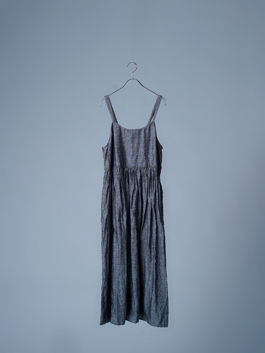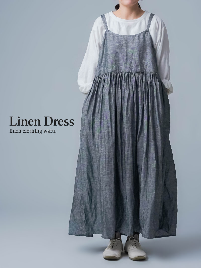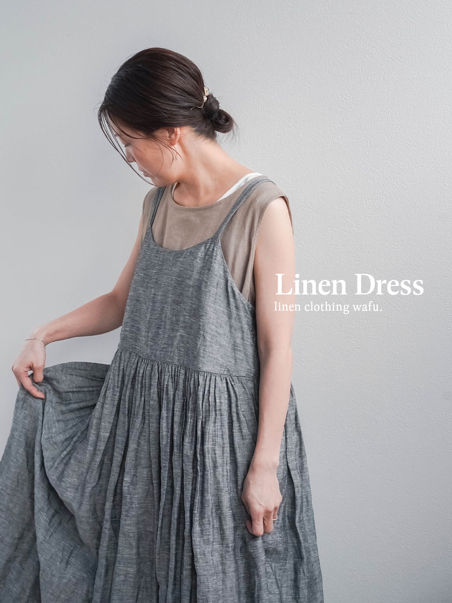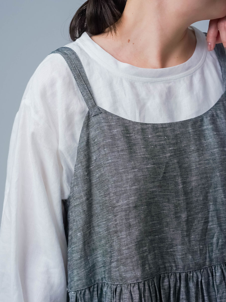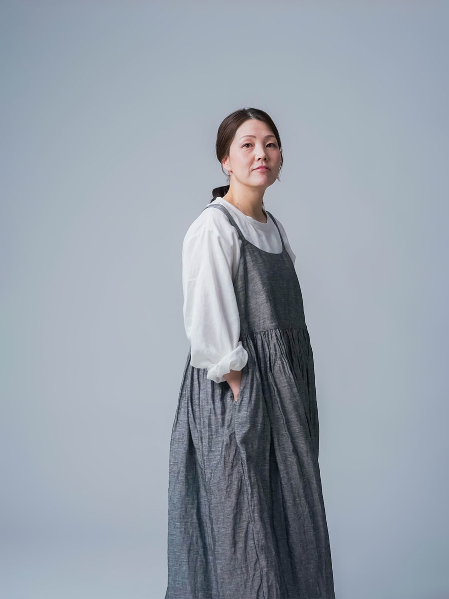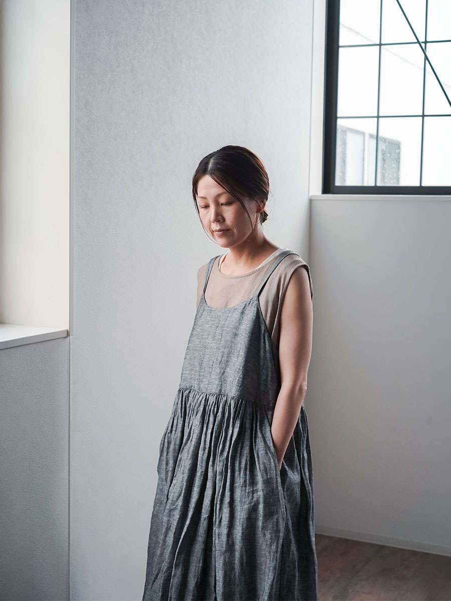 ゆるっと着たかったので、私はLサイズを選びました。このデザインのやわらかさはそのままに、シャンブレーになると甘さが少し引き締まって、ぐっと大人っぽくなります。色も少し濃いめなので、着た時に陰影が出てかっこいいんです。可愛さもあるのに、ちゃんと落ち着いて見えるのがいいですね。歳を重ねても無理せず着られる、そんなワンピースだなと思いました。重ね着しても締め付け感がなくて、これは夏にぴったりです。着丈は踝丈、バストはゆったりしています。透け感はほとんど感じません。