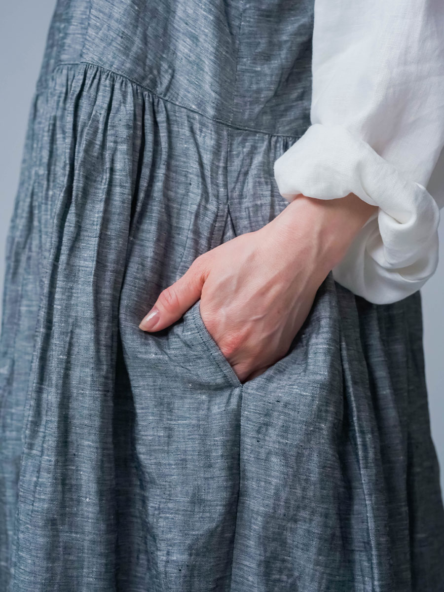 - ※生地工場の生産時期によって色味の濃淡が出ることがございます。セットアップでの着用の場合はご相談下さい。カラーリネンは最初色落ちや生地の性質上、毛羽落ちがある場合がございます。落ち着くまで数回は単品でのお洗濯を。最初は水通しをおすすめします。表面の毛羽立ちがとれて、肌への刺激が極端に少なくなります。リネン特有のネップ、節がございます。