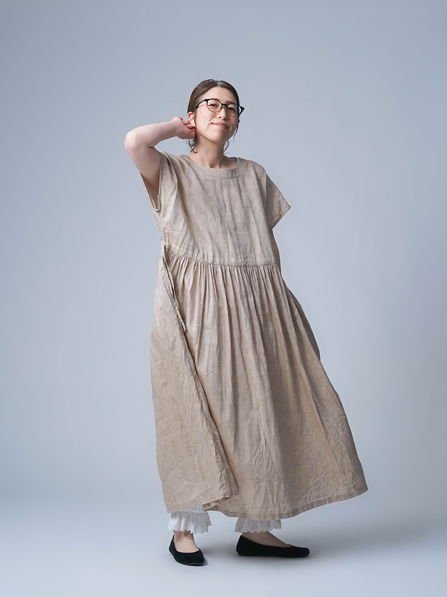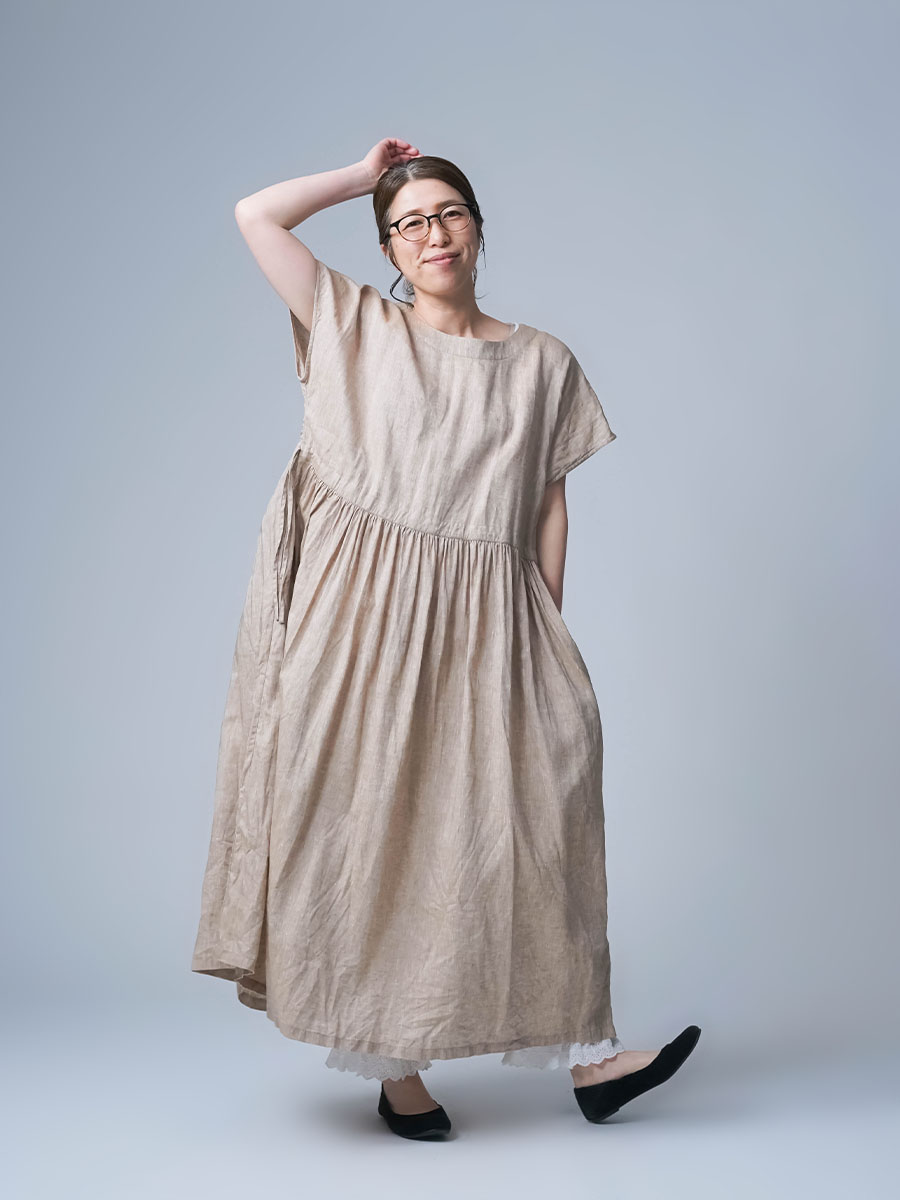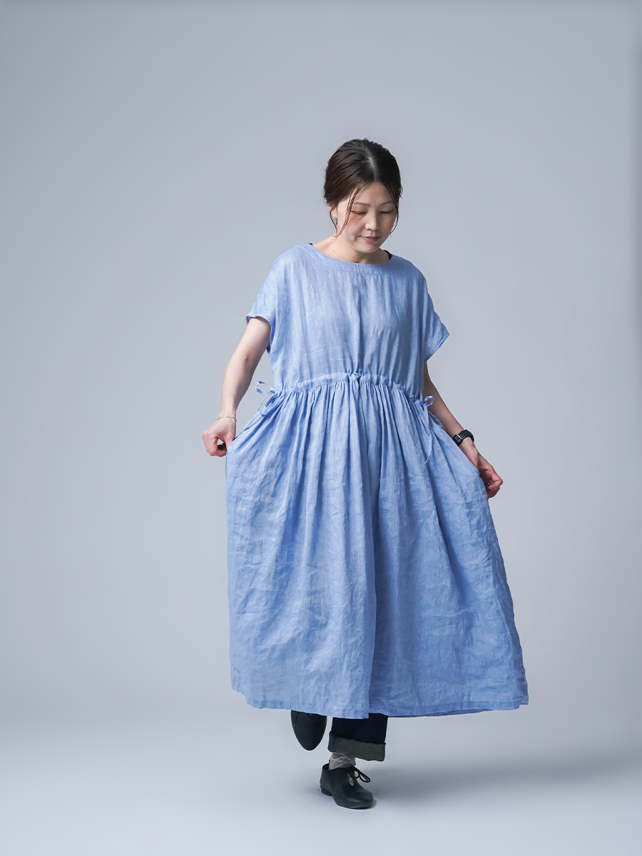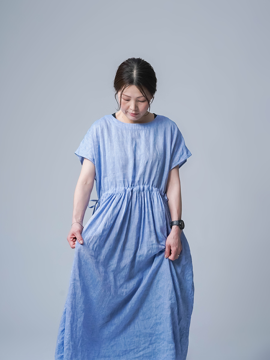 私はLサイズです。少し外に出ただけで、服の中を風がすっと通り抜けていく心地よさがあります。今年もやってくるあの猛暑に、もうこれ一枚で過ごしたいと思ったほどです。身幅はたっぷり、袖口も広め。肌に触れる部分が少ないから、暑い日もまとわりつかず、とにかく軽やかです。さらにウエストは紐でブラウジングができるので、その日の気分でシルエットの変化も楽しめます。着丈はくるぶしの5cm上ほど。軽やかさと上品さ、どちらも楽しめる一着です