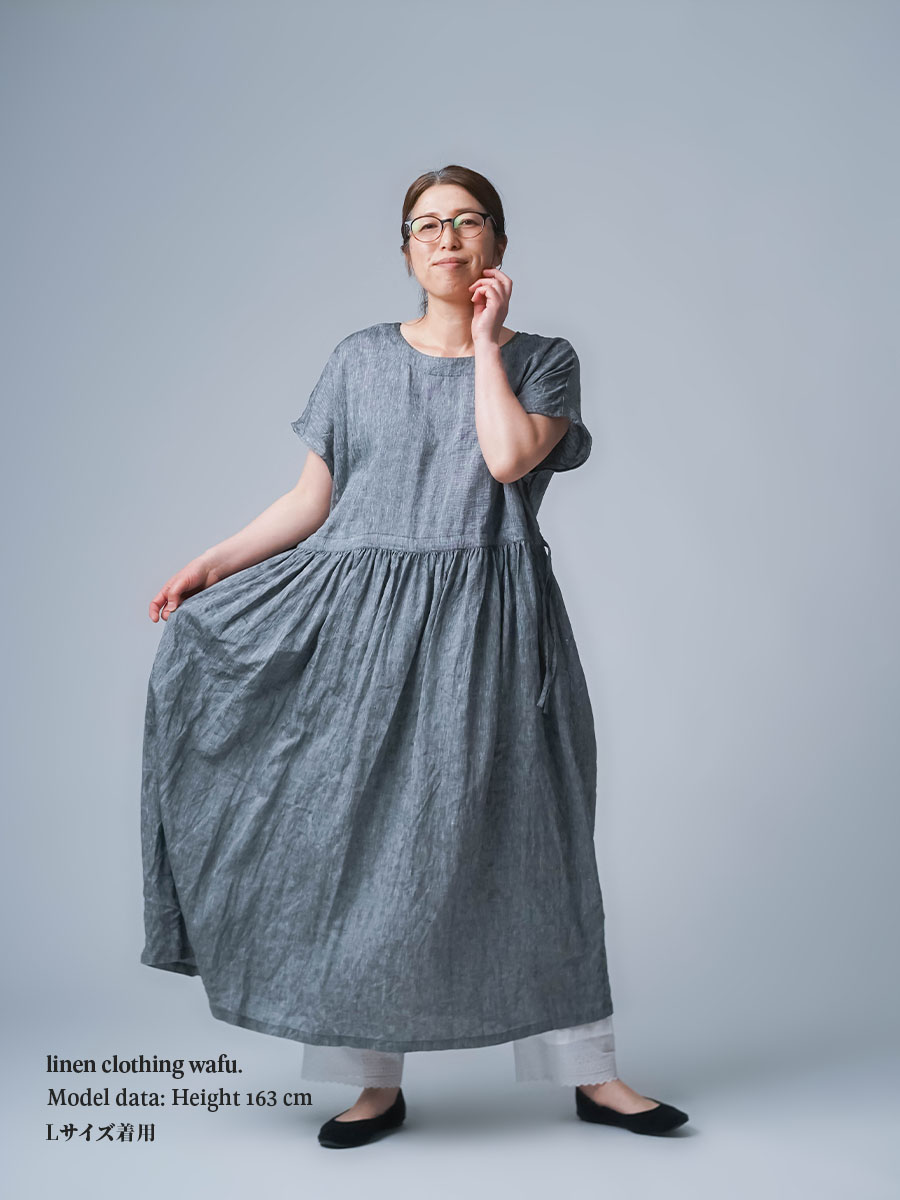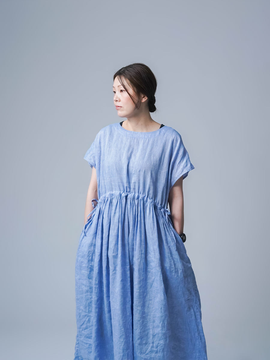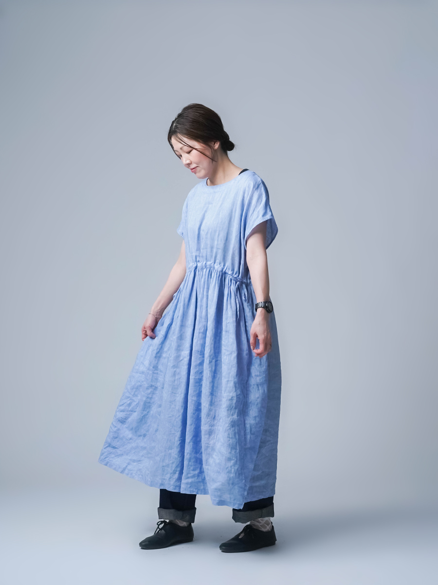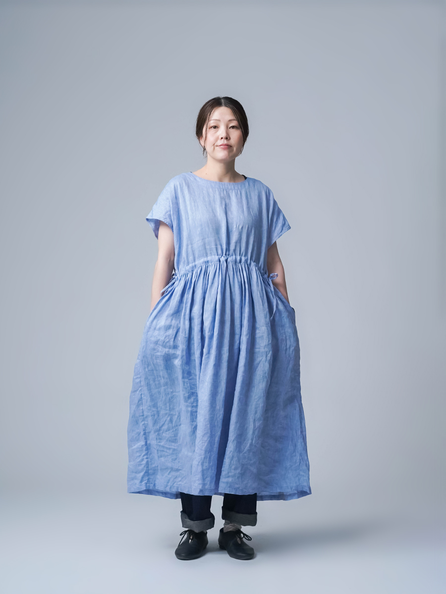 私はLサイズです。少し外に出ただけで、服の中を風がすっと通り抜けていく心地よさがあります。今年もやってくるあの猛暑に、もうこれ一枚で過ごしたいと思ったほどです。身幅はたっぷり、袖口も広め。肌に触れる部分が少ないから、暑い日もまとわりつかず、とにかく軽やかです。さらにウエストは紐でブラウジングができるので、その日の気分でシルエットの変化も楽しめます。着丈はくるぶしの5cm上ほど。軽やかさと上品さ、どちらも楽しめる一着です