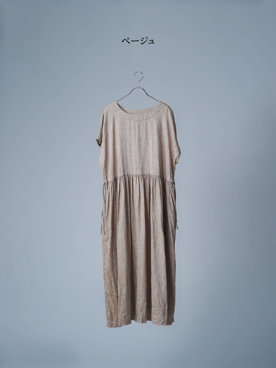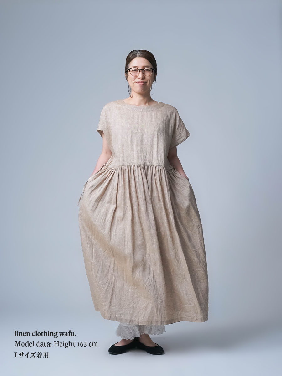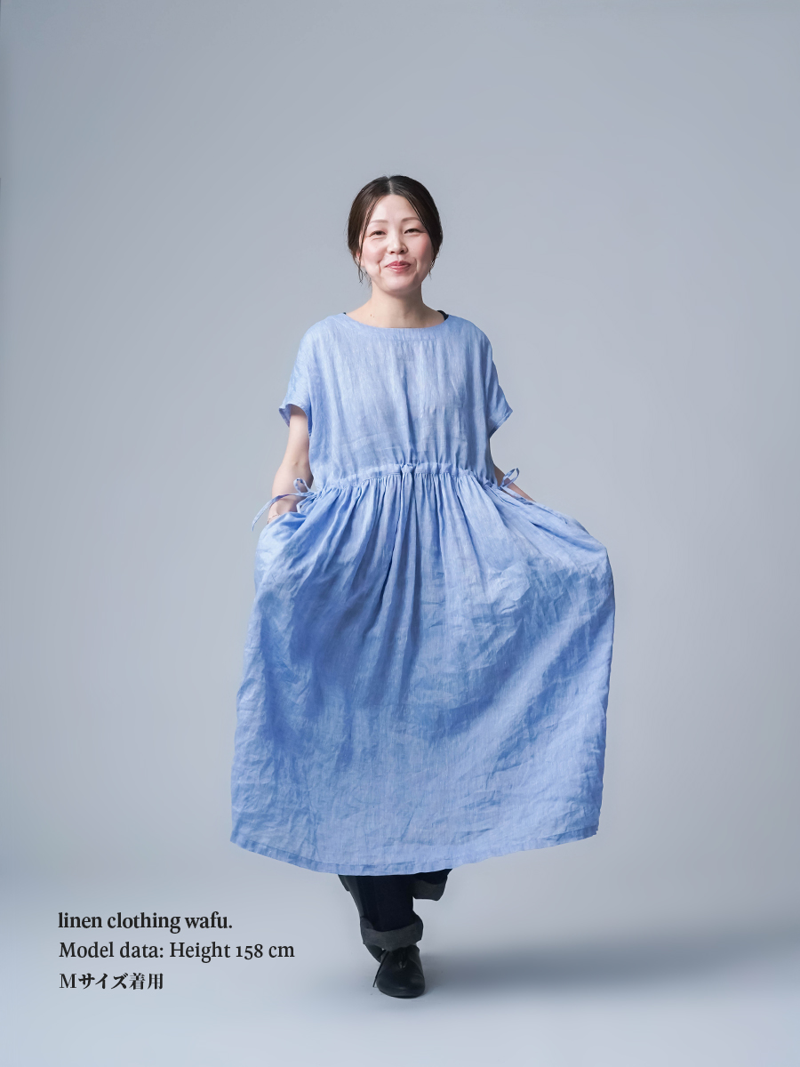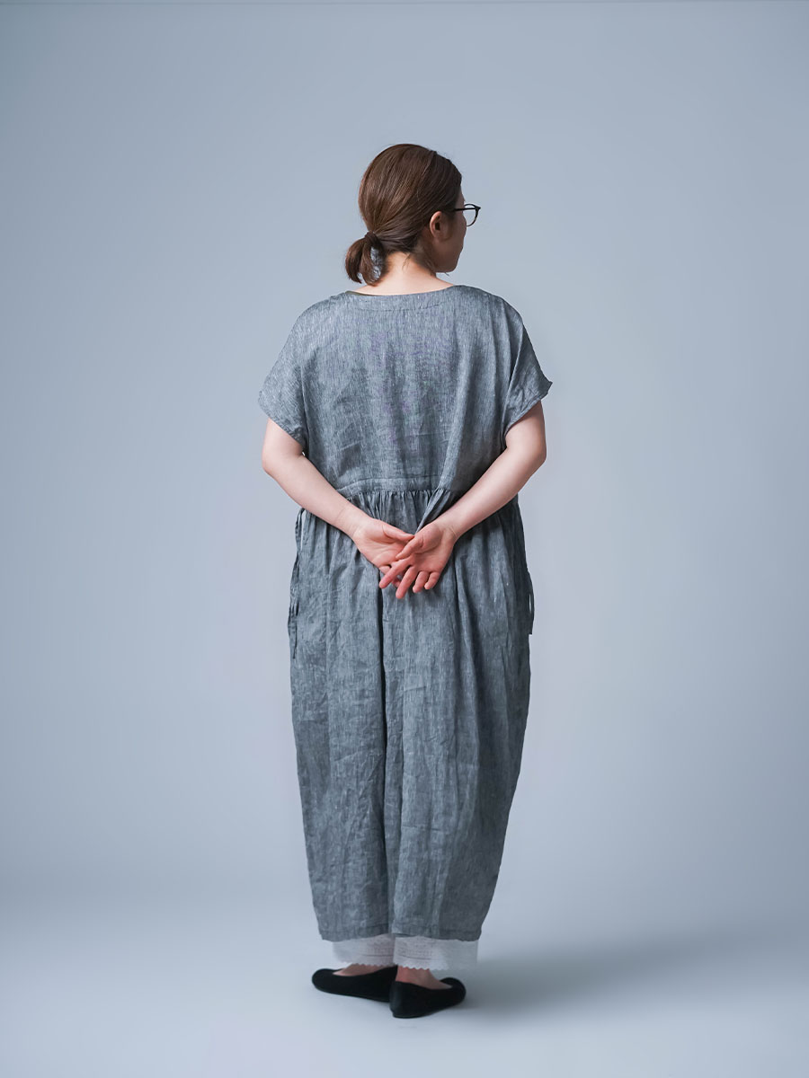 私はLサイズです。少し外に出ただけで、服の中を風がすっと通り抜けていく心地よさがあります。今年もやってくるあの猛暑に、もうこれ一枚で過ごしたいと思ったほどです。身幅はたっぷり、袖口も広め。肌に触れる部分が少ないから、暑い日もまとわりつかず、とにかく軽やかです。さらにウエストは紐でブラウジングができるので、その日の気分でシルエットの変化も楽しめます。着丈はくるぶしの5cm上ほど。軽やかさと上品さ、どちらも楽しめる一着です