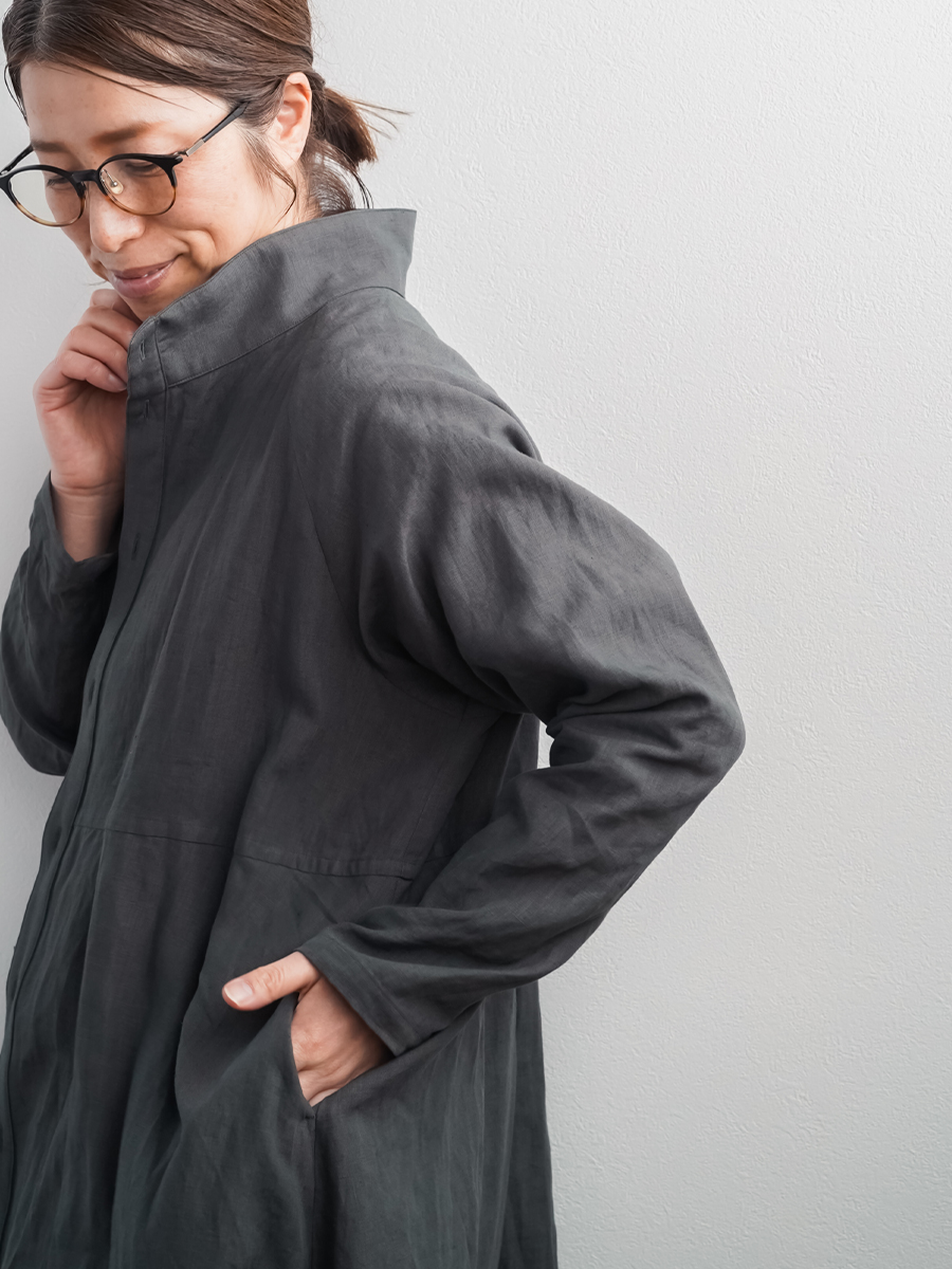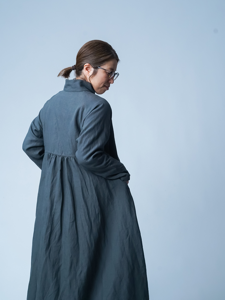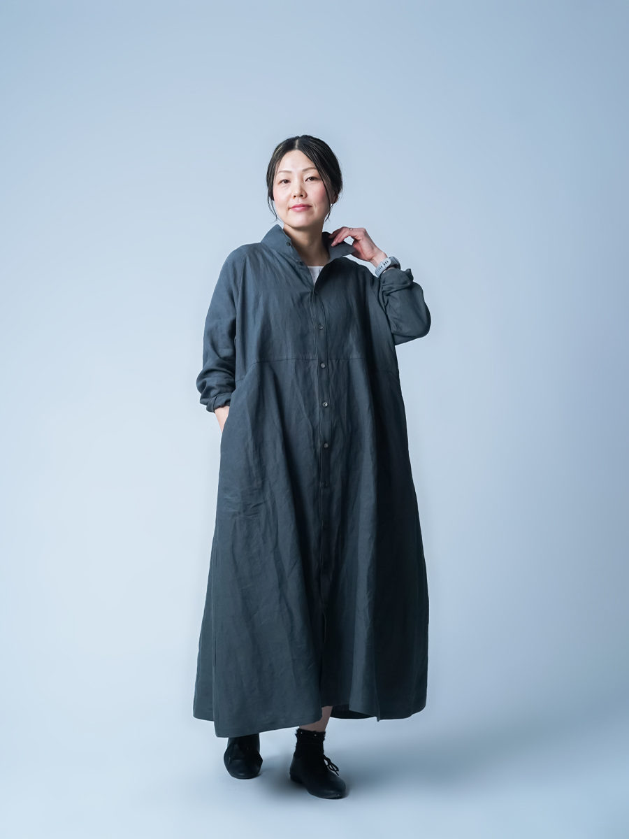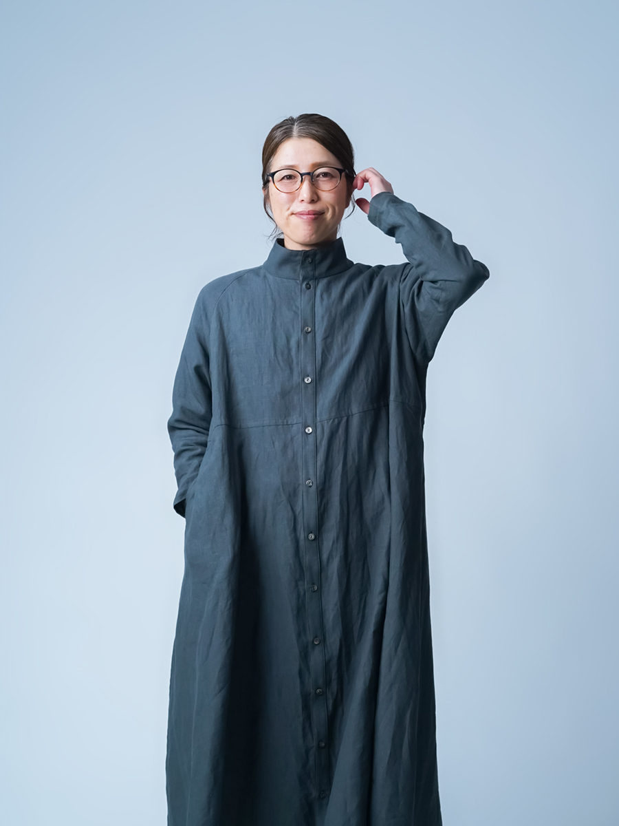 余計なものを削ぎ落とした、シンプルで男前なワンピース。とにかくカッコいいです。 身幅はあるのにスラっと見えて、まさに頑張ってないのに様になる作品。ワンピースとしてはもちろん、羽織ものとしても活躍すること間違いなしです。生地は高密度リネン。薄地なのに冷たい風をほどよくカットしてくれて、これはもうリネン界のウインドブレーカーって呼びたくなります。インナーを変えれば、長い季節楽しめるのも嬉しいポイント。着丈は膝下13cm、袖丈は手の甲が半分隠れるくらいです。
