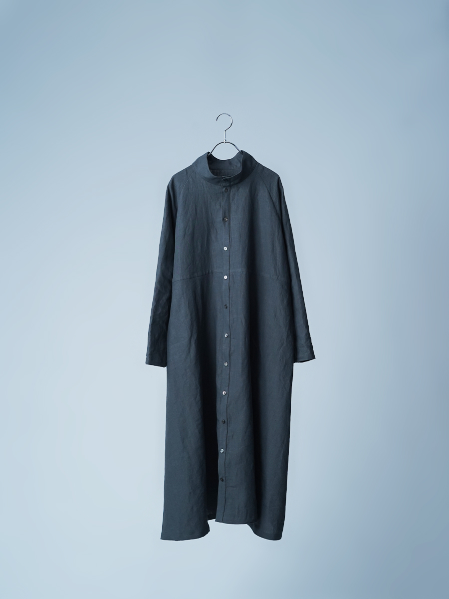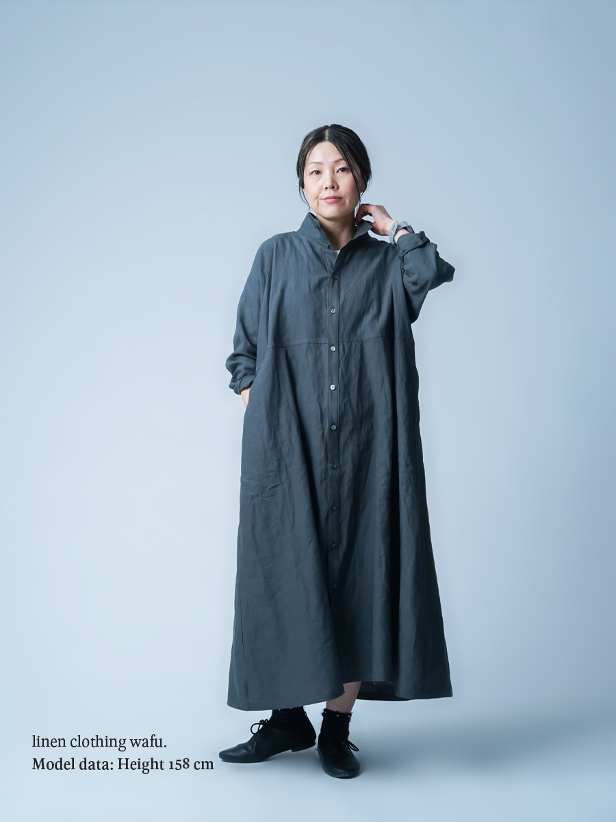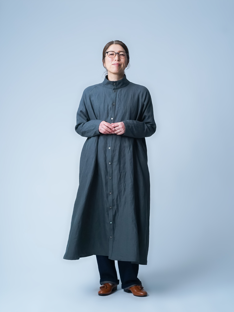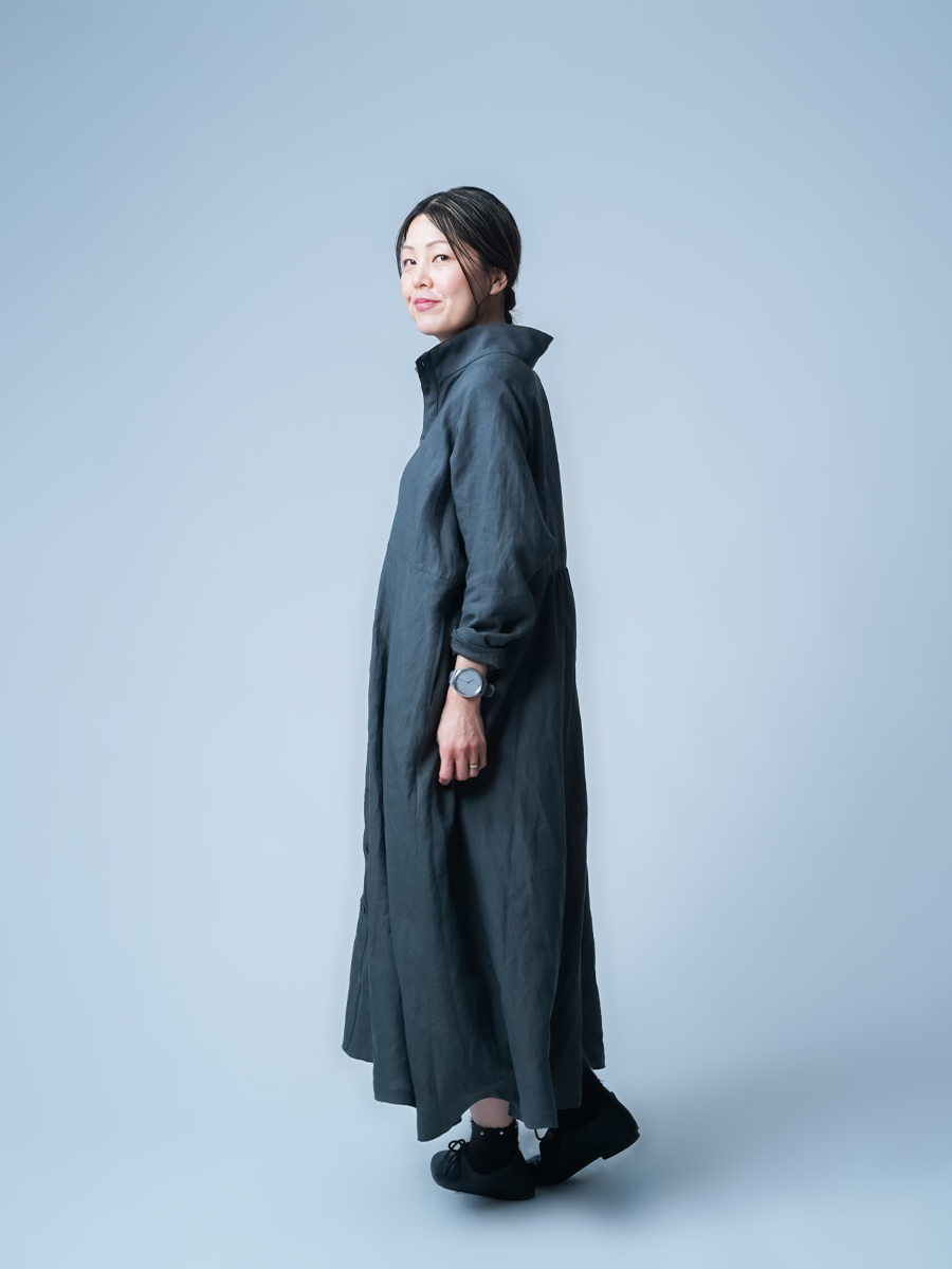 余計なものを削ぎ落とした、シンプルで男前なワンピース。とにかくカッコいいです。 身幅はあるのにスラっと見えて、まさに頑張ってないのに様になる作品。ワンピースとしてはもちろん、羽織ものとしても活躍すること間違いなしです。生地は高密度リネン。薄地なのに冷たい風をほどよくカットしてくれて、これはもうリネン界のウインドブレーカーって呼びたくなります。インナーを変えれば、長い季節楽しめるのも嬉しいポイント。着丈は膝下13cm、袖丈は手の甲が半分隠れるくらいです。