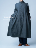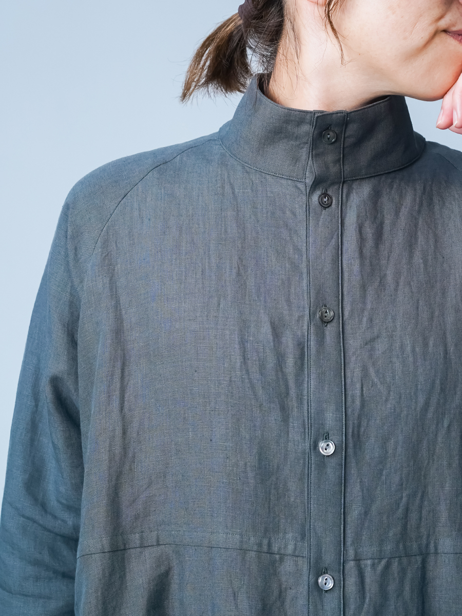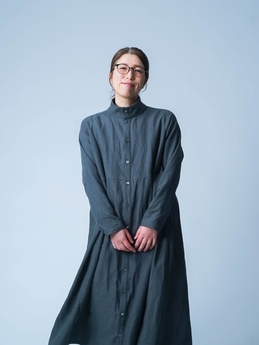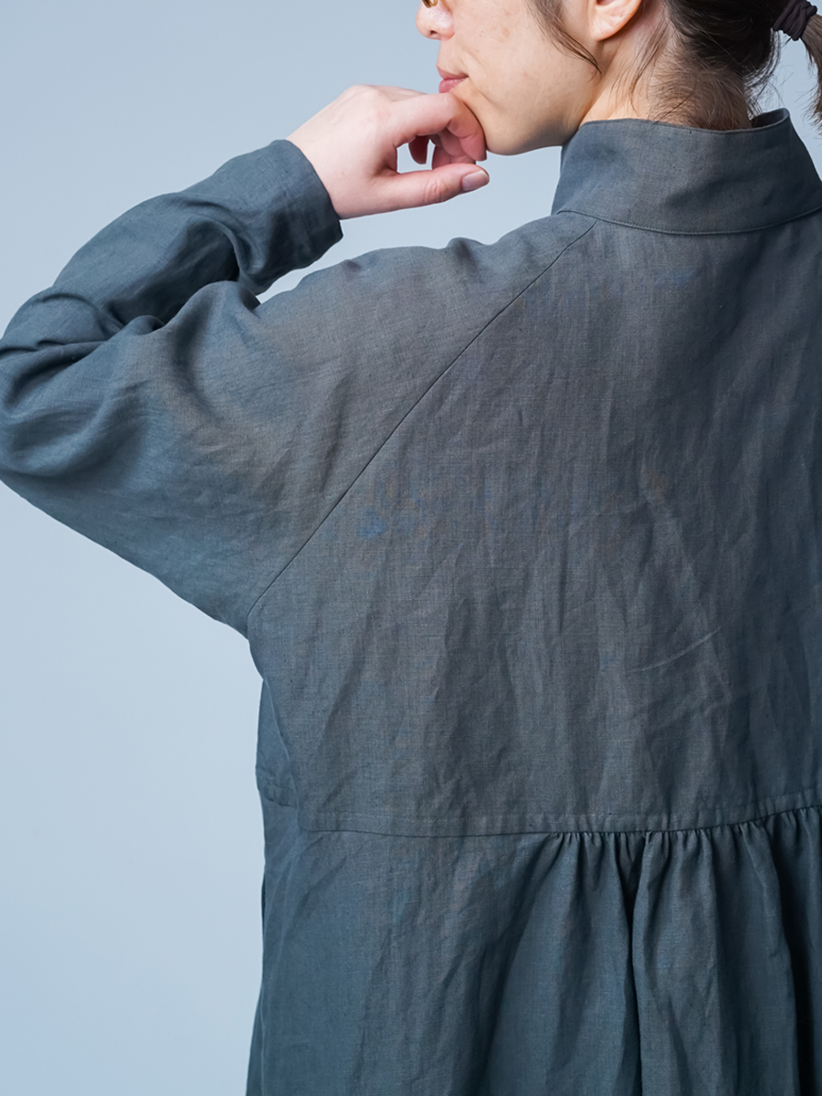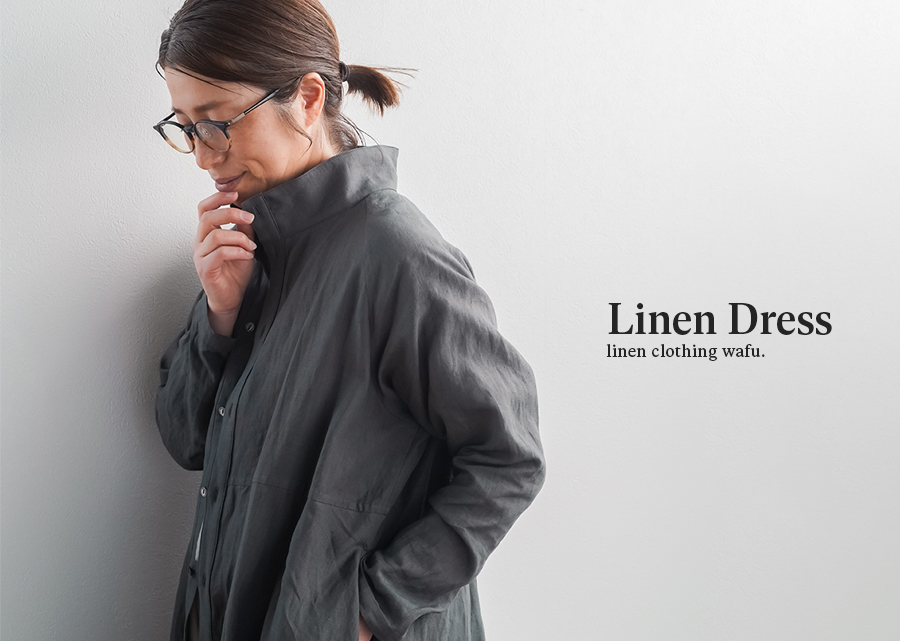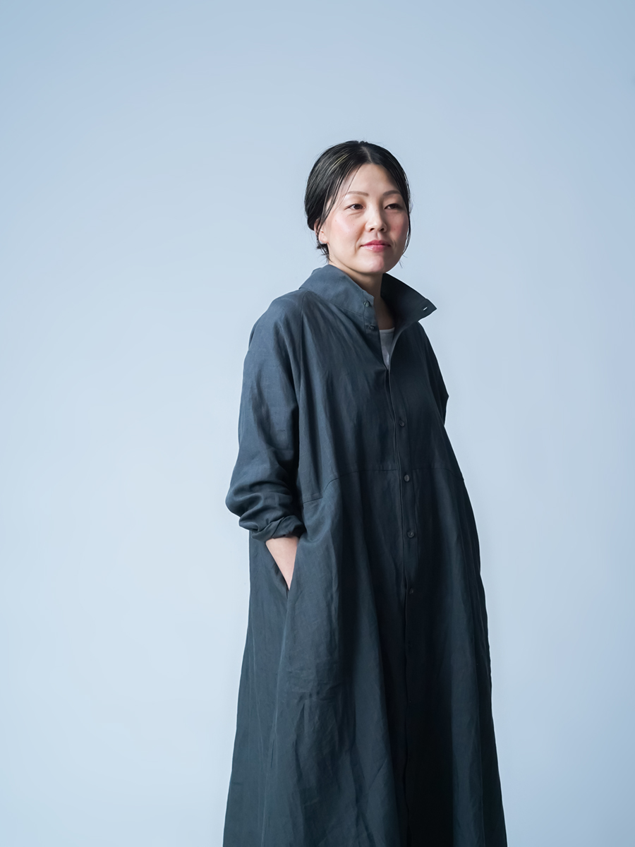 余計なものを削ぎ落とした、シンプルで男前なワンピース。とにかくカッコいいです。 身幅はあるのにスラっと見えて、まさに頑張ってないのに様になる作品。ワンピースとしてはもちろん、羽織ものとしても活躍すること間違いなしです。生地は高密度リネン。薄地なのに冷たい風をほどよくカットしてくれて、これはもうリネン界のウインドブレーカーって呼びたくなります。インナーを変えれば、長い季節楽しめるのも嬉しいポイント。着丈は膝下13cm、袖丈は手の甲が半分隠れるくらいです。