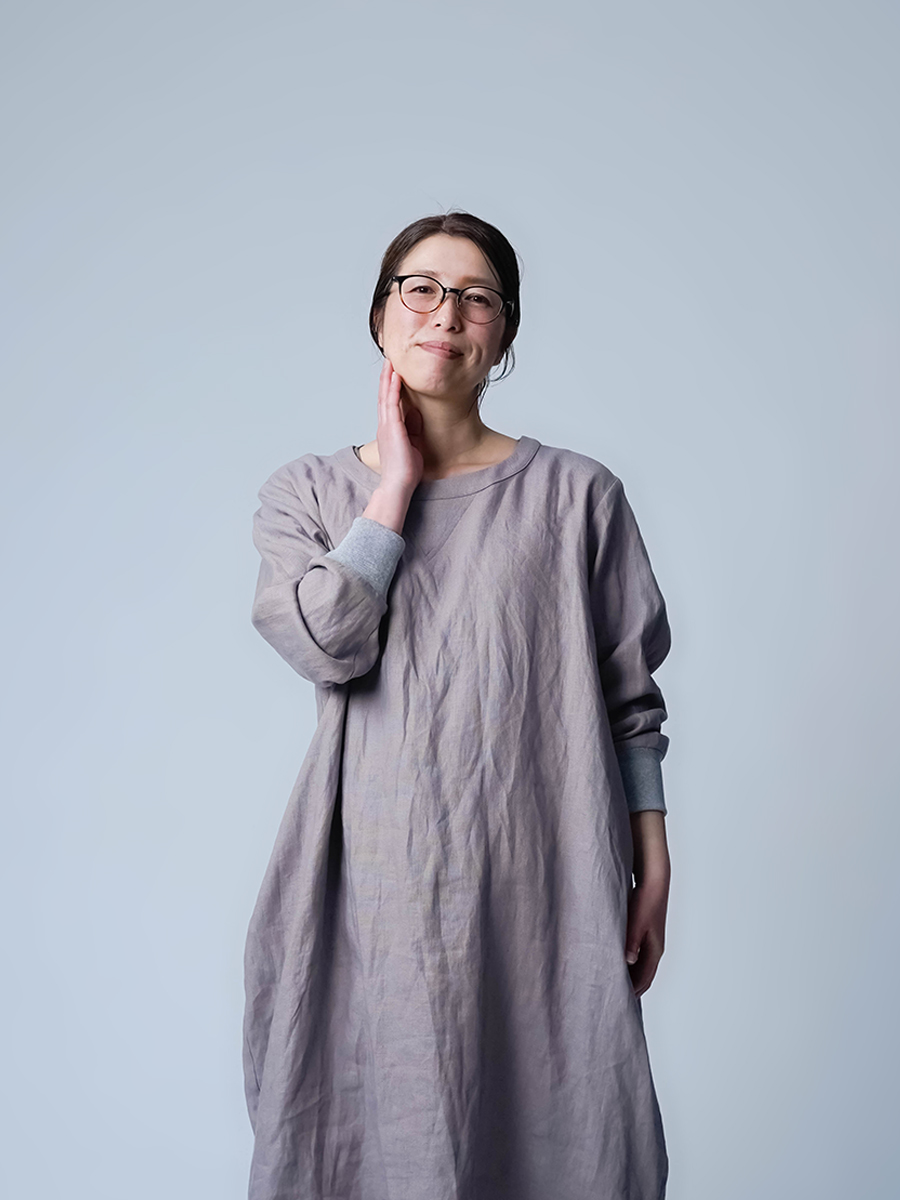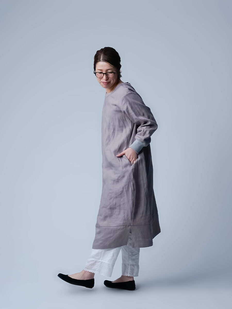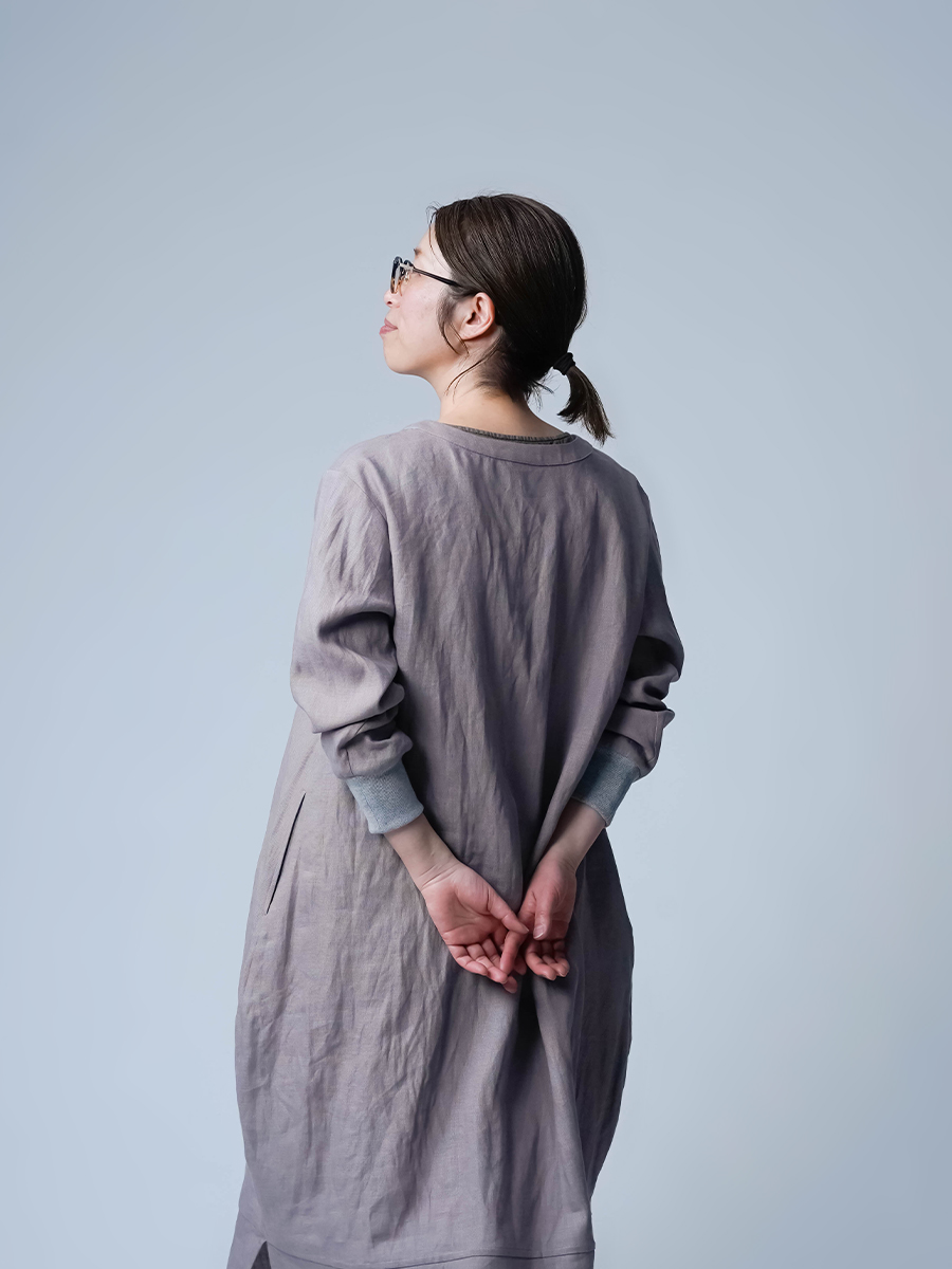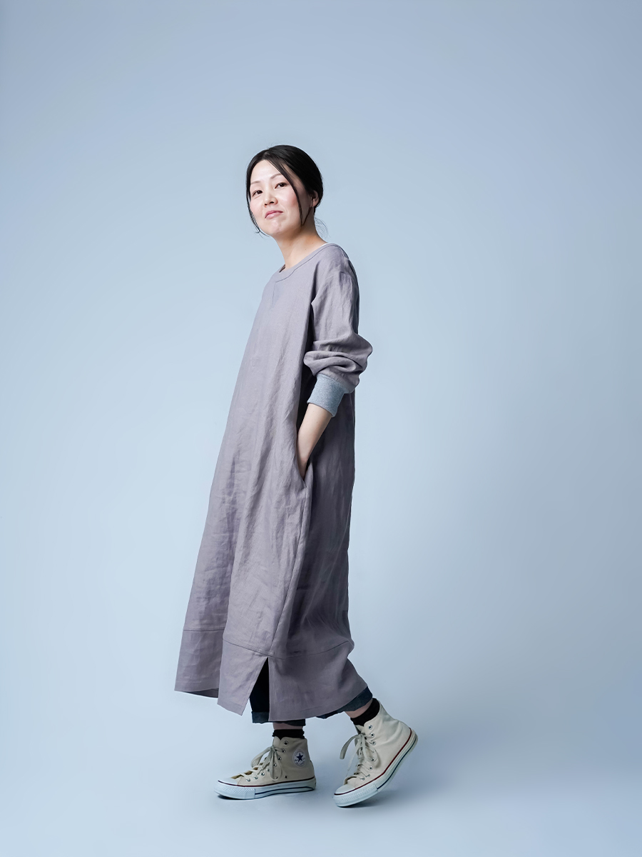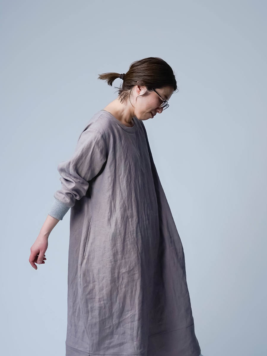 スウェット型なのに、コクーンの丸みがちゃんと立ってて、体のラインは拾わない。なのに不思議とモタつかないワンピースです。ストンと縦に落ちてくれて、横に広がりすぎないからスッキリ見えます。また裾の切り替えからスリットが入っていて、歩くたびにふわっと動きが出るのも動きが出るポイントです。ラクしたい気持ちとちゃんと見せたい気持ちを、両方叶えてくるので気負わずお家でも外出先でもリラックスして着られます。着丈は膝下12cm袖丈は手首。主役なのに気取らない、そして毎日働く。静かに沼らせてくる主役です。