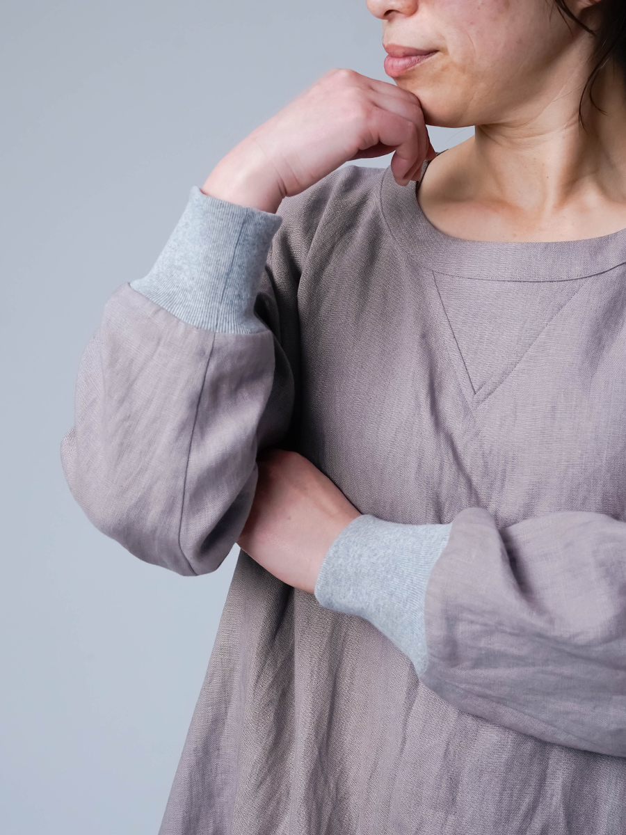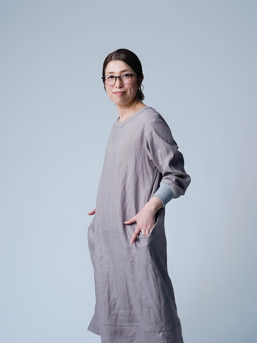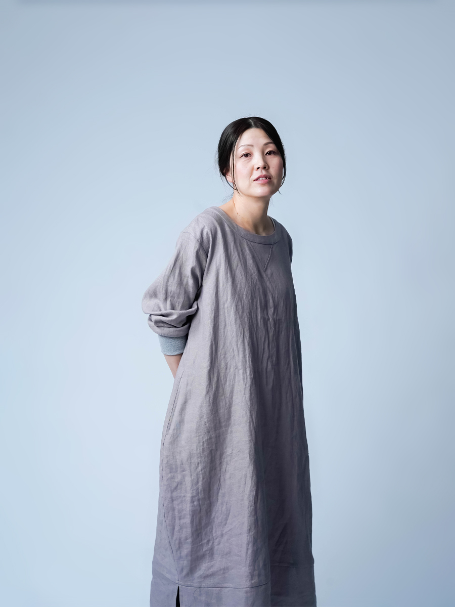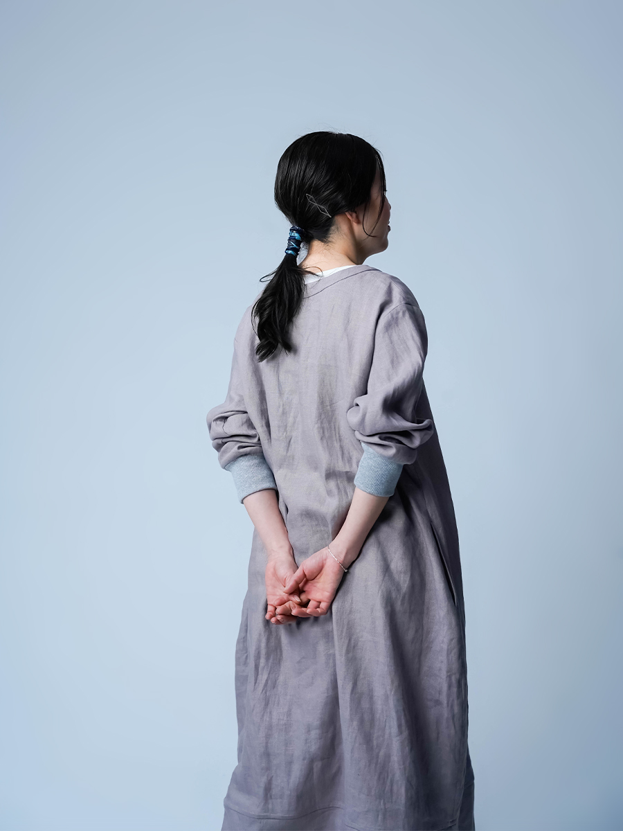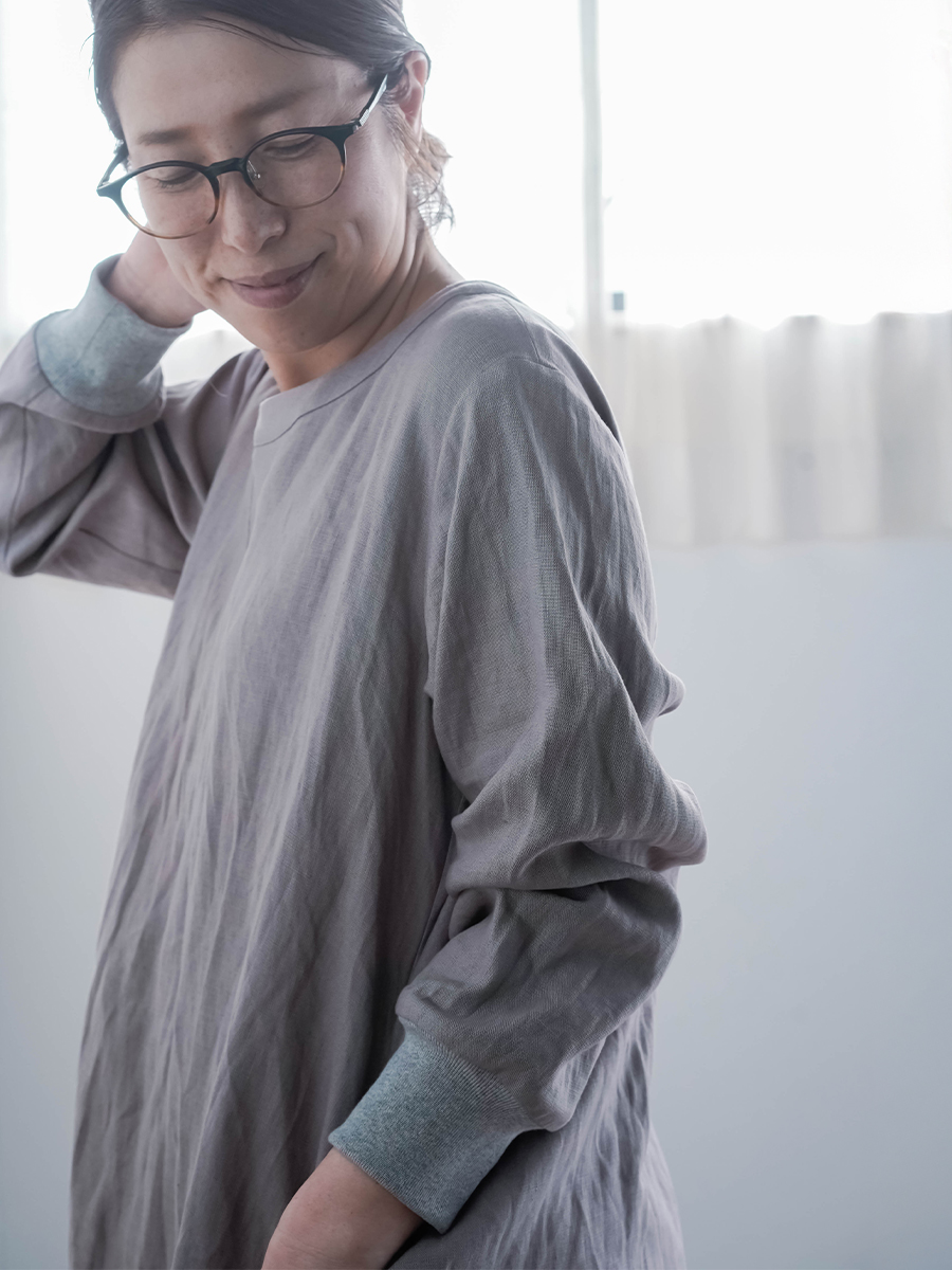 スウェット型なのに、コクーンの丸みがちゃんと立ってて、体のラインは拾わない。なのに不思議とモタつかないワンピースです。ストンと縦に落ちてくれて、横に広がりすぎないからスッキリ見えます。また裾の切り替えからスリットが入っていて、歩くたびにふわっと動きが出るのも動きが出るポイントです。ラクしたい気持ちとちゃんと見せたい気持ちを、両方叶えてくるので気負わずお家でも外出先でもリラックスして着られます。着丈は膝下12cm袖丈は手首。主役なのに気取らない、そして毎日働く。静かに沼らせてくる主役です。