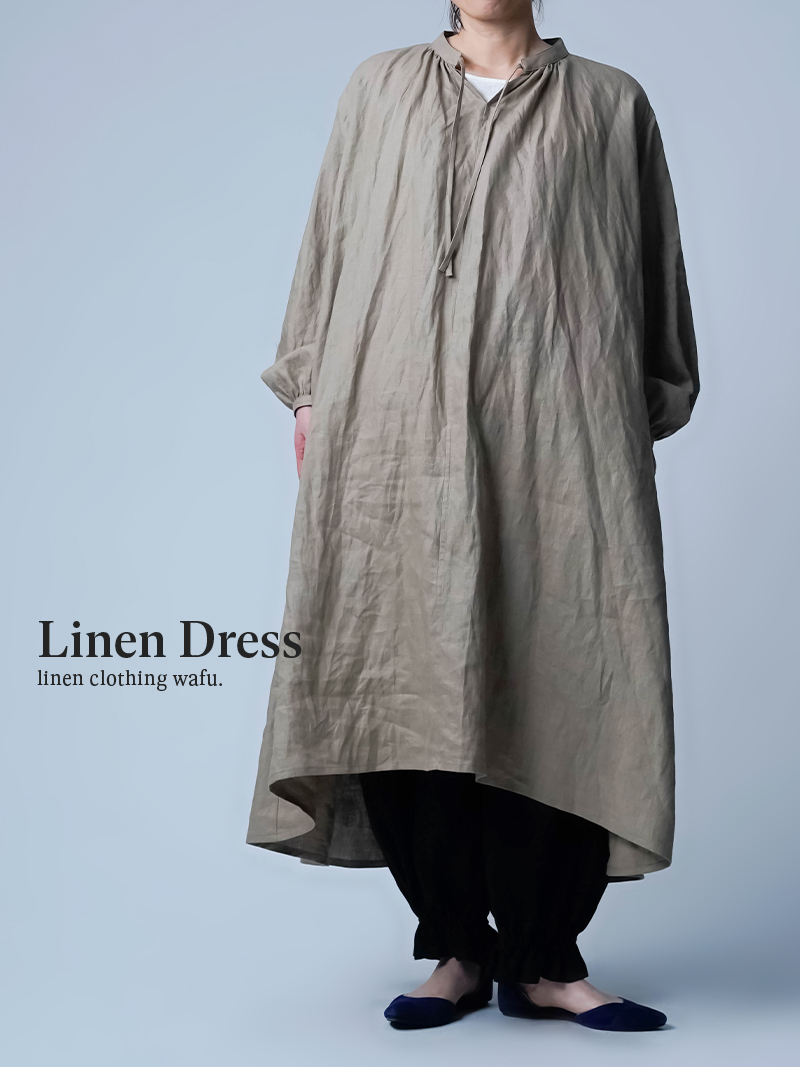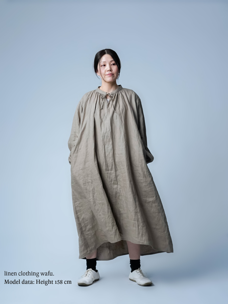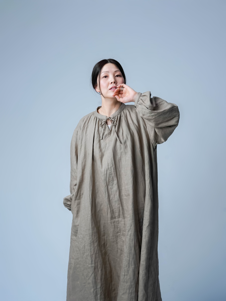 シワがより美しく見えるワンピです。前着丈はふくらはぎ半分くらい。後着丈は一番細い足首部分くらい。袖丈は手の甲が隠れるくらいです。紐がついたスキッパーデザイン。私は結んだリボンを手でぎゅっと絞る感じでしたに垂らすようにするのが好きです。甘くなりすぎずでも可愛らしい雰囲気に仕上がりどことなくアンティークな雰囲気がとても好きなんです。