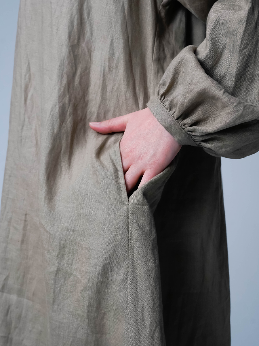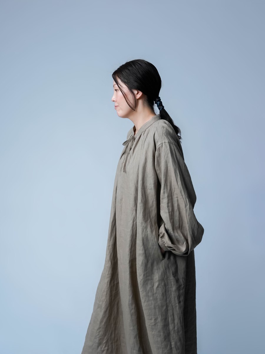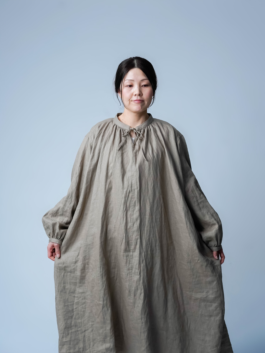 シワがより美しく見えるワンピです。前着丈はふくらはぎ半分くらい。後着丈は一番細い足首部分くらい。袖丈は手の甲が隠れるくらいです。紐がついたスキッパーデザイン。私は結んだリボンを手でぎゅっと絞る感じでしたに垂らすようにするのが好きです。甘くなりすぎずでも可愛らしい雰囲気に仕上がりどことなくアンティークな雰囲気がとても好きなんです。