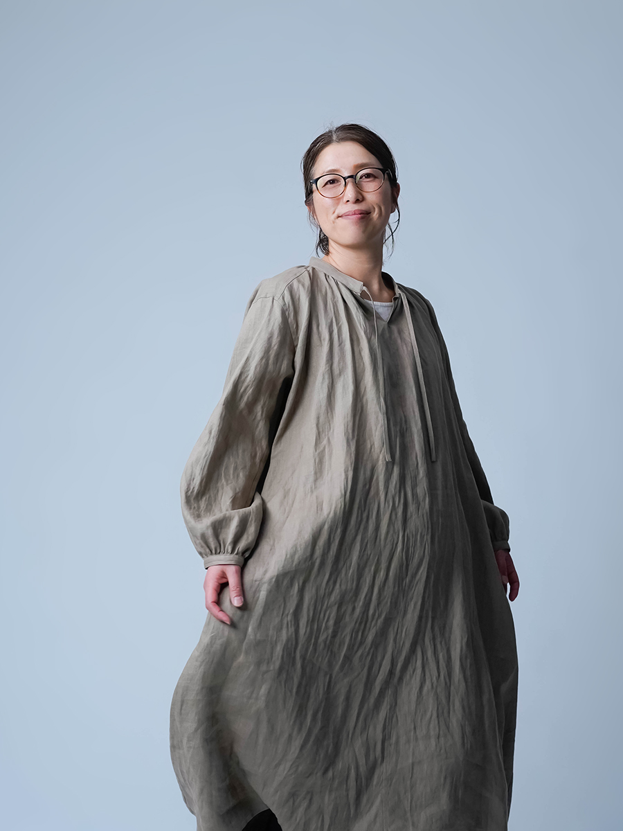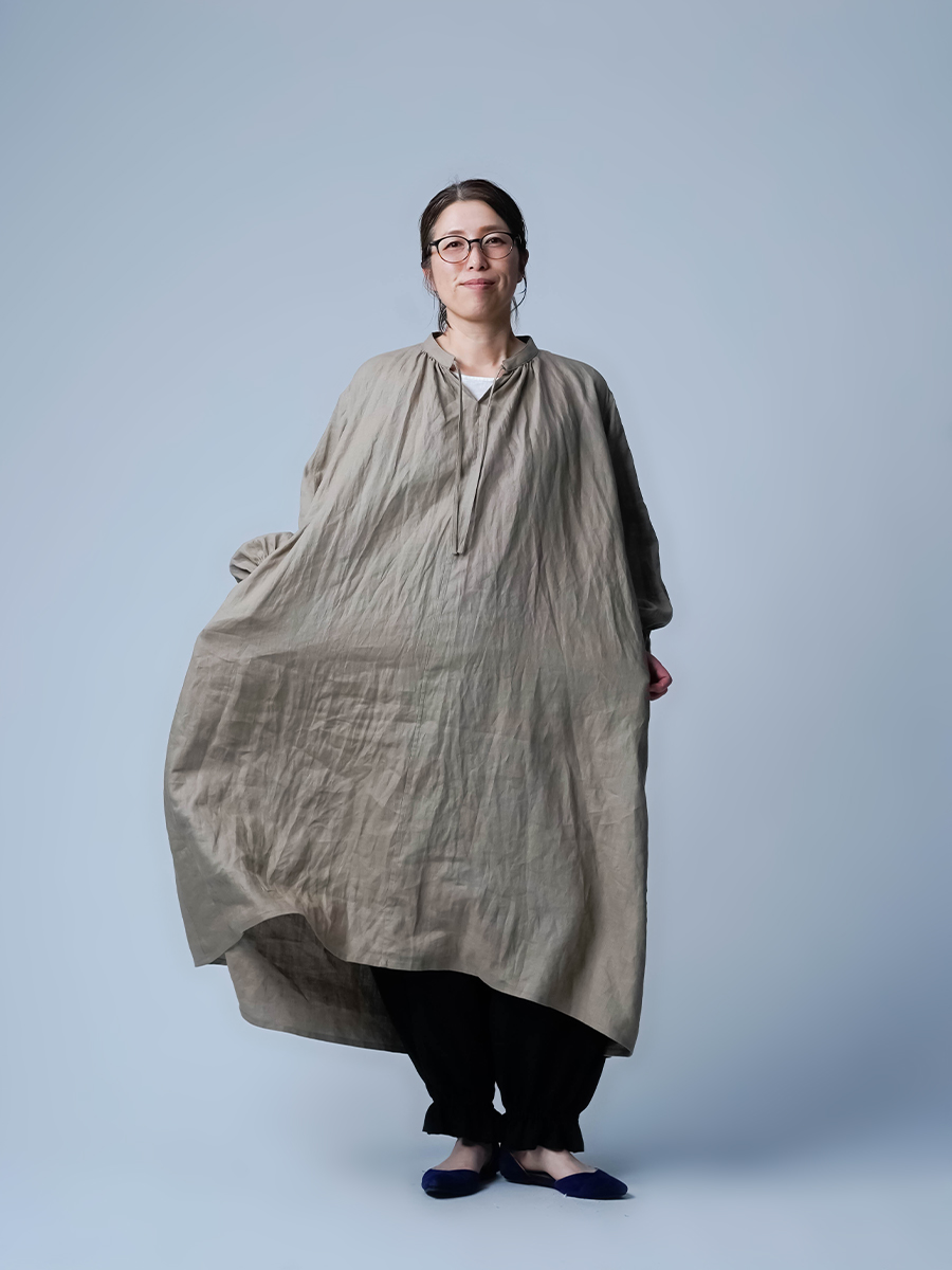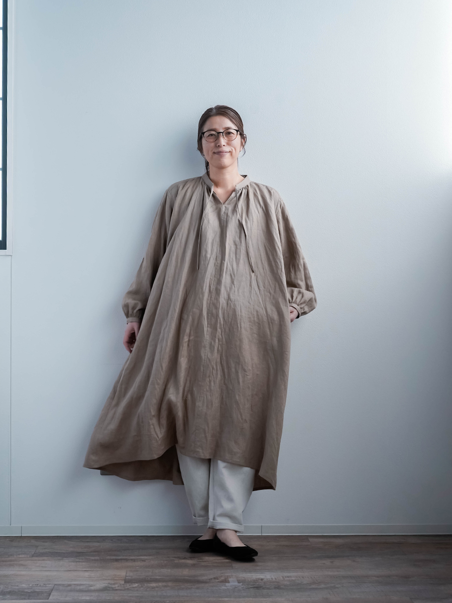 ズボラ組合の、ありがとワンピ。締めつけゼロ、悩んだ朝ほどこれ一択です。身幅がたっぷりしているので体のラインを拾わない。なのに、もたつかない。このバランスがほんとに絶妙です。首元のギャザーの分量がちょうど良く、着ると顔まわりに陰影をプラスされてアクセサリーなしでもお気持ちが整います。着丈は前後で約10cm差、低身長さんでも高身長さんでもバランスが取りやすい丈感だと思います。パンツとの組み合わせも、これまたカッコいいですよ。前着丈は膝下10cm後ろ着丈は踝10cm上。