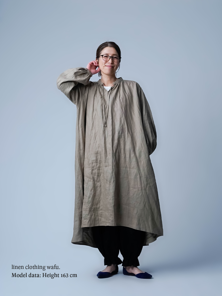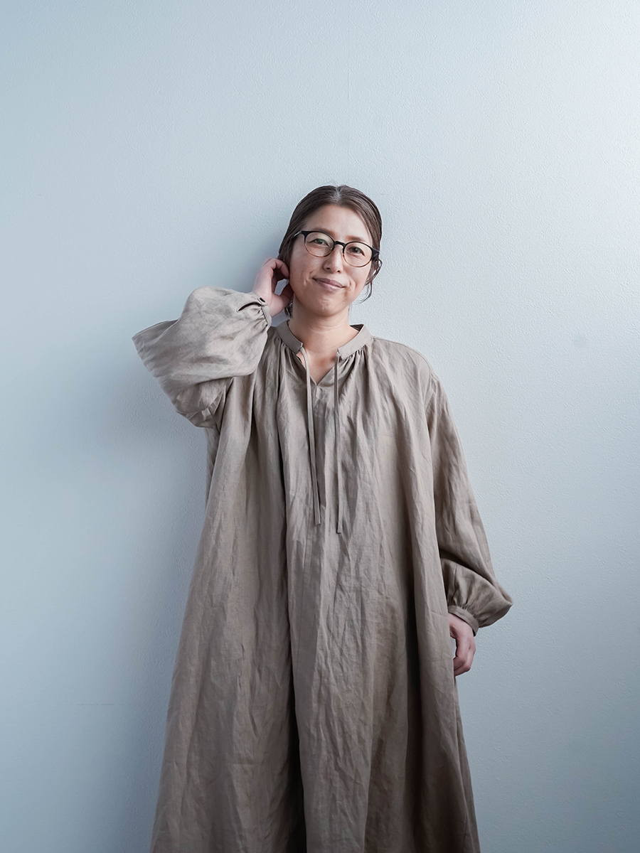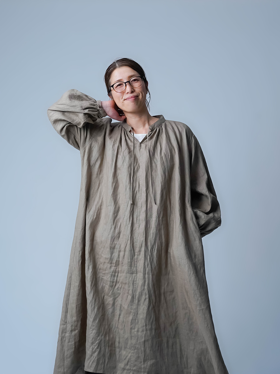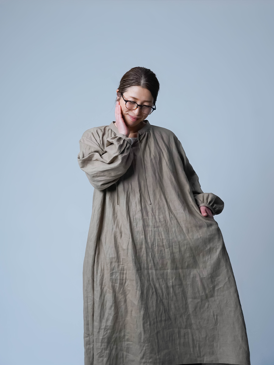 ズボラ組合の、ありがとワンピ。締めつけゼロ、悩んだ朝ほどこれ一択です。身幅がたっぷりしているので体のラインを拾わない。なのに、もたつかない。このバランスがほんとに絶妙です。首元のギャザーの分量がちょうど良く、着ると顔まわりに陰影をプラスされてアクセサリーなしでもお気持ちが整います。着丈は前後で約10cm差、低身長さんでも高身長さんでもバランスが取りやすい丈感だと思います。パンツとの組み合わせも、これまたカッコいいですよ。前着丈は膝下10cm後ろ着丈は踝10cm上。