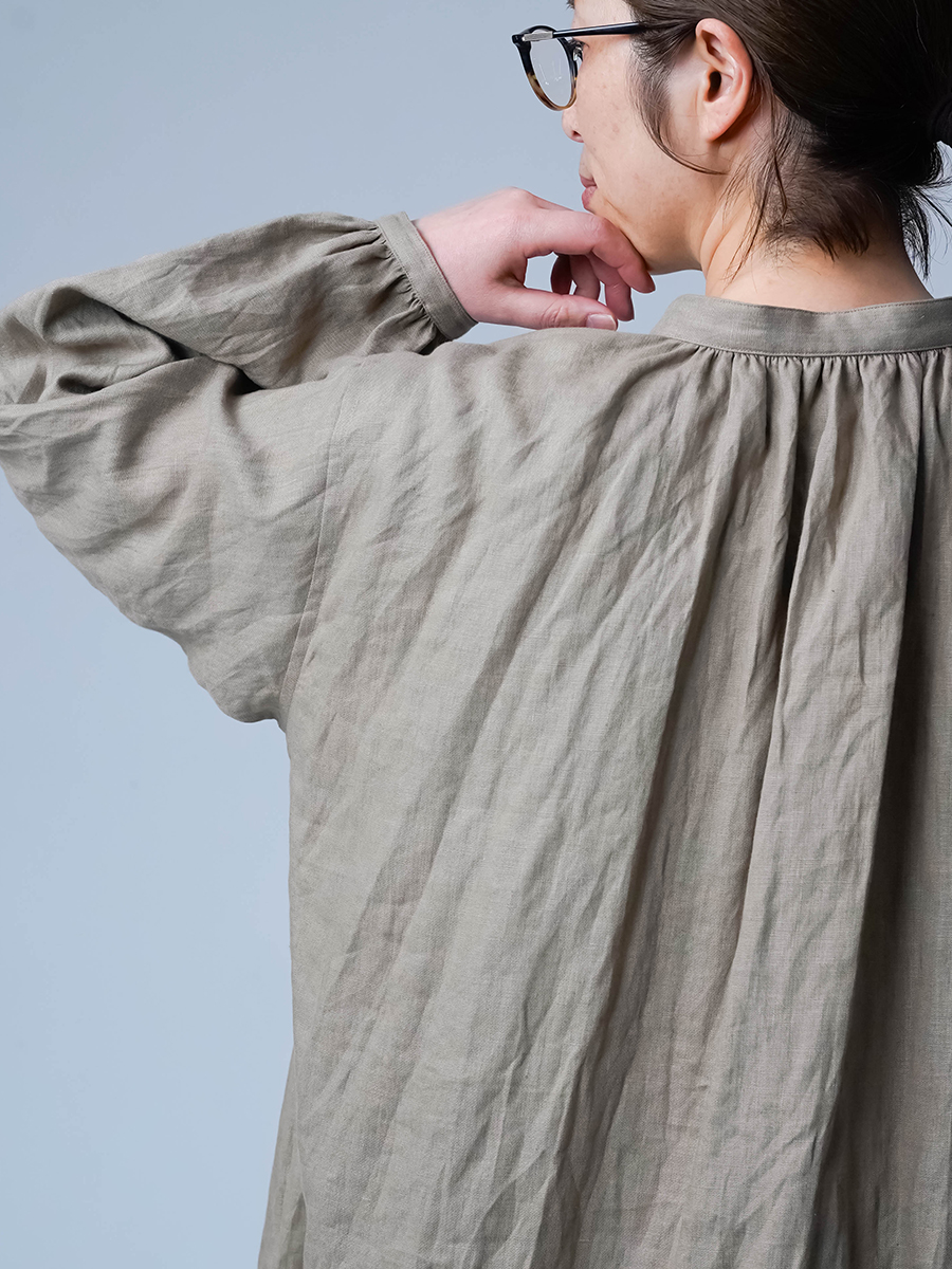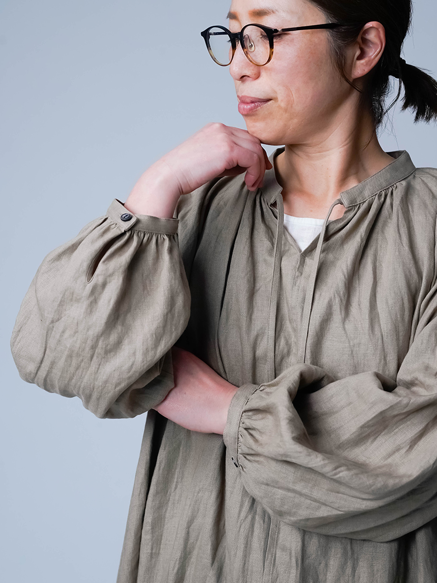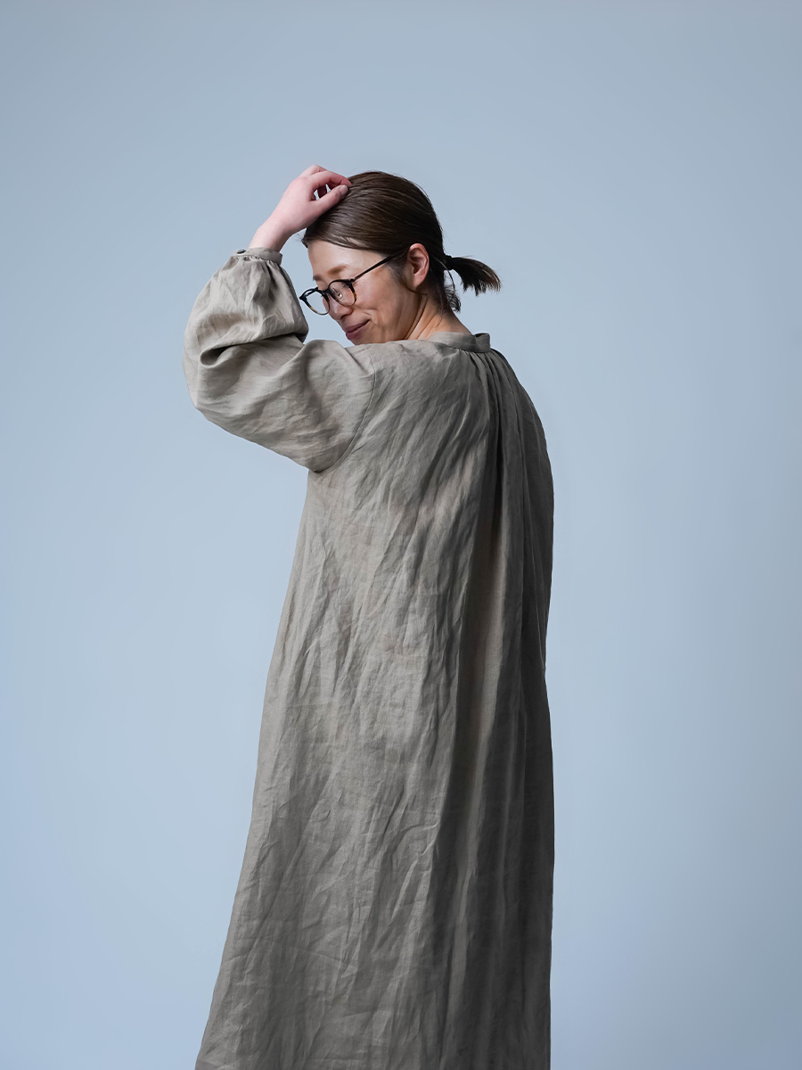 前と後ろで表情を変える、魅力的なワンピース。襟の立ち方がほどよく、顔まわりはさみしくならずに華やか。手首のふくらみもほどよく、着心地のよさも抜かりなしです。前からは、裾に向かって広がるデザインで足元の動きが軽やかに。でも私が本当に好きなのは後ろ姿。首元から入ったギャザーが肩回りをカバーし、ストンと落ちるシルエットが、まるで後ろ姿まで計算されているかのように美しいのです。