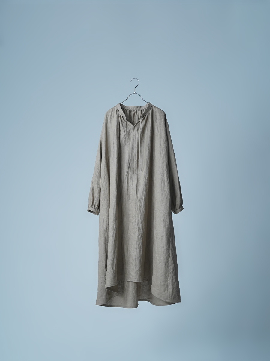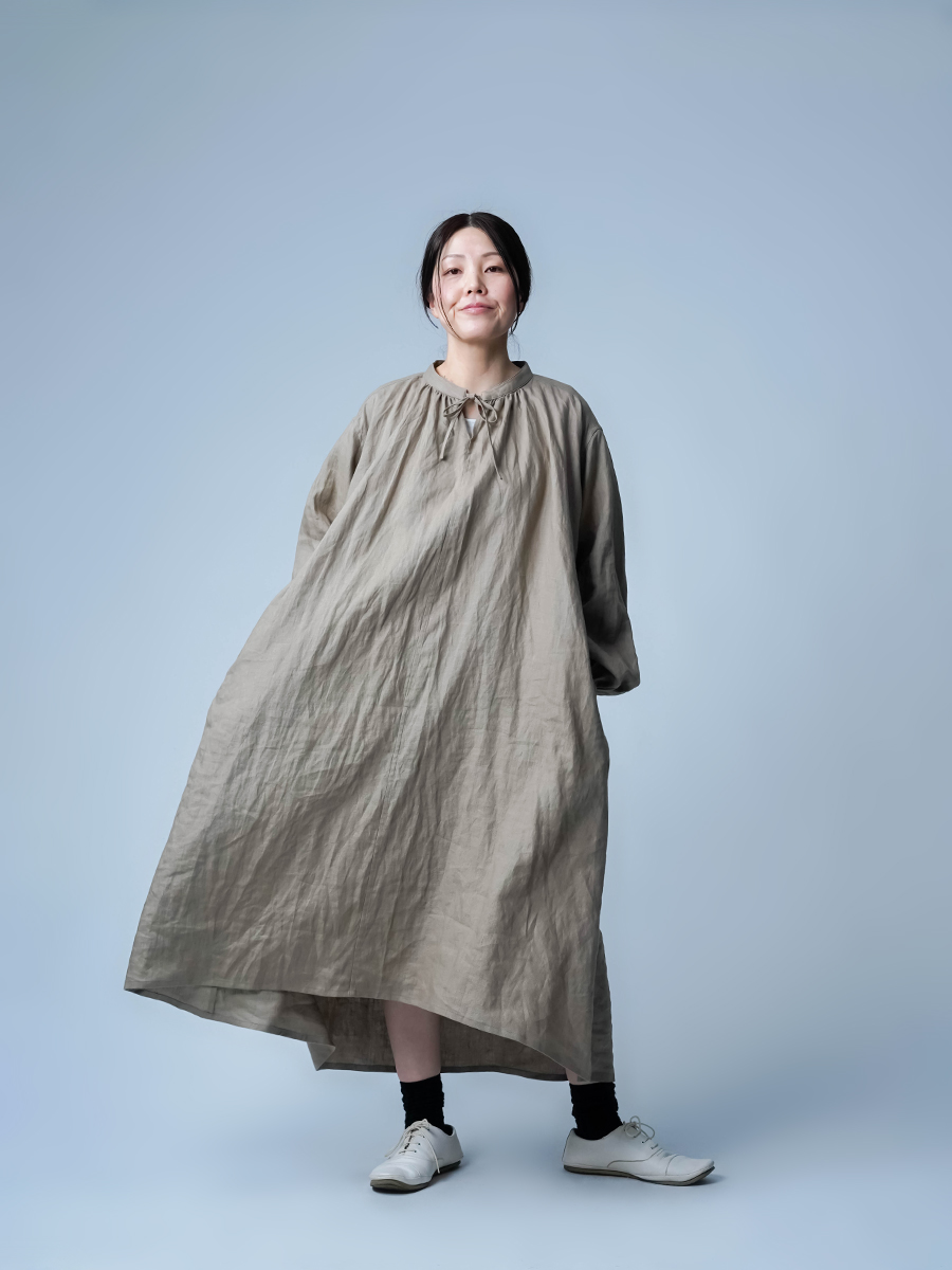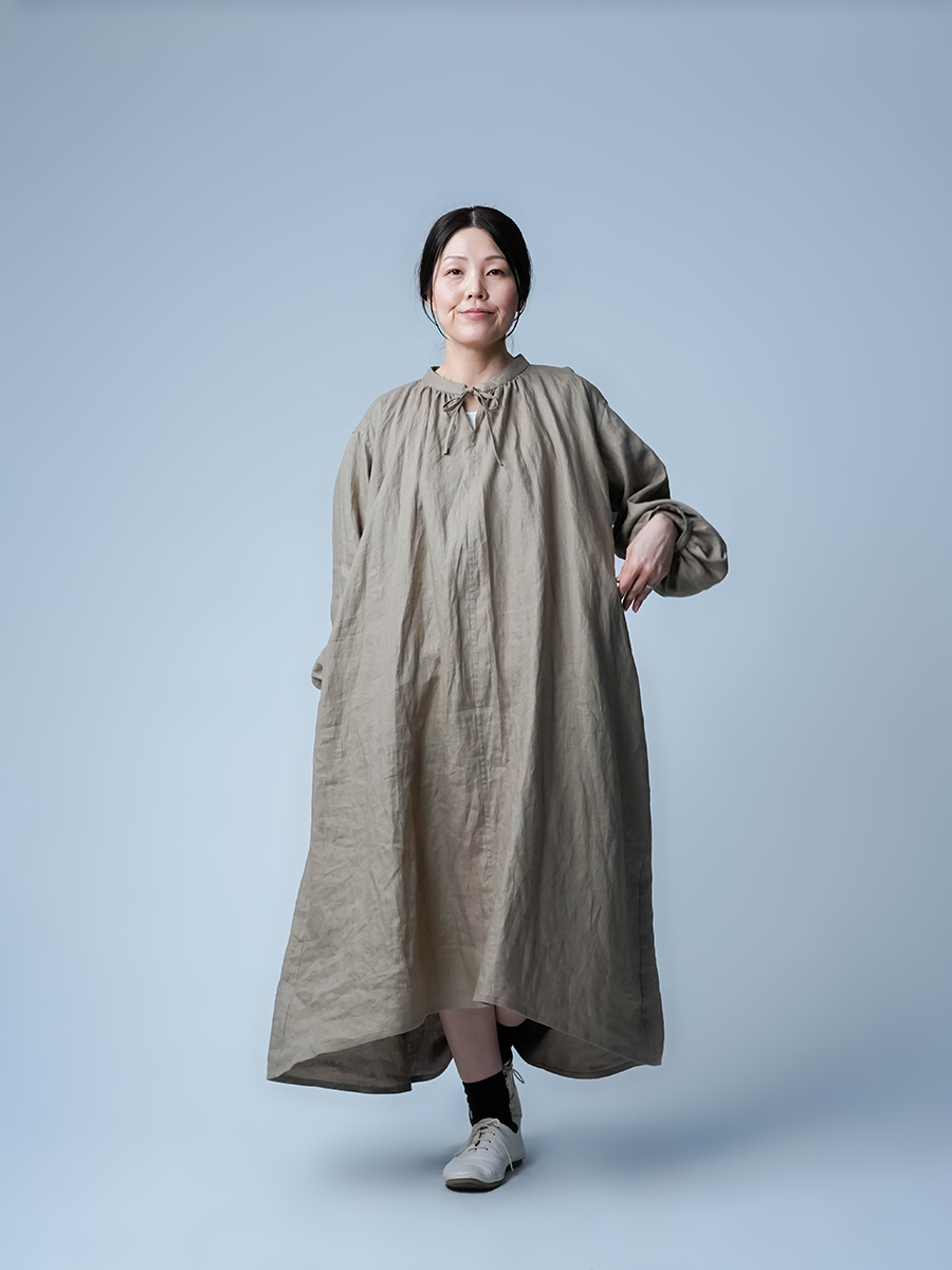 動きに表情が生まれるワンピース。裾の前後差が、歩くたびにひらひらと揺れて、思わずスキップしたくなるような軽やかさ。胸元のギャザーが自然に視線を上に集め、華奢に見せてくれるのが嬉しいポイントです。着丈はマキシ丈で、床から前丈は約25cm、後ろ丈は約10cmほど。袖丈は手の甲が隠れるくらいです。一枚でさらっと着ても、重ね着しても様になるワンピースです。