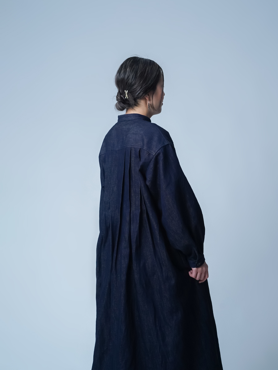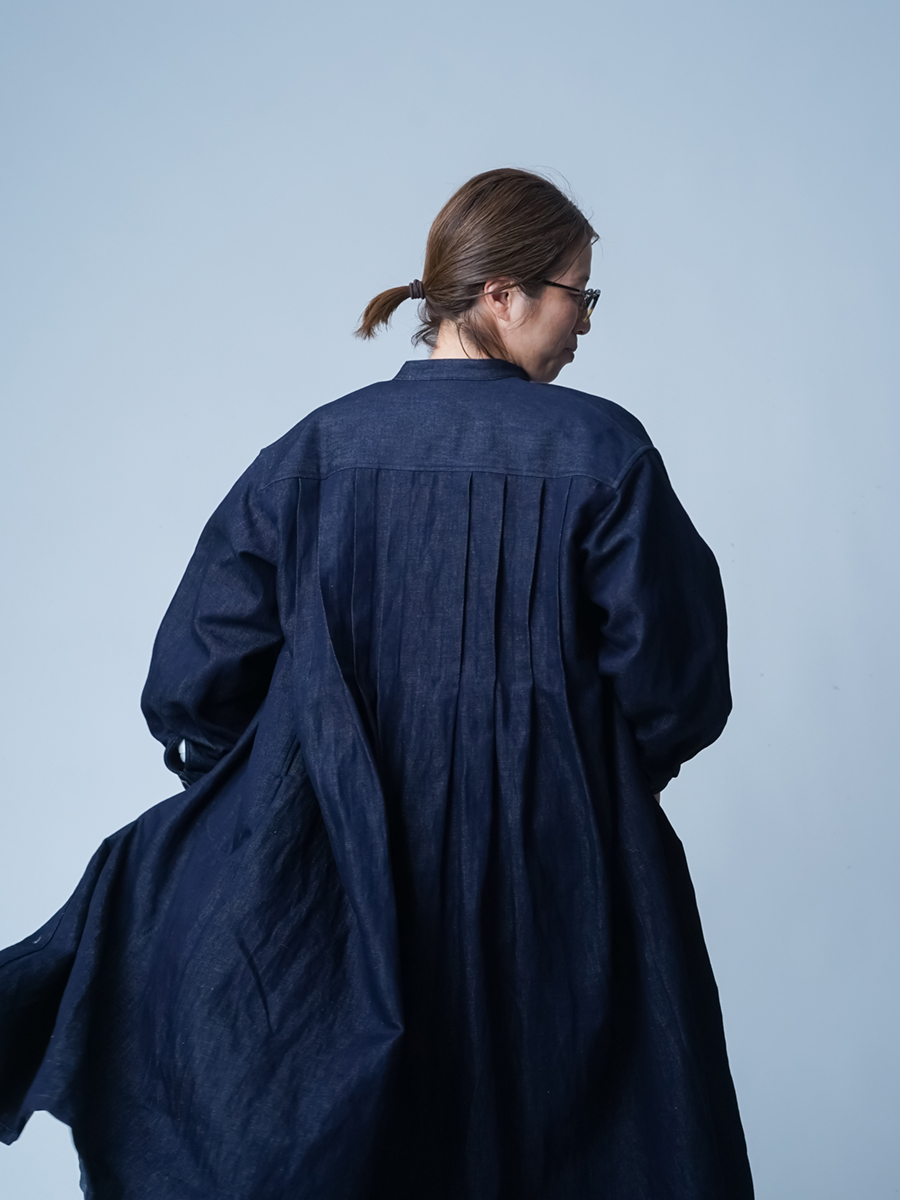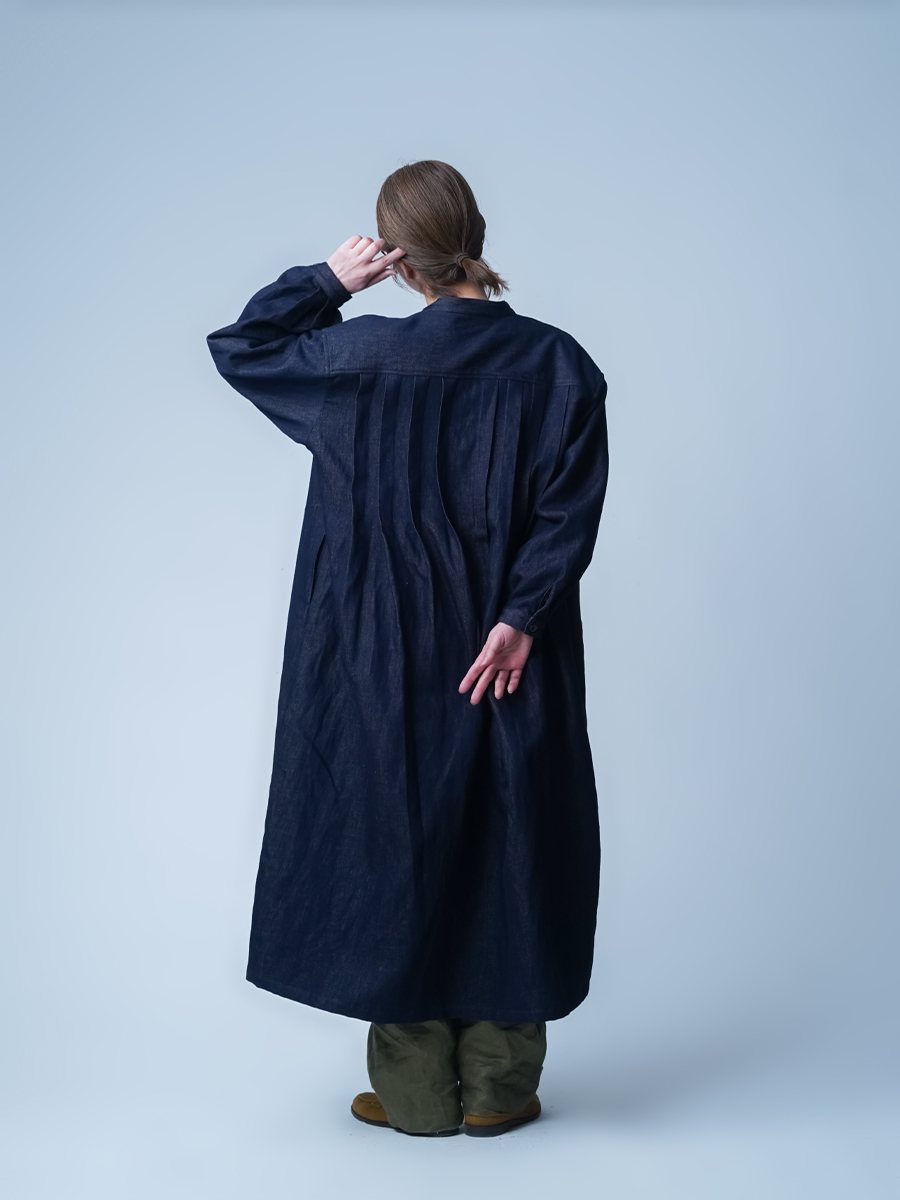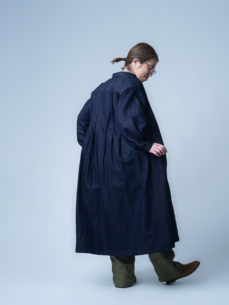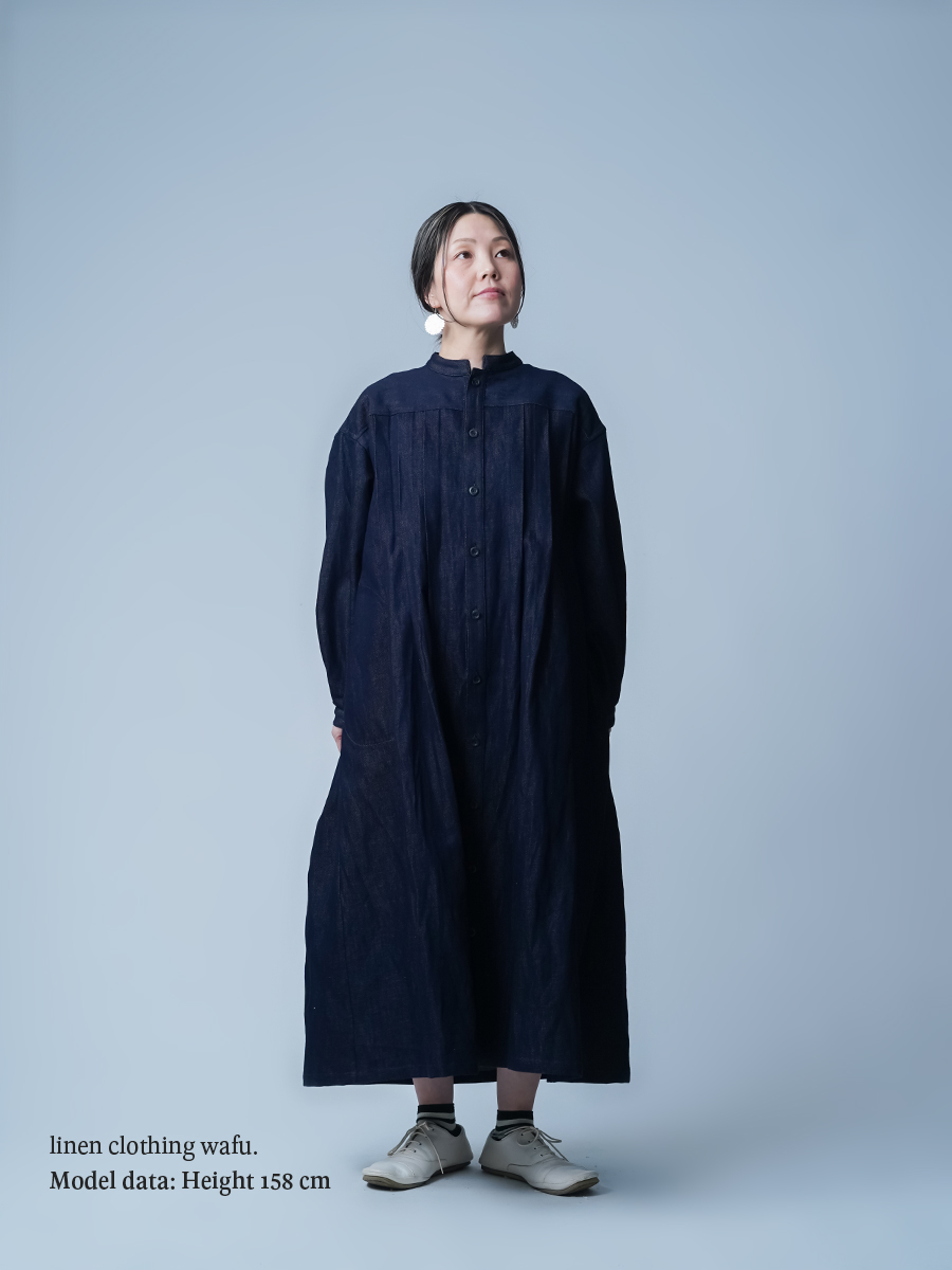 こんなにたっぷりタックがデザインされているのにとても軽いです。着丈はくるぶしから8センチほど上くらい。袖丈は手の甲が隠れるくらい。これくらい太いピンタックはwafu.初。デニムの生地なのでしっかりとしたタックにすることで縦ラインをしっかり強調してくれ、育ったときにとてもかっこよくなりそうな予感がします!