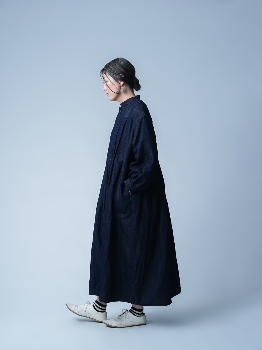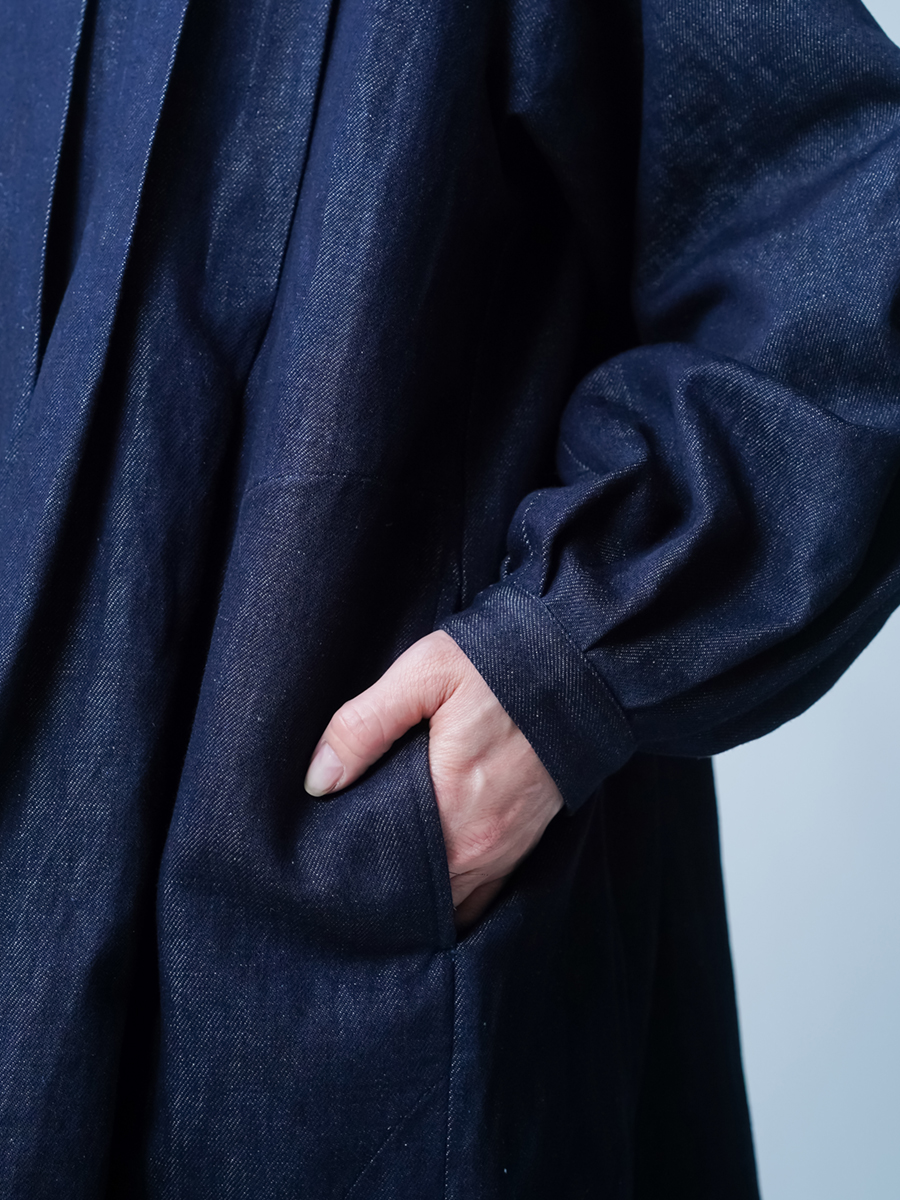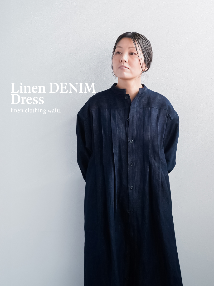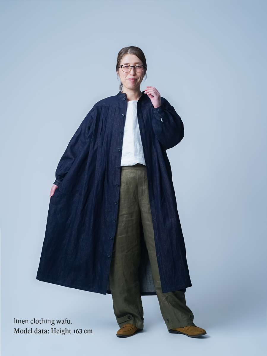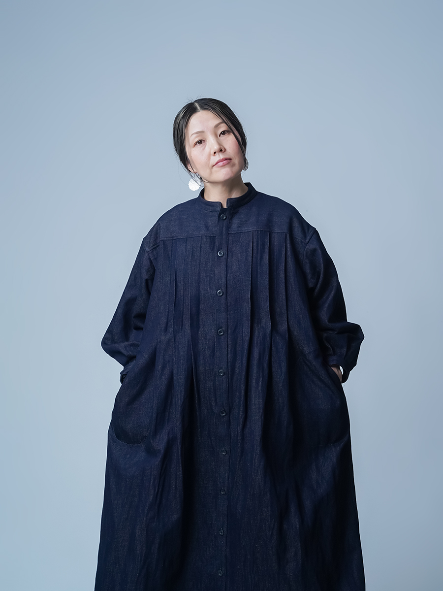 こんなにたっぷりタックがデザインされているのにとても軽いです。着丈はくるぶしから8センチほど上くらい。袖丈は手の甲が隠れるくらい。これくらい太いピンタックはwafu.初。デニムの生地なのでしっかりとしたタックにすることで縦ラインをしっかり強調してくれ、育ったときにとてもかっこよくなりそうな予感がします!