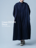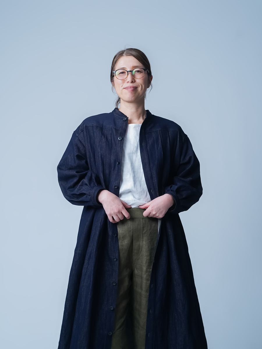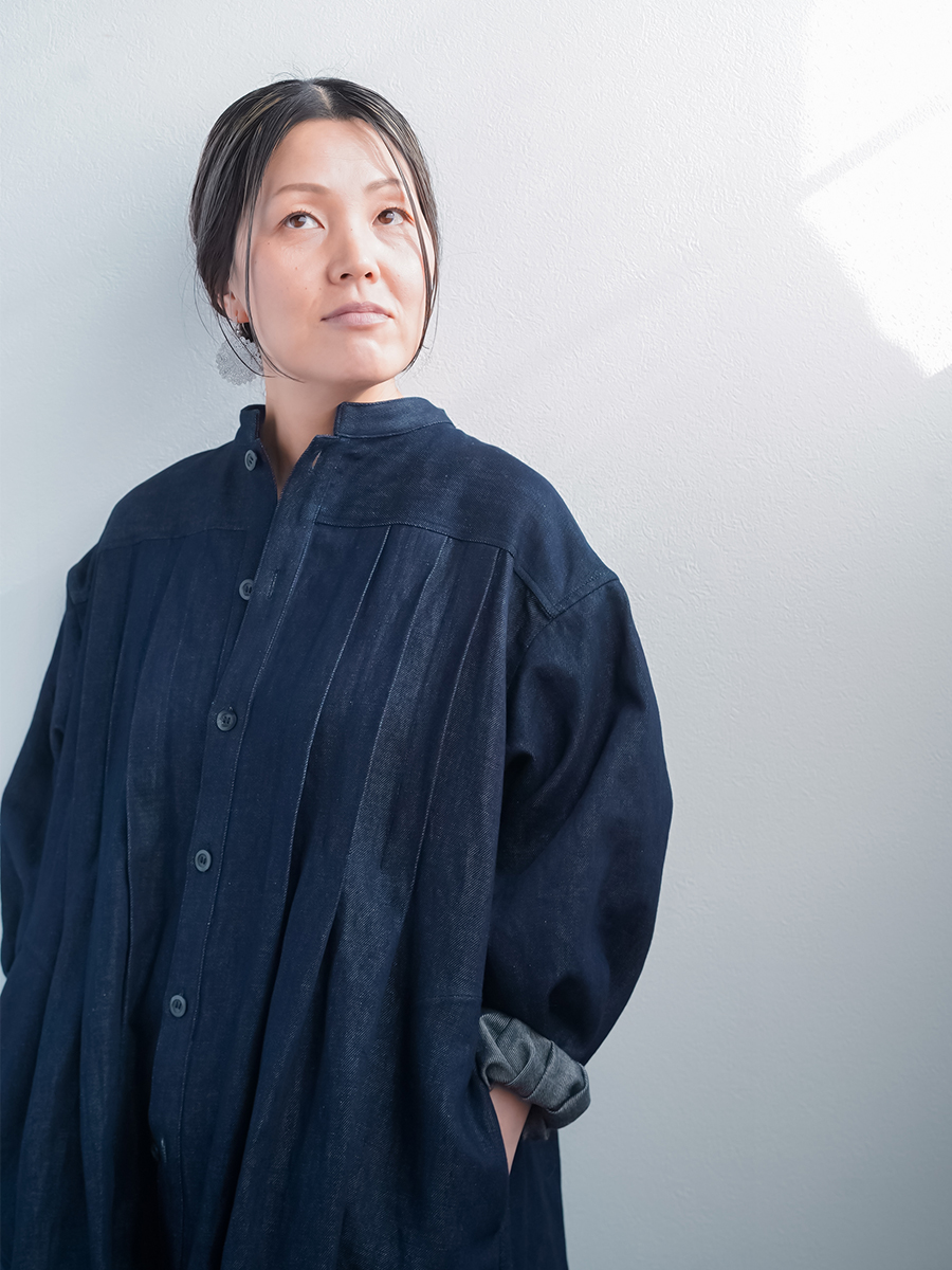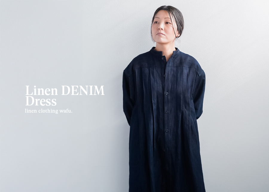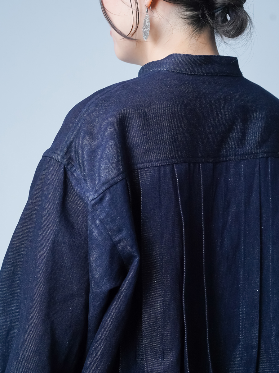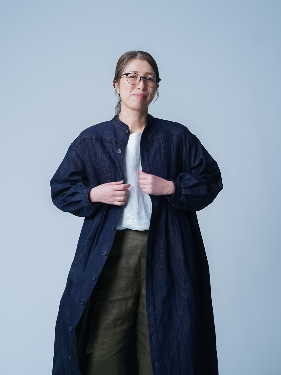こんなにたっぷりタックがデザインされているのにとても軽いです。着丈はくるぶしから8センチほど上くらい。袖丈は手の甲が隠れるくらい。これくらい太いピンタックはwafu.初。デニムの生地なのでしっかりとしたタックにすることで縦ラインをしっかり強調してくれ、育ったときにとてもかっこよくなりそうな予感がします!