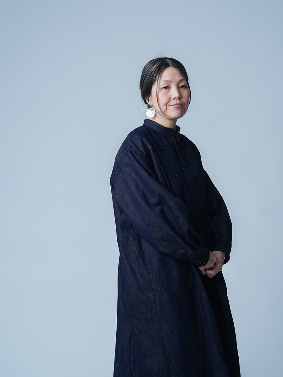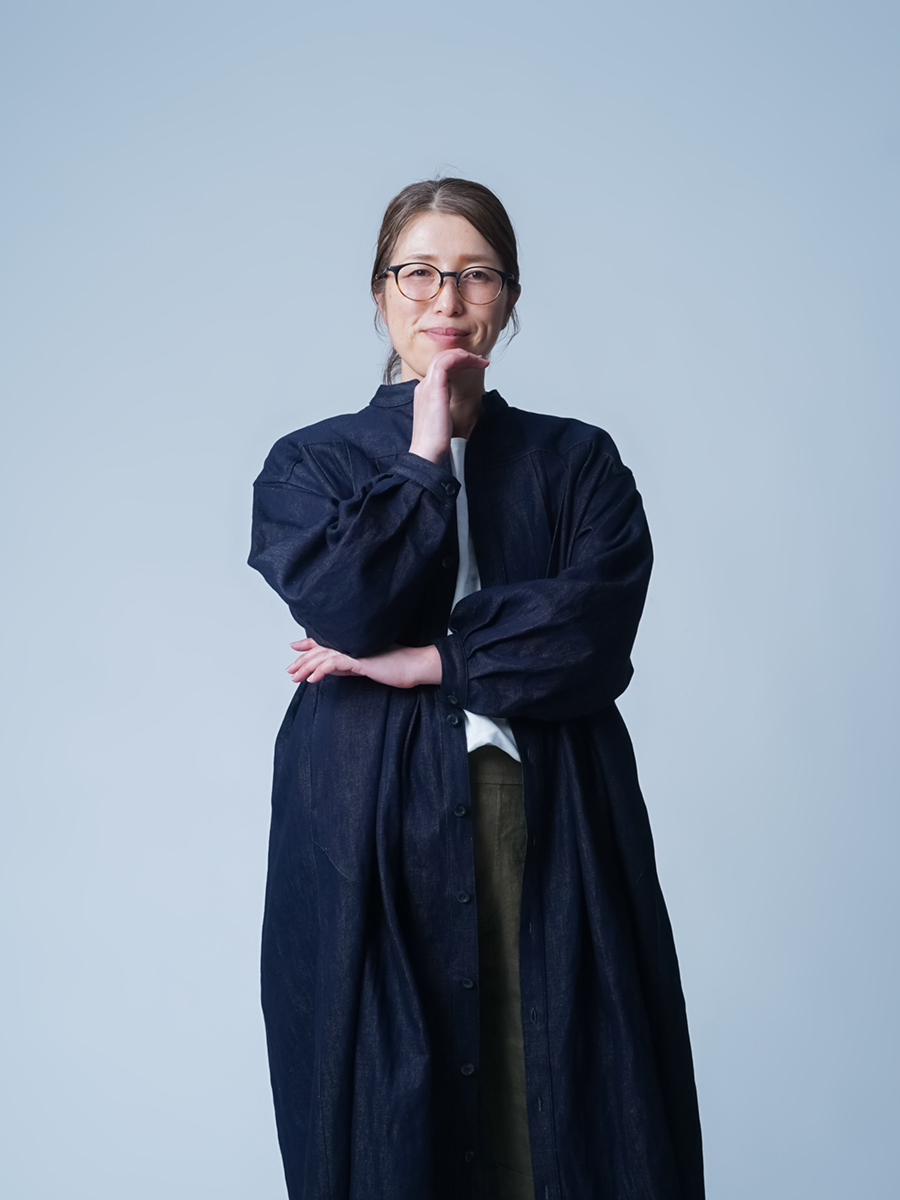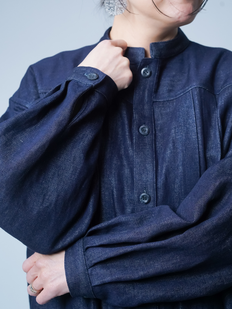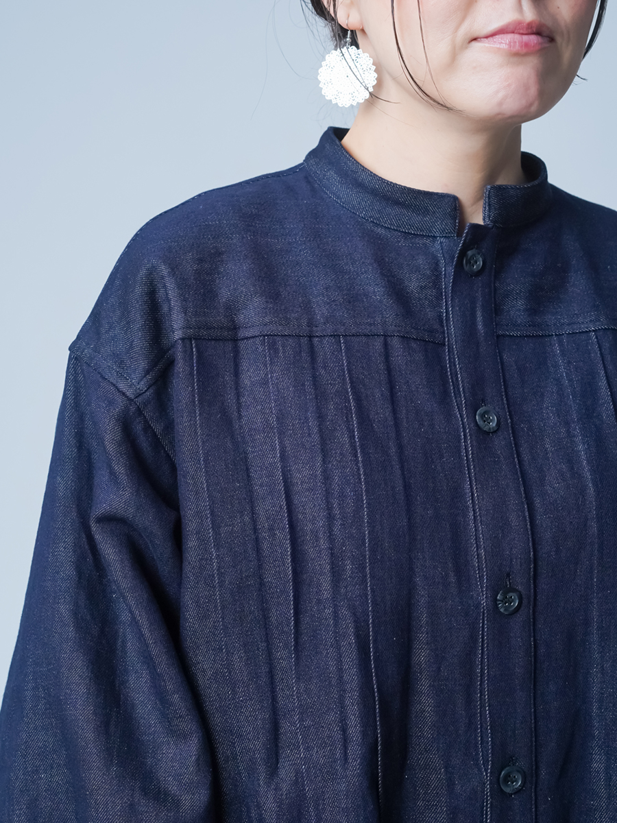 デニム好きには見逃せない一着です。大きめのピンタックは普段だとどうしても甘めの印象になりがちですが、そこはさすがデニム。しっかり甘さを抑えて、大人っぽさを足してくれるので急にお気持ちが整ってしまいます。甘すぎない可愛さとデニムならではの落ち着きの色のバランスが絶妙です。着丈は膝下13cm、袖丈は手首です。