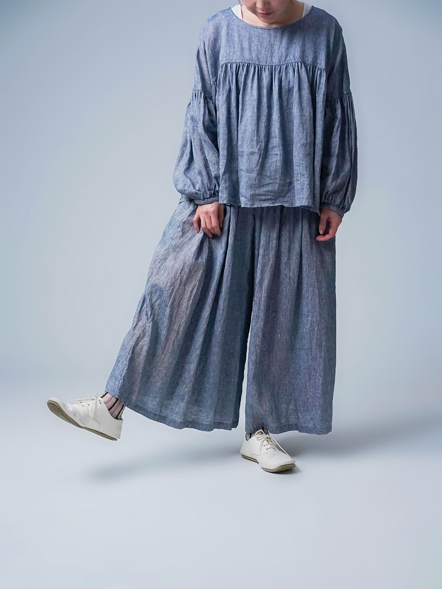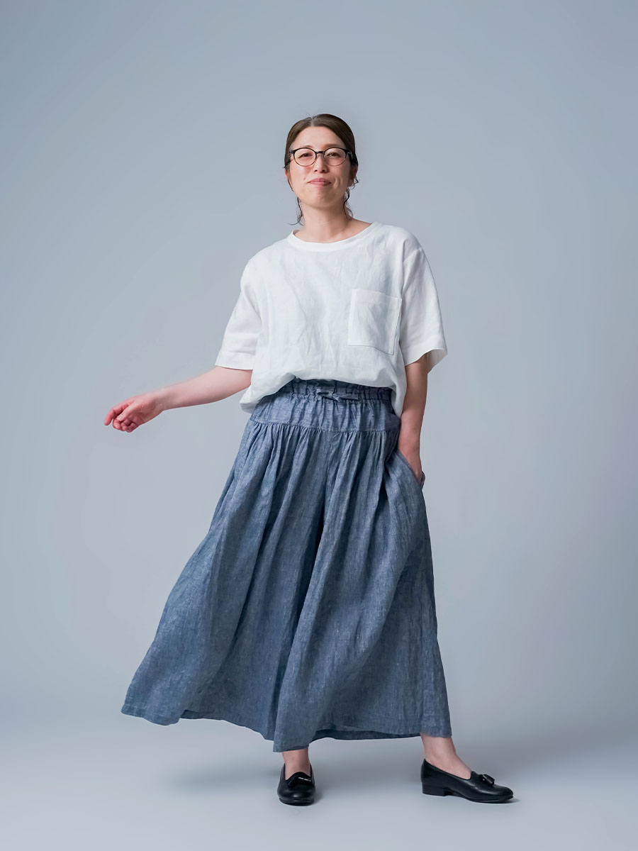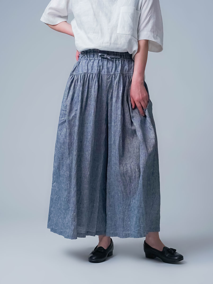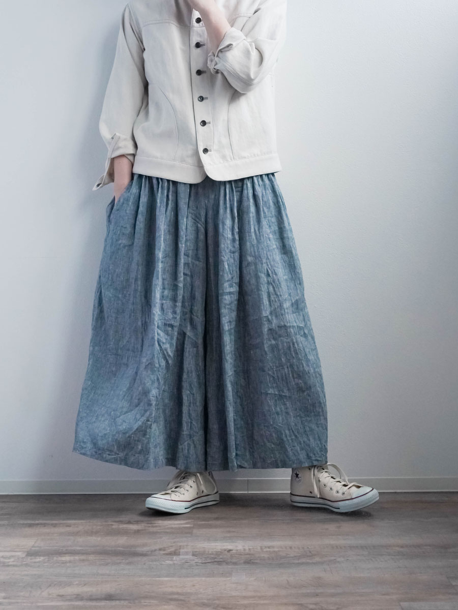 一見スカートのようにも見えるほどたっぷりとした分量感があって、動くたびに生地がふわっと揺れる感じがとても軽やかです。でも広がりすぎず、落ち感があるので甘くなりすぎないのがいいですね。汗を掻いた肌にも纏わりつかないくらいたっぷりしています。着丈は踝6cm上、ウエストは丁度いいです。