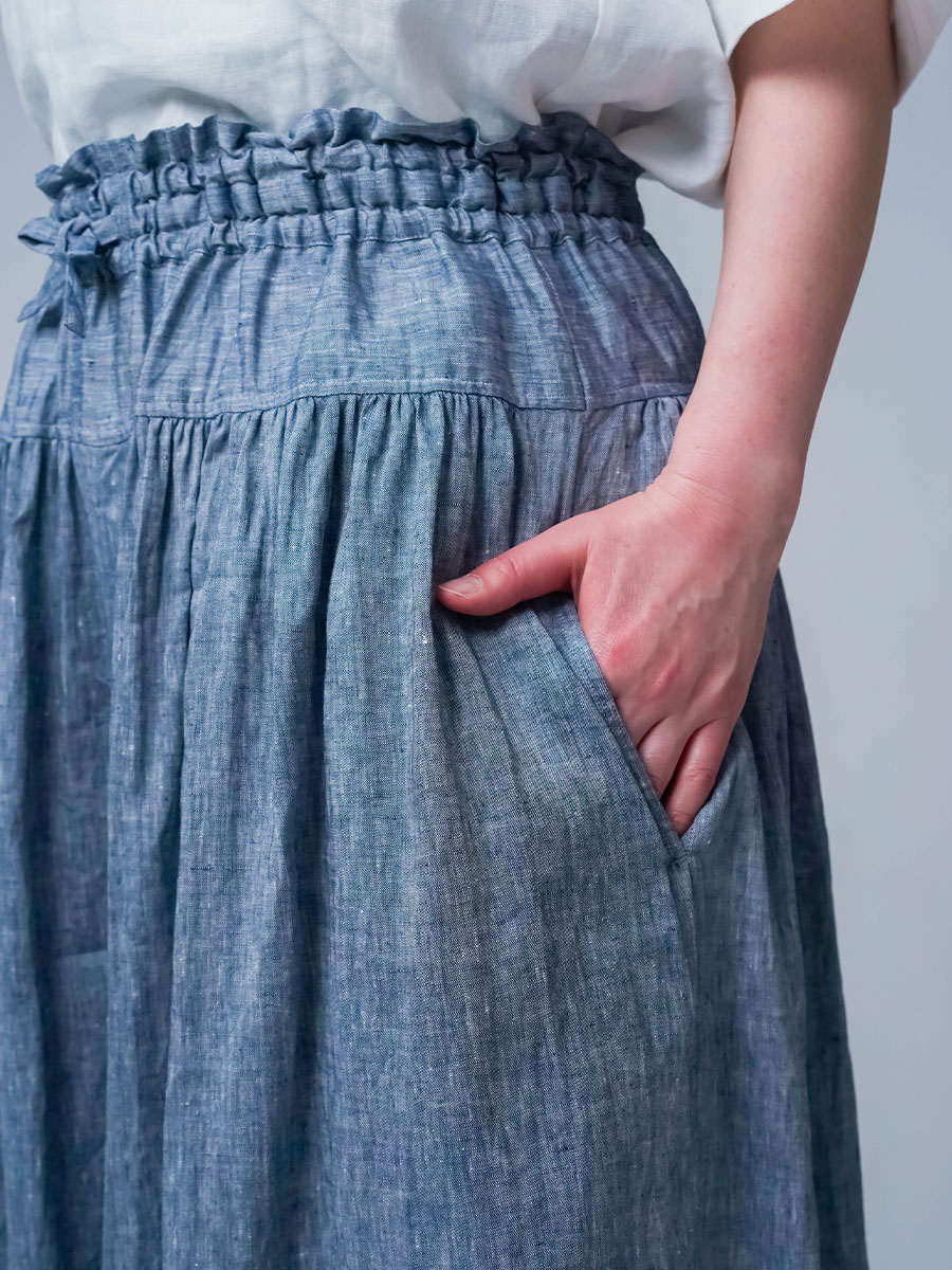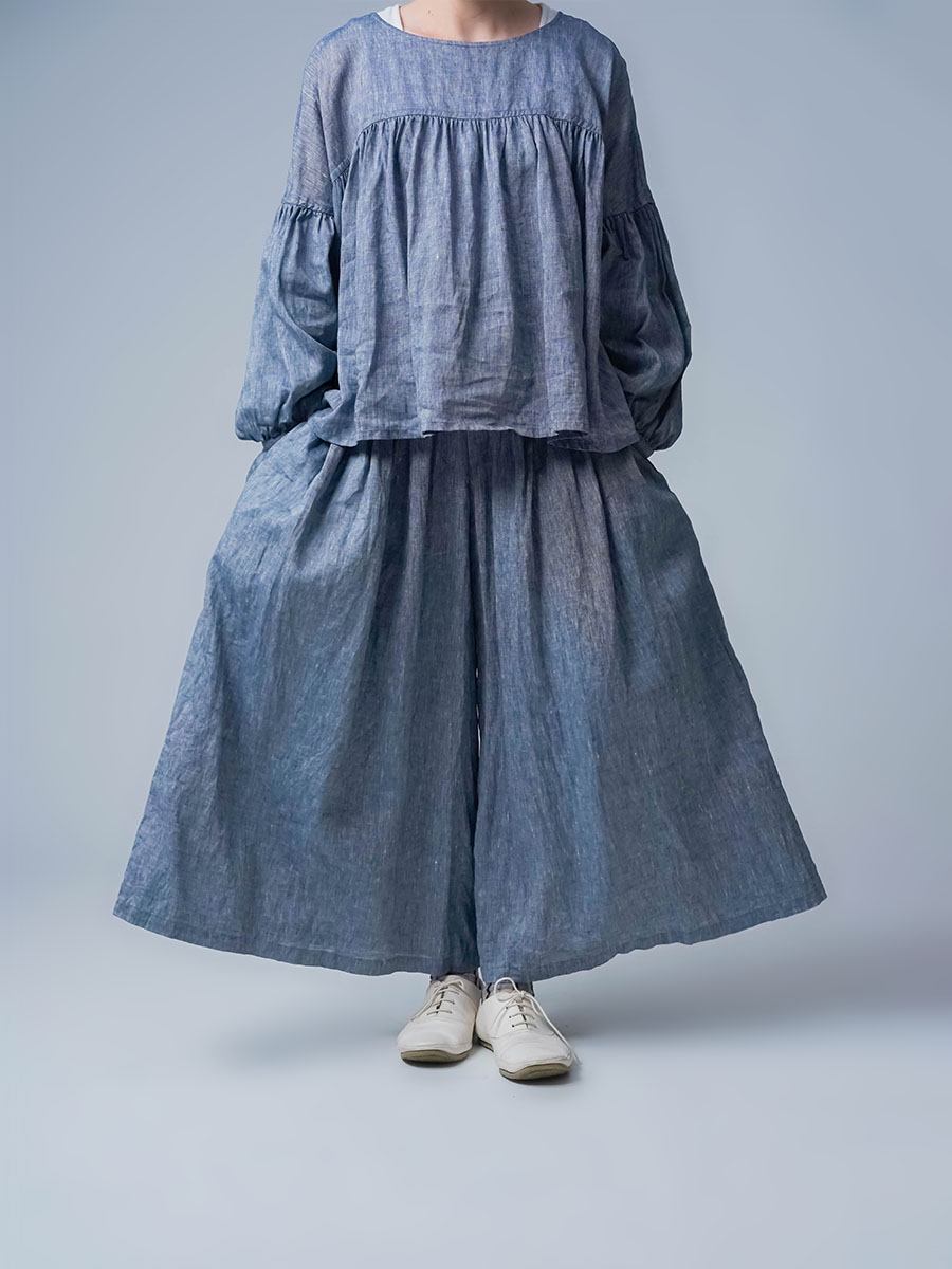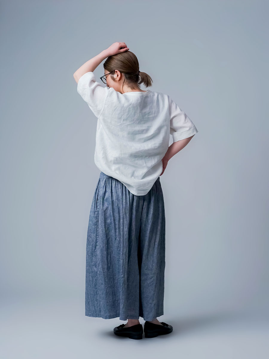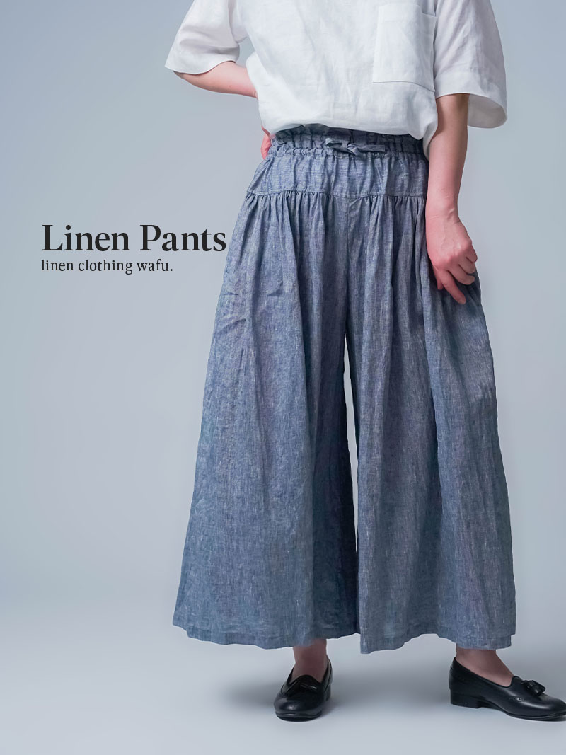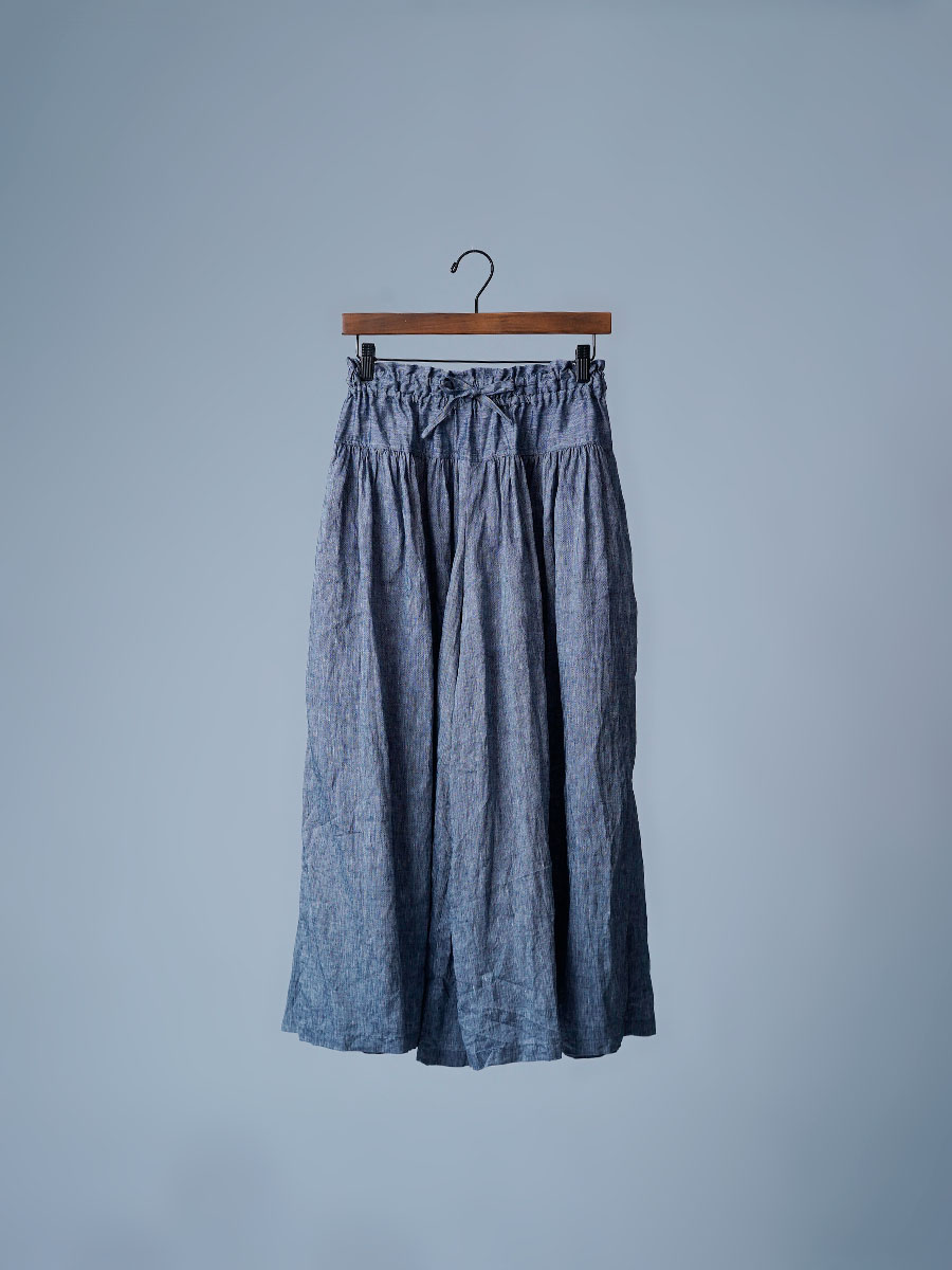 一見スカートのようにも見えるほどたっぷりとした分量感があって、動くたびに生地がふわっと揺れる感じがとても軽やかです。でも広がりすぎず、落ち感があるので甘くなりすぎないのがいいですね。汗を掻いた肌にも纏わりつかないくらいたっぷりしています。着丈は踝6cm上、ウエストは丁度いいです。