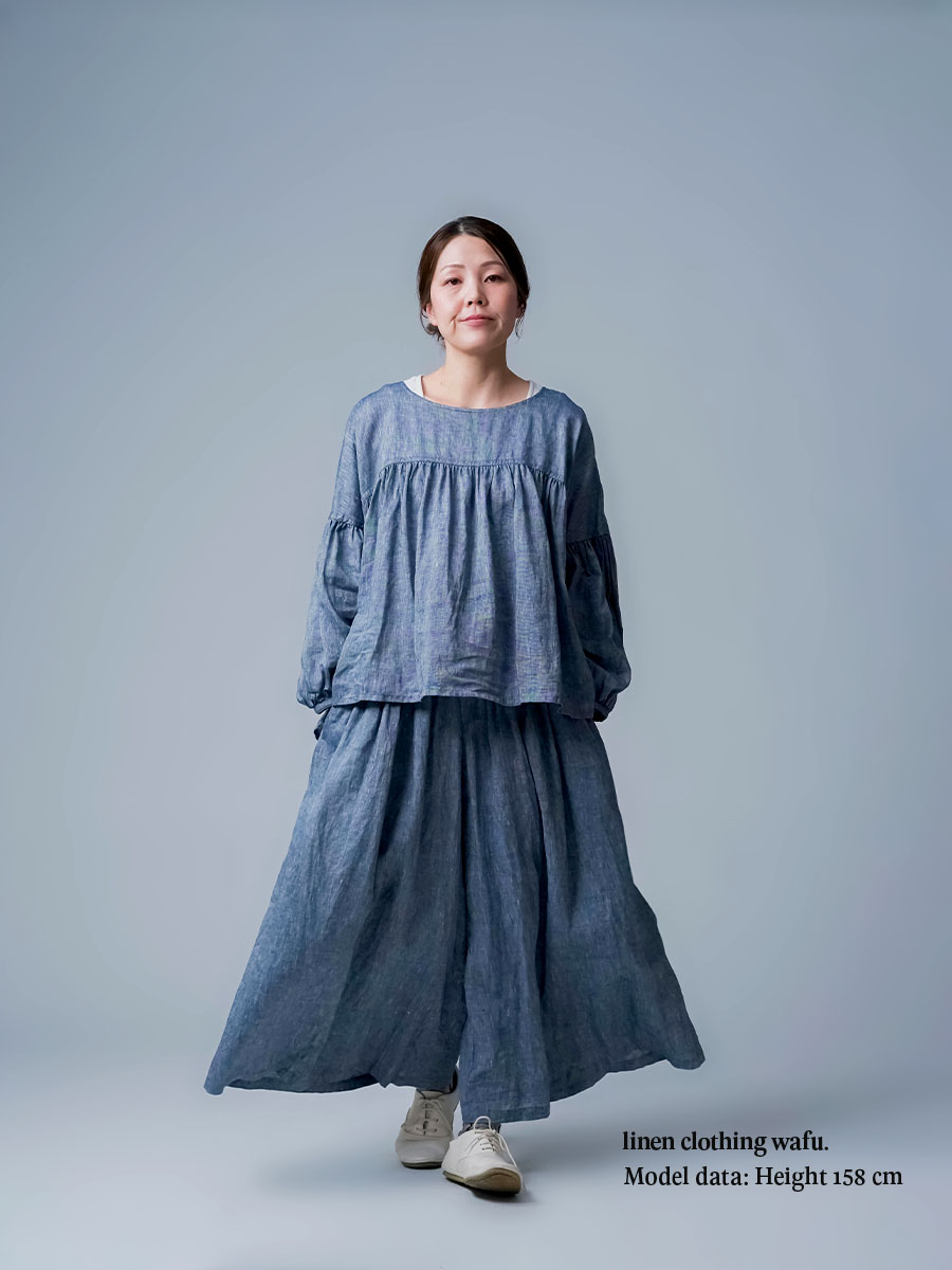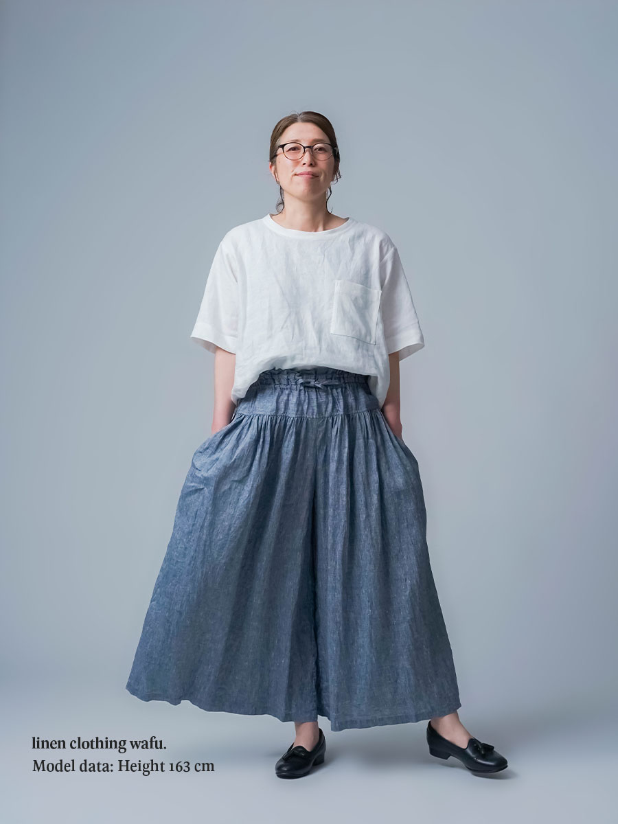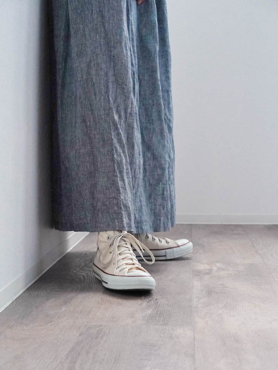 動きやすく、きれいに決まる一本。ほどよいボリュームで、リネンの落ち感によって広がりすぎず、すとんとしたシルエットです。動きやすく、日常の動作も快適に過ごせます。着丈は足首が隠れる長さで、155センチの私でもバランスよく着こなせる、マキシ丈を楽しめるワイドパンツです。