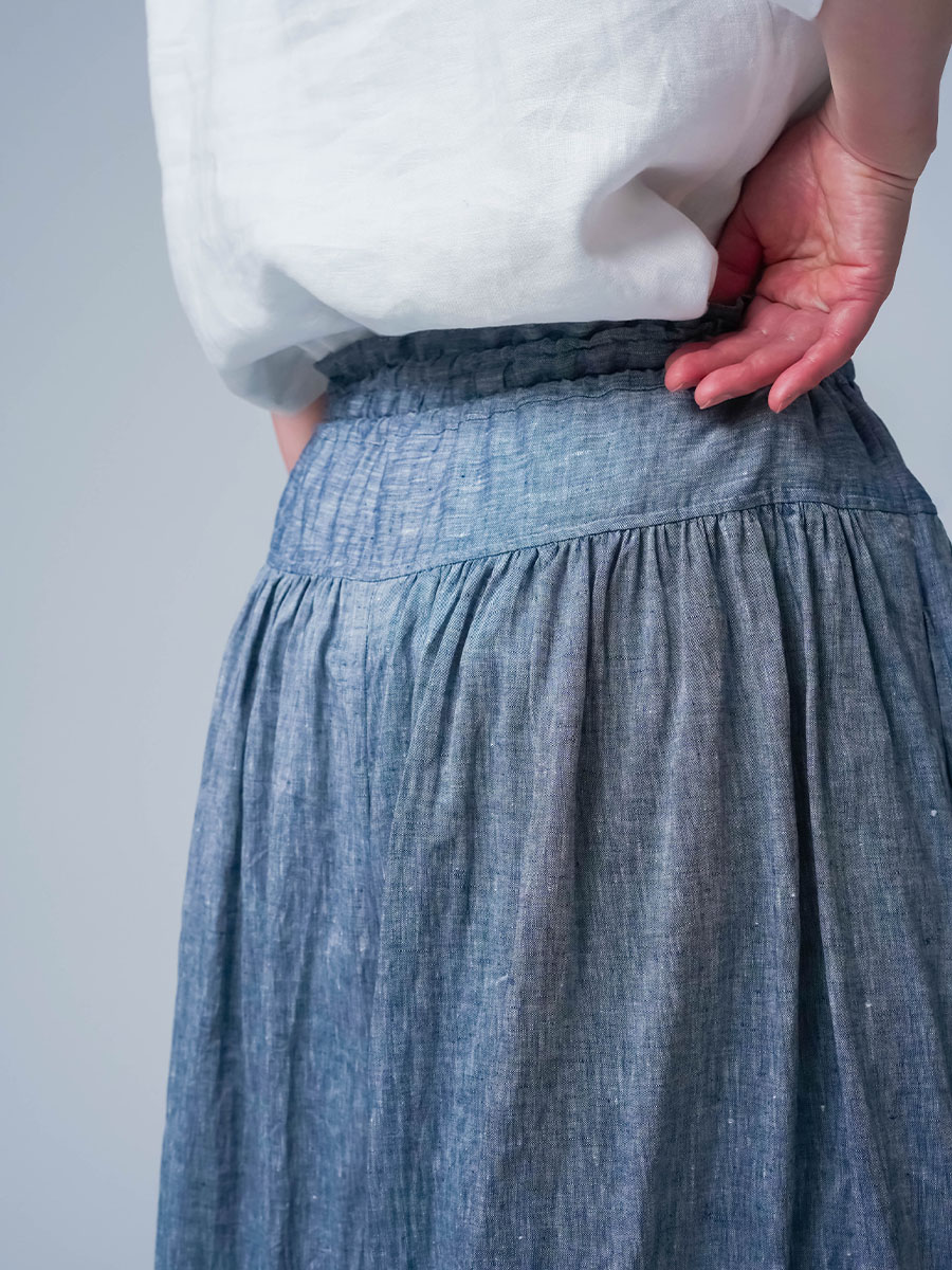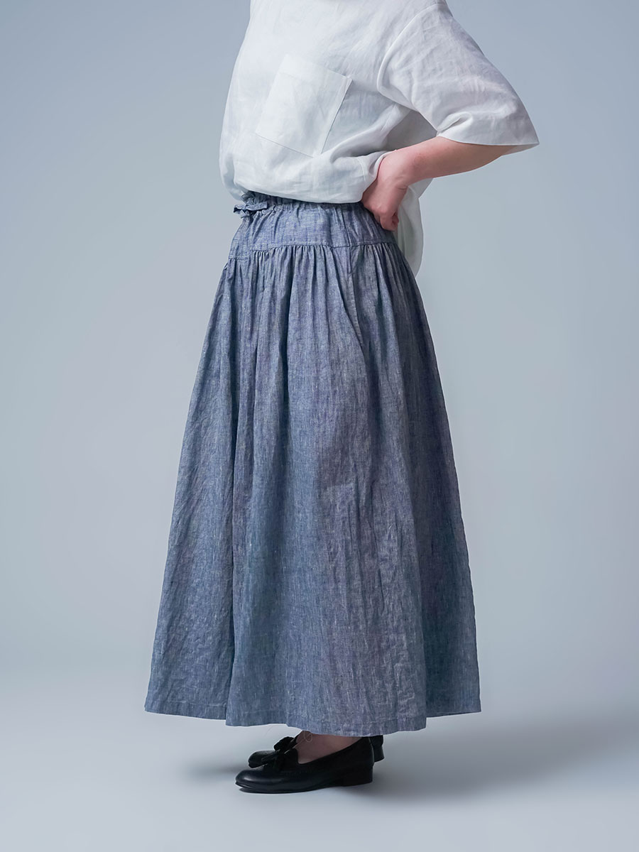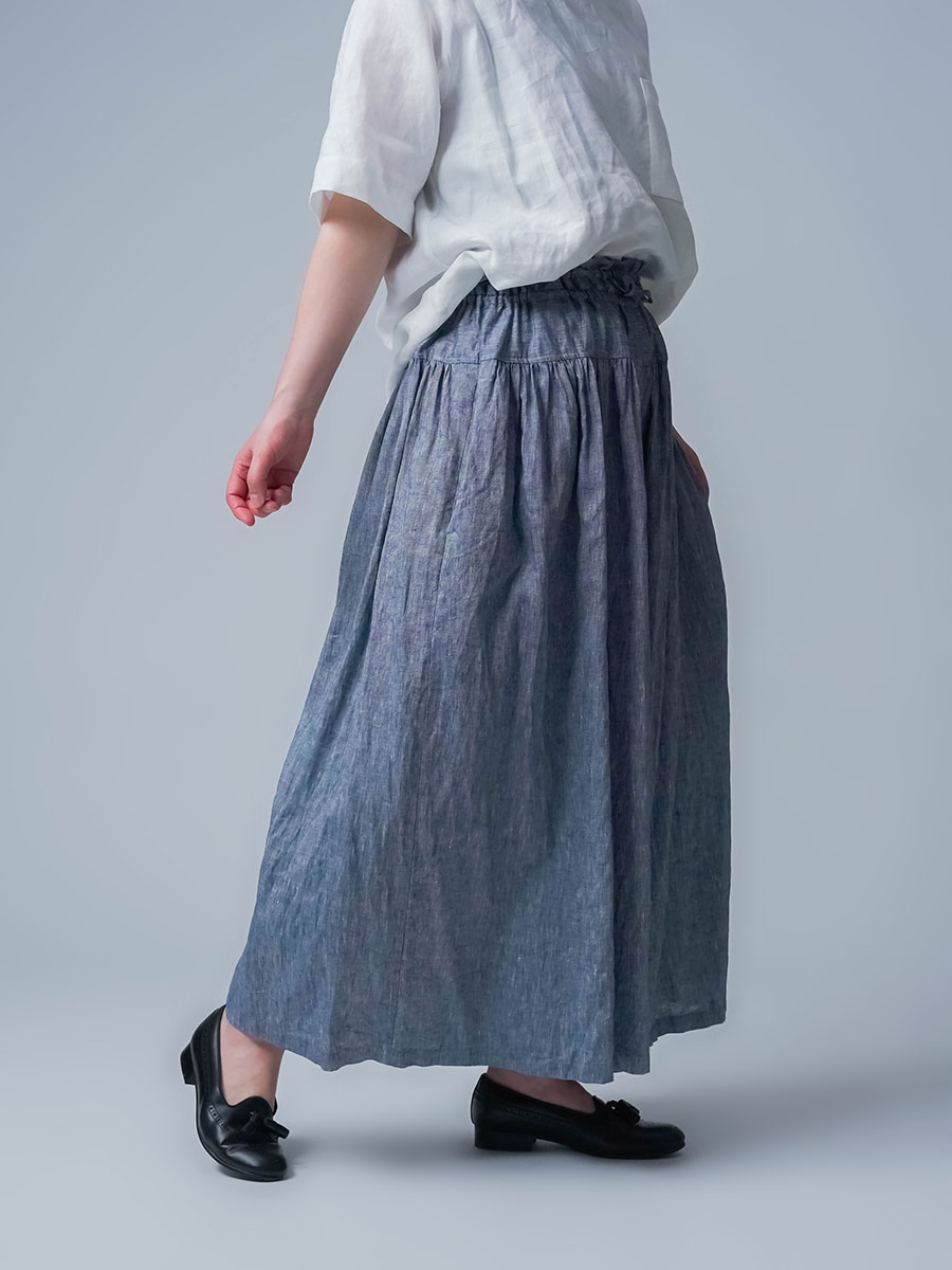 締め付け感がなく、ストレスフリーな履き心地。着丈はくるぶしが隠れるくらいの長さ。下半身にボリュームのある体型でも、さらっと無理なく履けるのが嬉しいポイント。細かいギャザーがお尻まわりに自然な立体感を生み、気になるラインをカバーしてくれます。脚のラインを拾わず、すっきりとしたシルエットに。リラックス感がありながら、きれい見えも叶う一枚です。