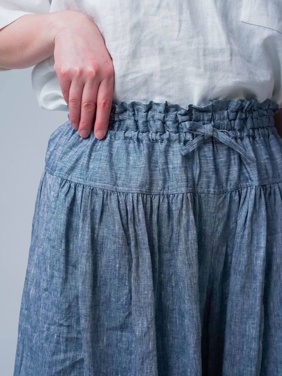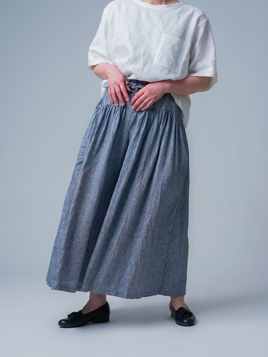 着丈はくるぶしくらい。Aラインのワイドパンツにギャザーのドレープ感がプラスされよりエレガントで上品な印象なのにシャンブレーの杢調の色合いでデイリーで気軽に着れる感じがとても素敵。シンプルに白Tに合わせてもおしゃれだけどぜひシャンブレーの生地のトップスでセットアップで着こなしてほしいです!!