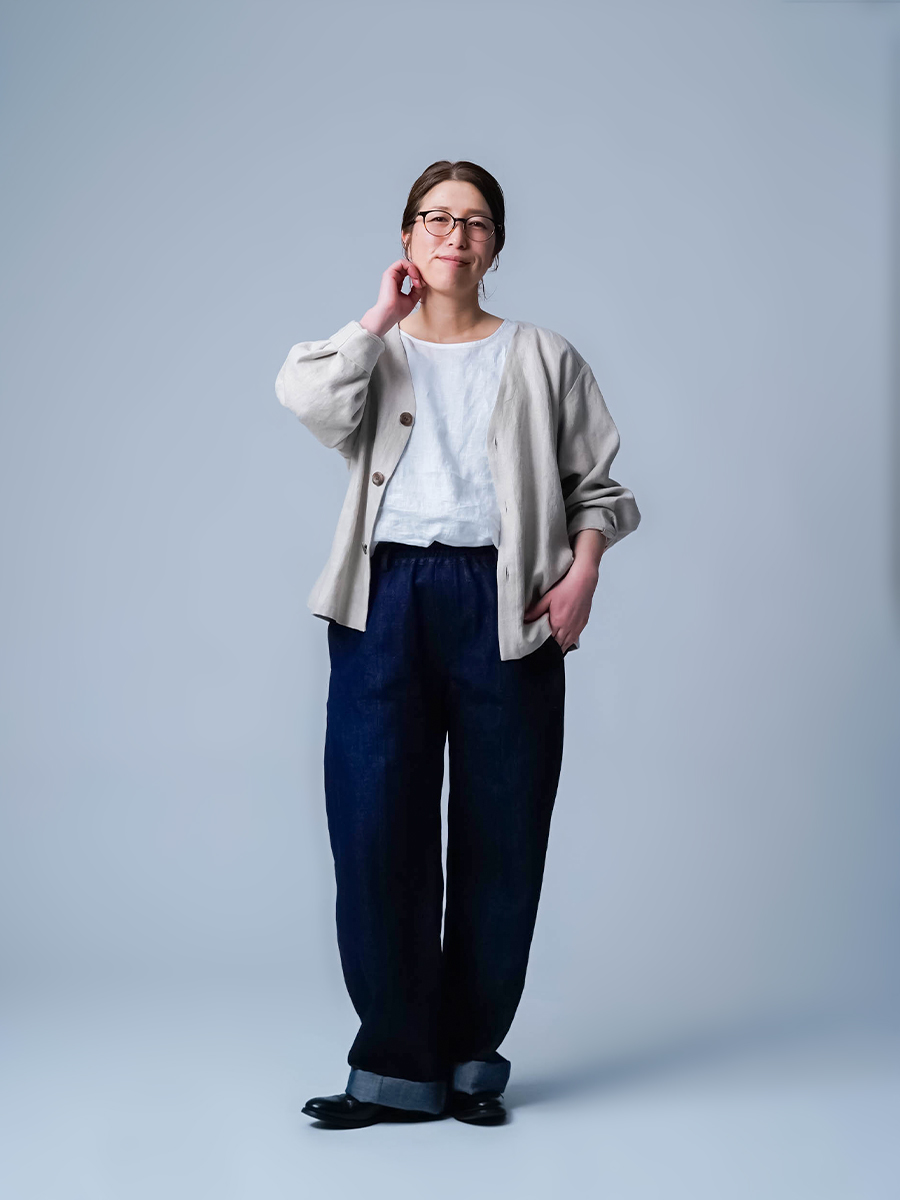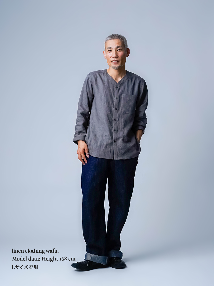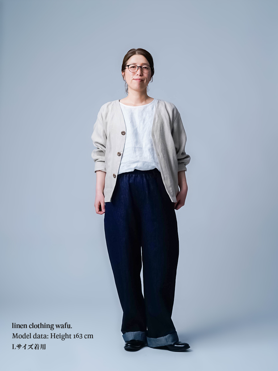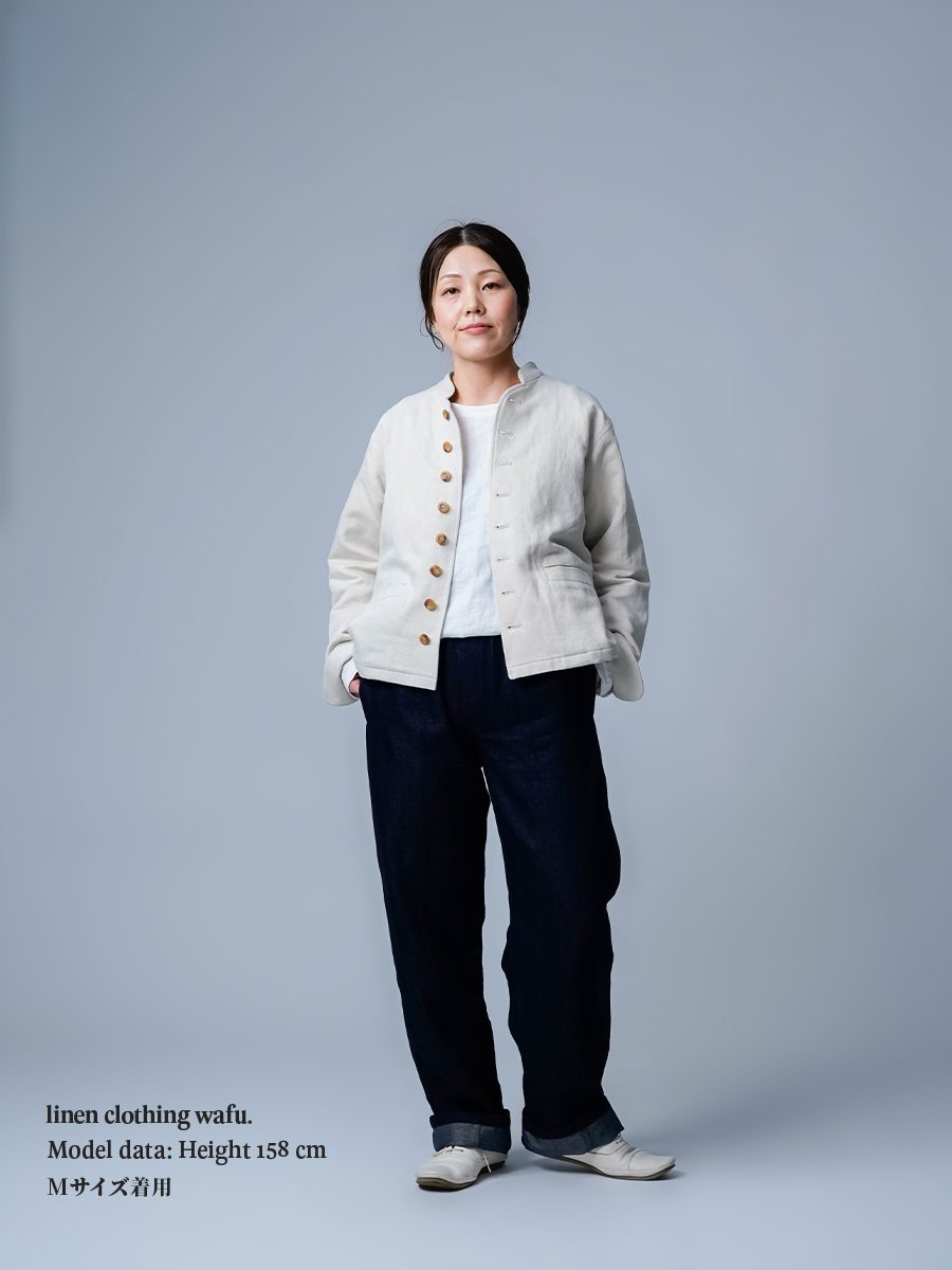- ※生地工場の生産時期によって色味の濃淡が出ることがございます。セットアップでの着用の場合はご相談下さい。カラーリネンは最初色落ちや生地の性質上、毛羽落ちがある場合がございます。落ち着くまで数回は単品でのお洗濯を。最初は水通しをおすすめします。表面の毛羽立ちがとれて、肌への刺激が極端に少なくなります。リネン特有のネップ、節がございます。