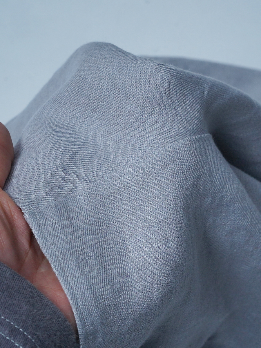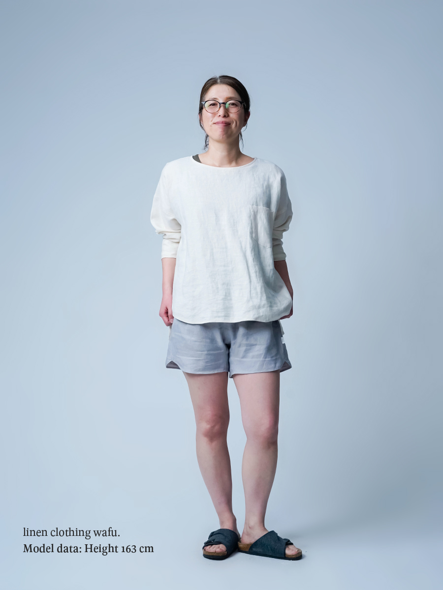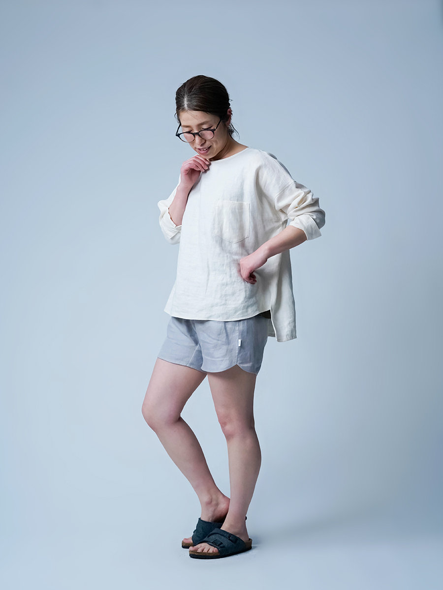 - ※生地工場の生産時期によって色味の濃淡が出ることがございます。セットアップでの着用の場合はご相談下さい。カラーリネンは最初色落ちや生地の性質上、毛羽落ちがある場合がございます。落ち着くまで数回は単品でのお洗濯を。最初は水通しをおすすめします。表面の毛羽立ちがとれて、肌への刺激が極端に少なくなります。リネン特有のネップ、節がございます。