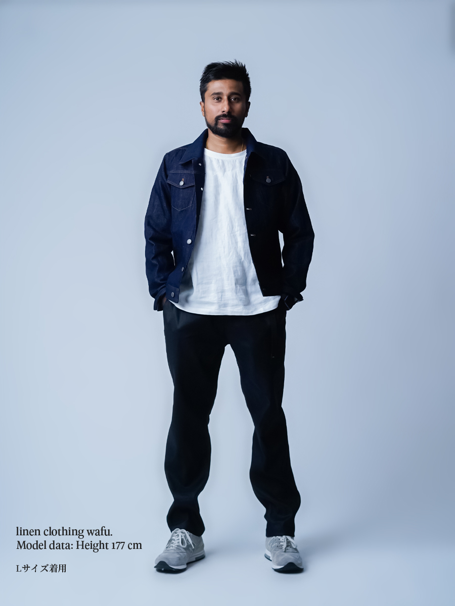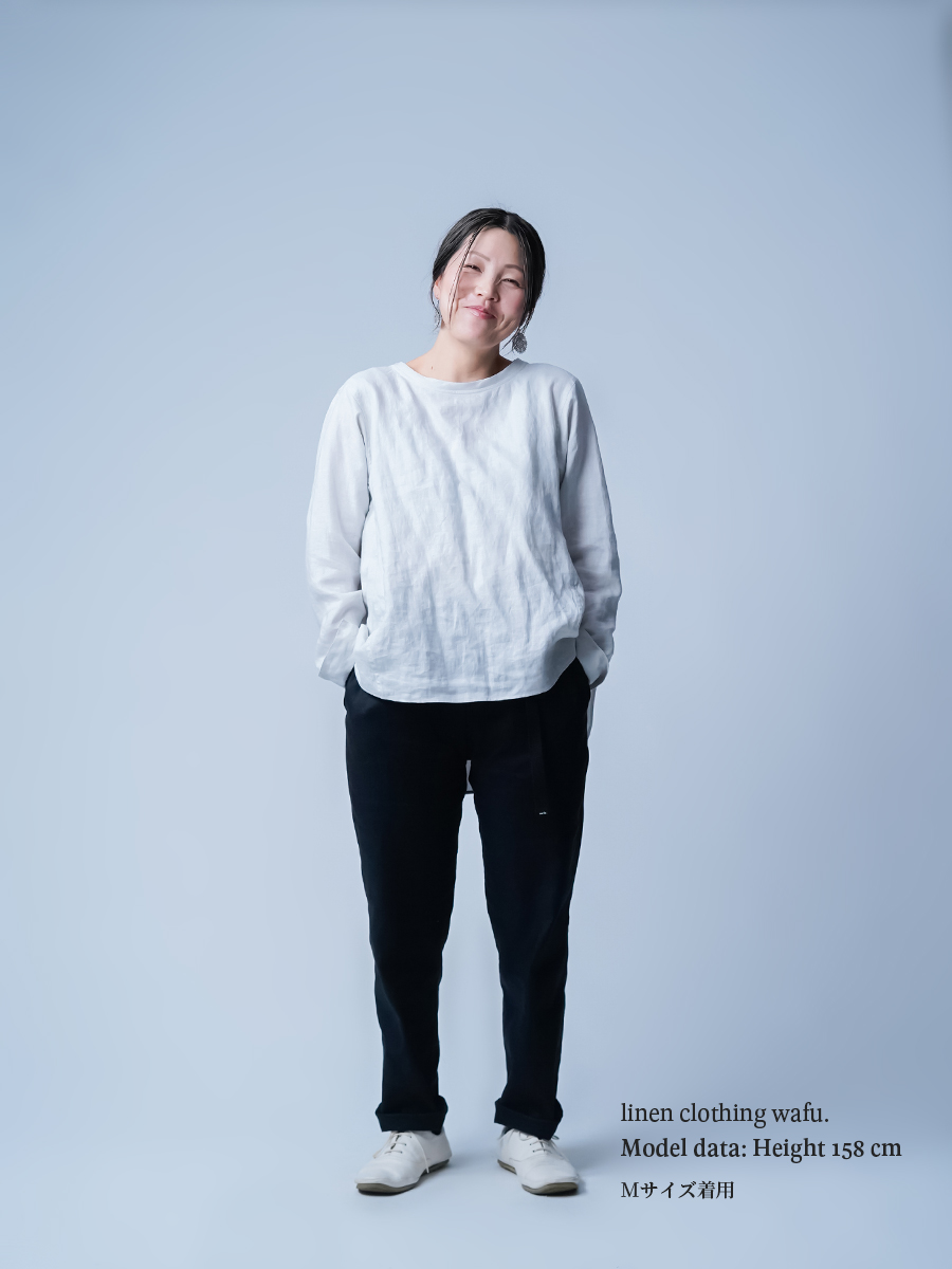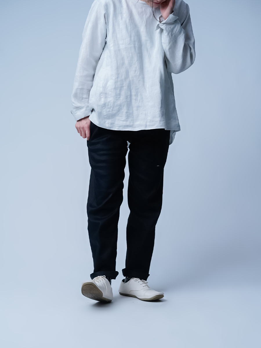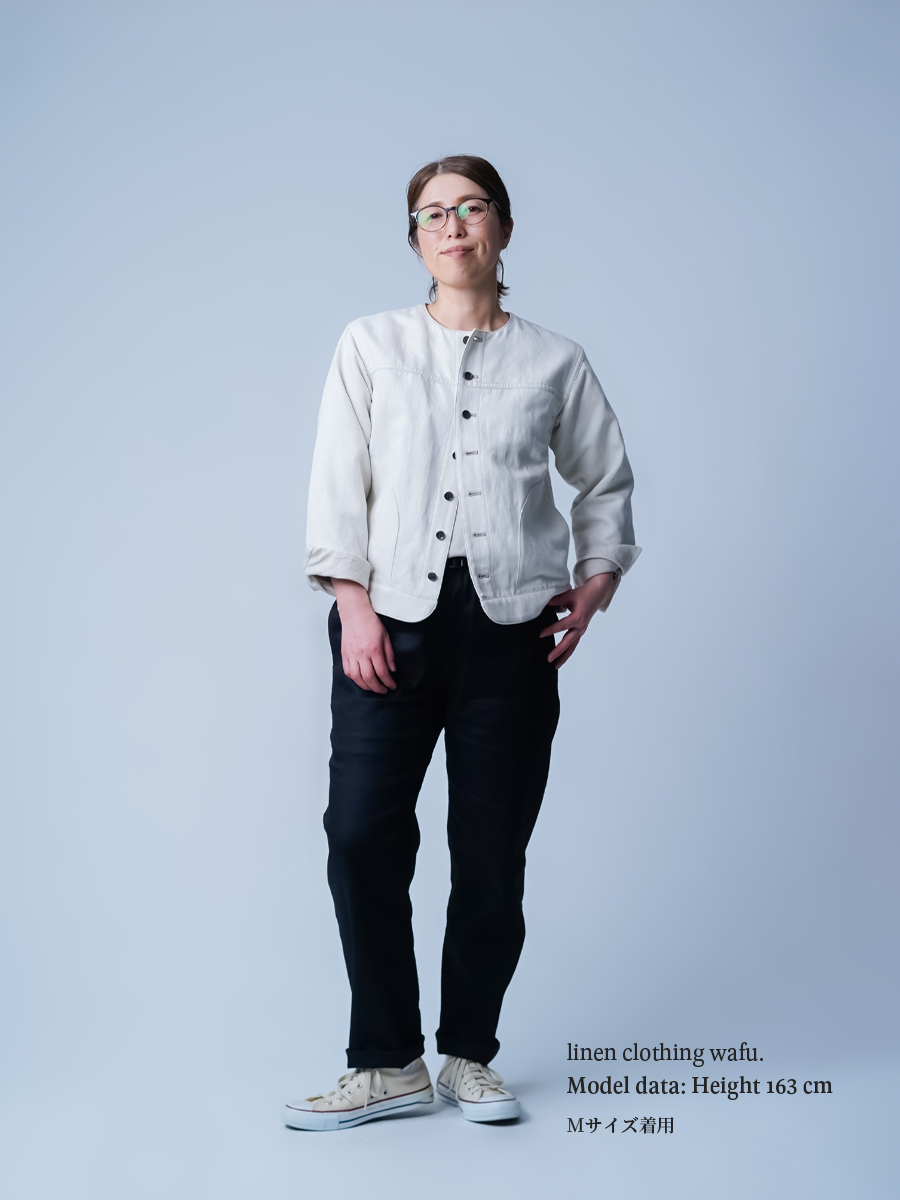 - ※生地工場の生産時期によって色味の濃淡が出ることがございます。セットアップでの着用の場合はご相談下さい。カラーリネンは最初色落ちや生地の性質上、毛羽落ちがある場合がございます。落ち着くまで数回は単品でのお洗濯を。最初は水通しをおすすめします。表面の毛羽立ちがとれて、肌への刺激が極端に少なくなります。リネン特有のネップ、節がございます。
