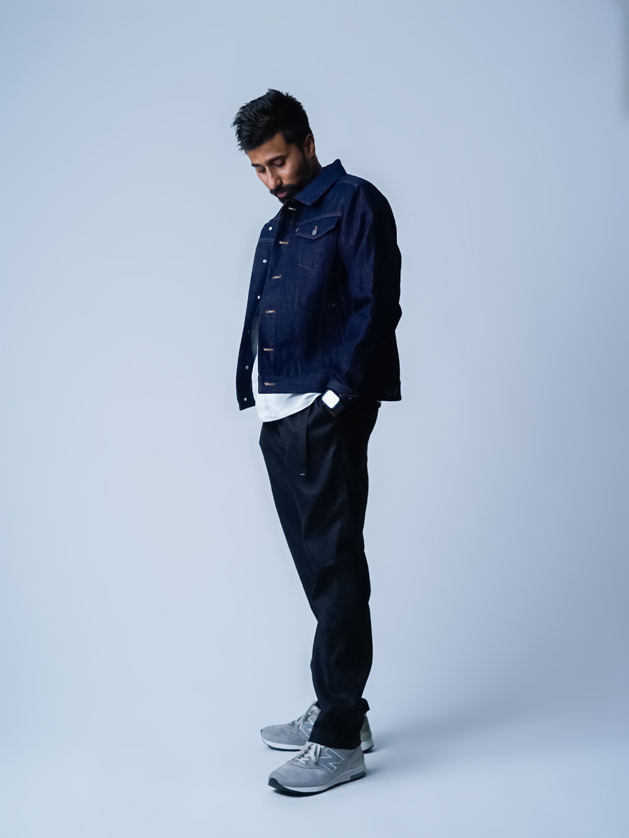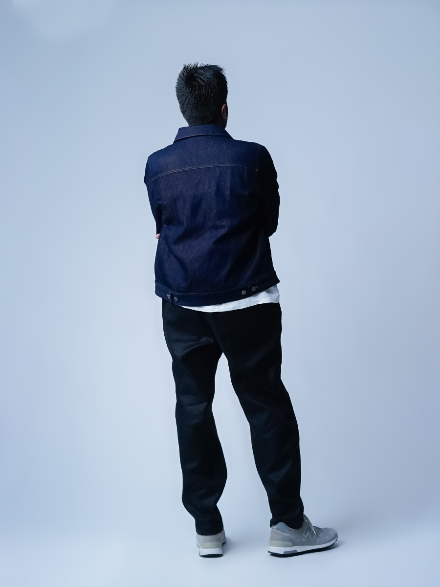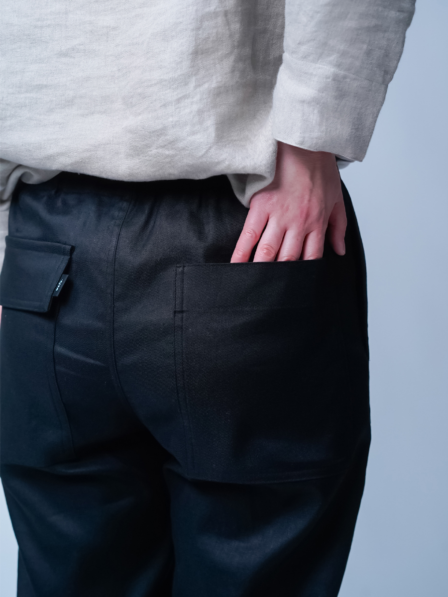 私はMサイズを選びました。久しぶりに細めが穿きたくなるカッコいい作品です。横姿が小尻に見えフラップポケットのお陰でヒップの位置が高く見えます。かなり計算されたパンツだと穿いた瞬間に分かりました。生地は厚みのありジャストで穿いても違和感がありません、まさに大人のための細めパンツです。着丈は床から2cm上、ウエストは紐調整出来ます。