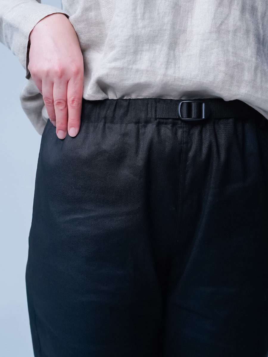 Mサイズが良いサイズ感です。細身のすっきりとしたシルエットですが、腰まわりはゆったりとしているのでストレスはありません。丈は2回ロールアップしてくるぶしくらいです。ベルト、後ろポケットのフラップにリネンソロテックス生地。動きやすさ、デザイン、使いやすいギミック。どれも最高なパンツです。