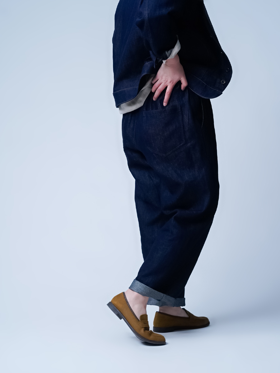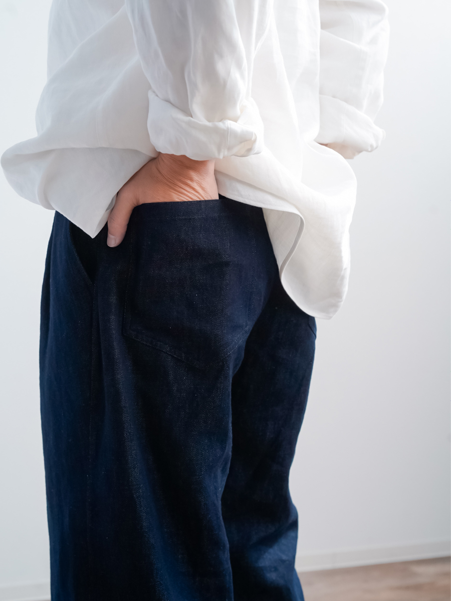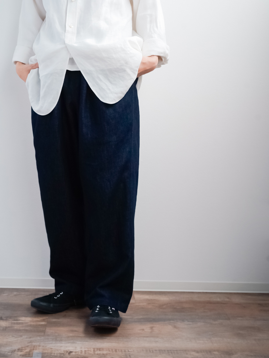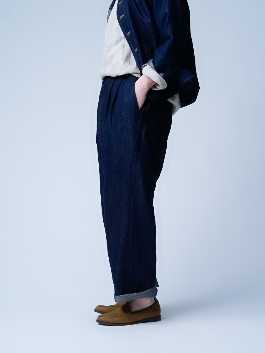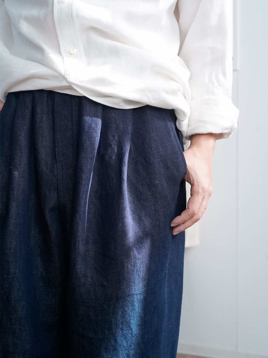このデニムが育った時、どれだけカッコよくなるのか想像するだけでワクワクします。遠藤さん、今回も最高の一本をありがとうございます。私はMサイズを選びました。ウエストから入ったタックのラインが太ももの半分あたりまで伸びていて、脚をすらりと長く見せてくれます。お尻まわりはラインを拾わず、ほんのりゆとりがあるので、少し下げて腰穿きしても女性らしくサマになります。丈は素足で立ったときに床ギリギリの長さで、落ち感がとてもきれい。ウエストも締め付け感がなく、長時間穿いても快適です。そして今回はリネンデニムで仕立てたことで、まるで別物に大変身。デニム好きにはたまらないこのシルエットです。ウエストに入ったタックが腰まわりのハリを軽減し、すっきり見せてくれます。