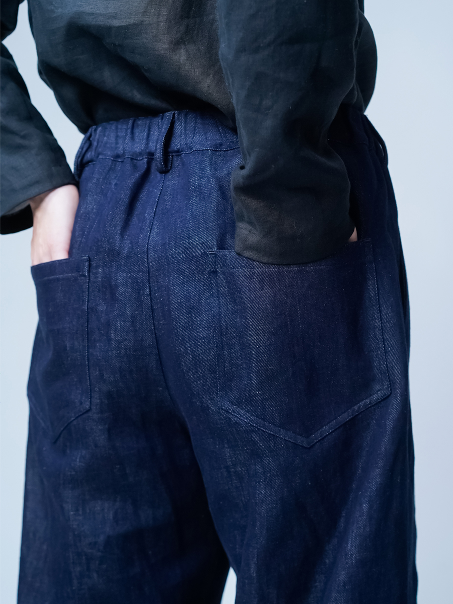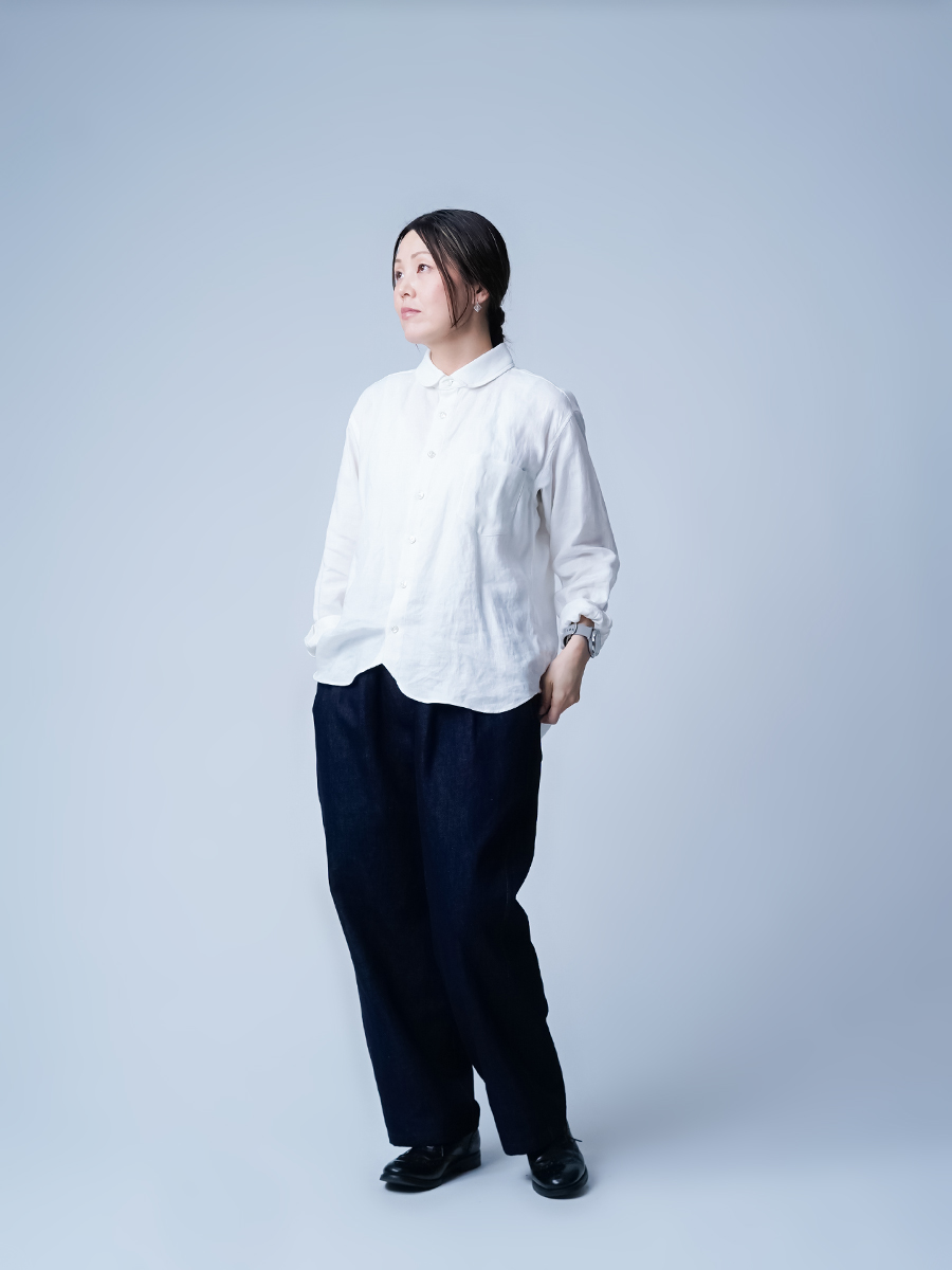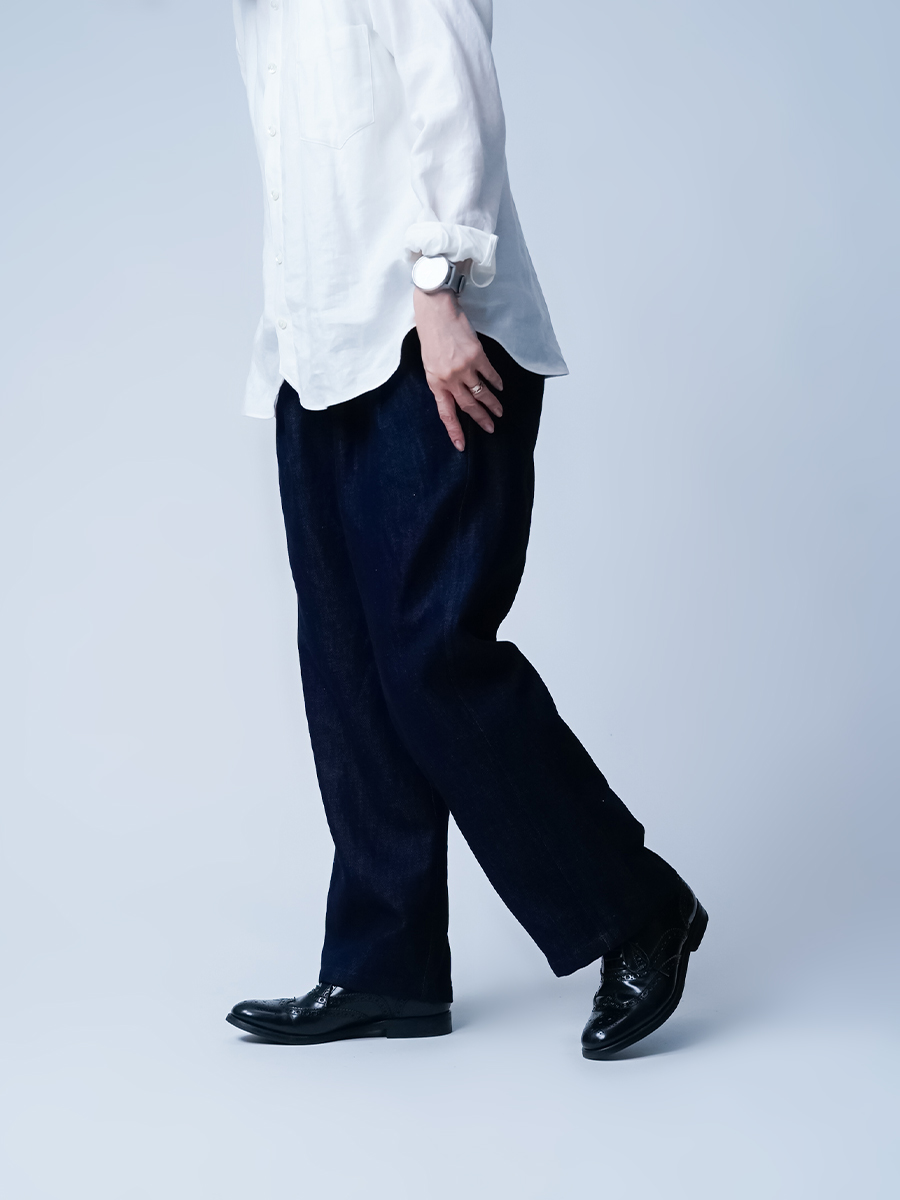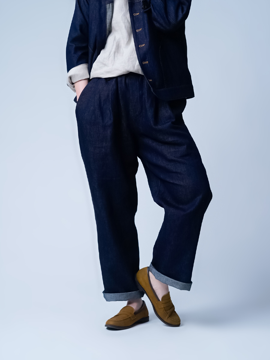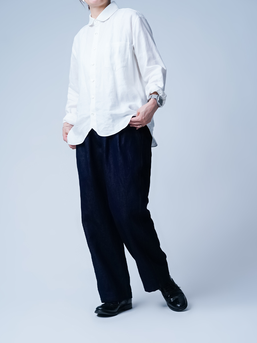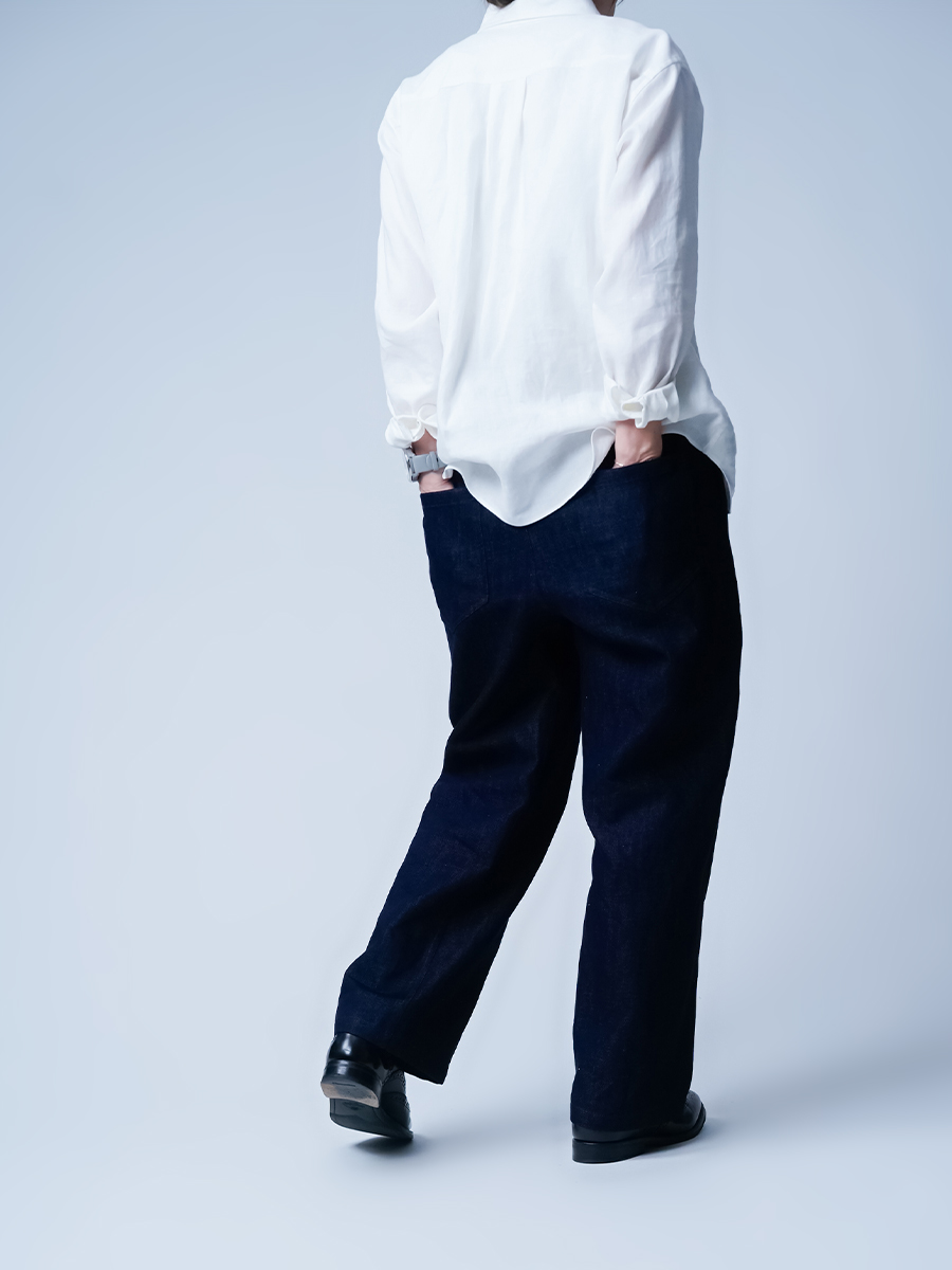 このデニムが育った時、どれだけカッコよくなるのか想像するだけでワクワクします。遠藤さん、今回も最高の一本をありがとうございます。私はMサイズを選びました。ウエストから入ったタックのラインが太ももの半分あたりまで伸びていて、脚をすらりと長く見せてくれます。お尻まわりはラインを拾わず、ほんのりゆとりがあるので、少し下げて腰穿きしても女性らしくサマになります。丈は素足で立ったときに床ギリギリの長さで、落ち感がとてもきれい。ウエストも締め付け感がなく、長時間穿いても快適です。そして今回はリネンデニムで仕立てたことで、まるで別物に大変身。デニム好きにはたまらないこのシルエットです。ウエストに入ったタックが腰まわりのハリを軽減し、すっきり見せてくれます。