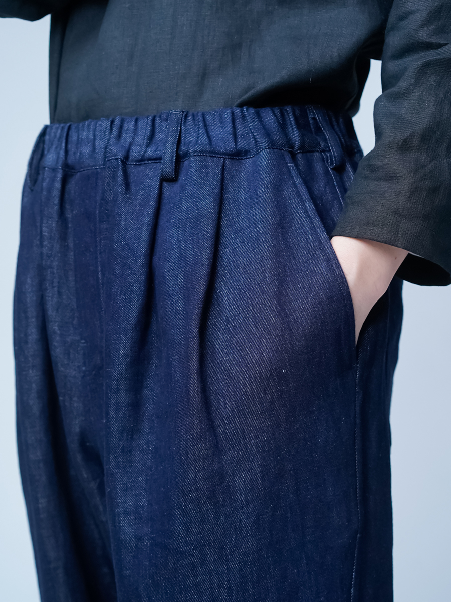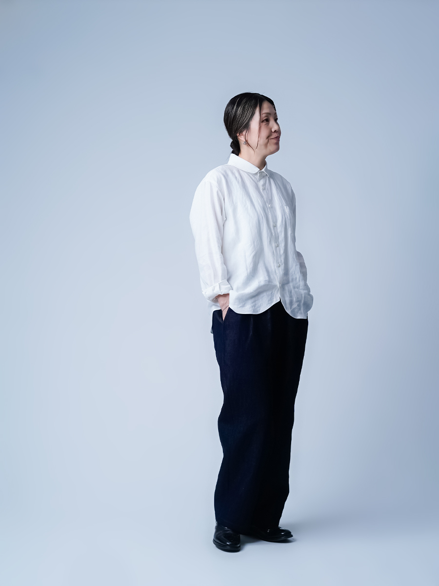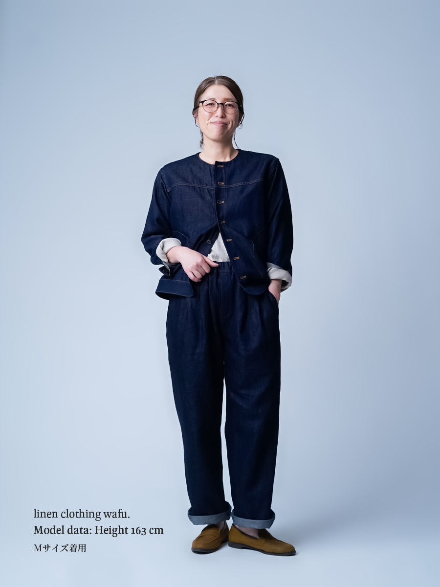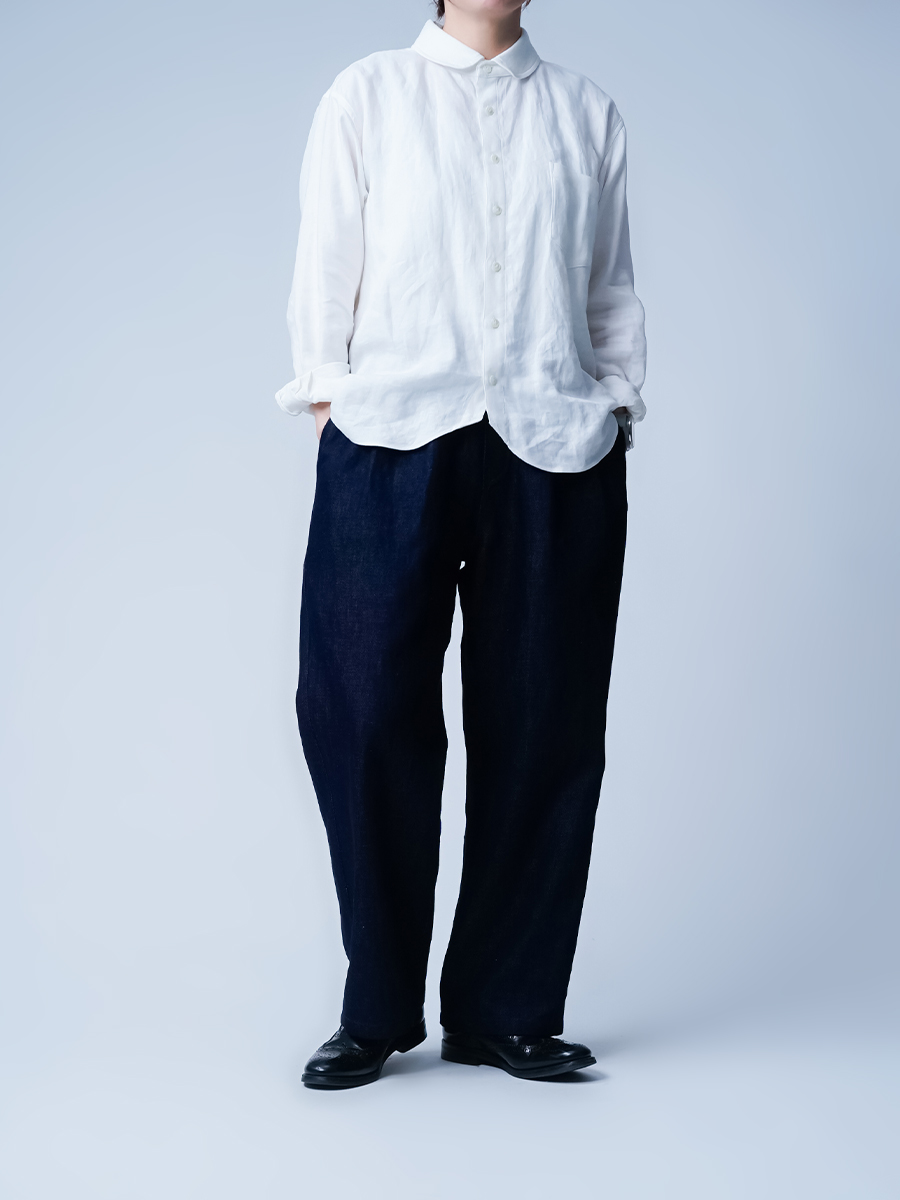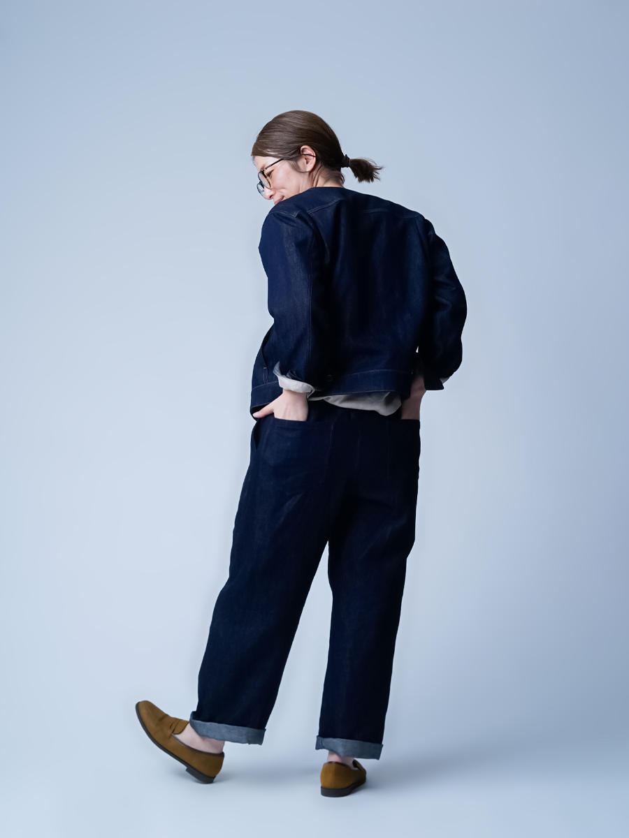 このデニムが育った時、どれだけカッコよくなるのか想像するだけでワクワクします。遠藤さん、今回も最高の一本をありがとうございます。私はMサイズを選びました。ウエストから入ったタックのラインが太ももの半分あたりまで伸びていて、脚をすらりと長く見せてくれます。お尻まわりはラインを拾わず、ほんのりゆとりがあるので、少し下げて腰穿きしても女性らしくサマになります。丈は素足で立ったときに床ギリギリの長さで、落ち感がとてもきれい。ウエストも締め付け感がなく、長時間穿いても快適です。そして今回はリネンデニムで仕立てたことで、まるで別物に大変身。デニム好きにはたまらないこのシルエットです。ウエストに入ったタックが腰まわりのハリを軽減し、すっきり見せてくれます。