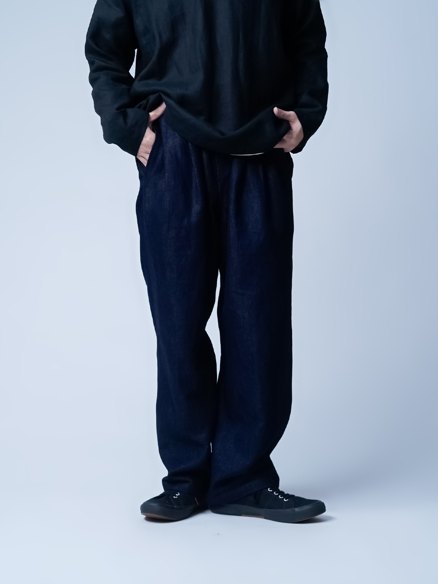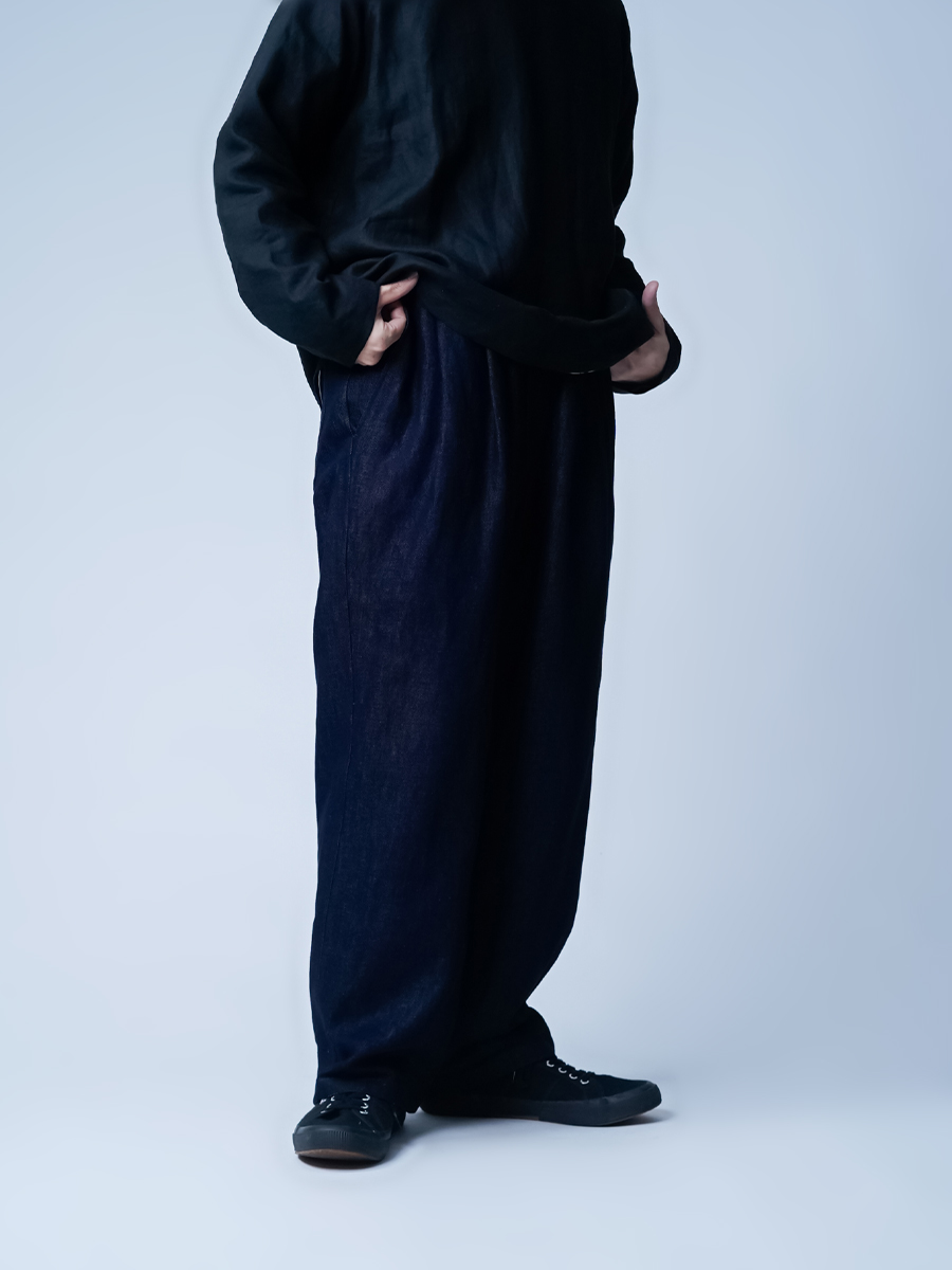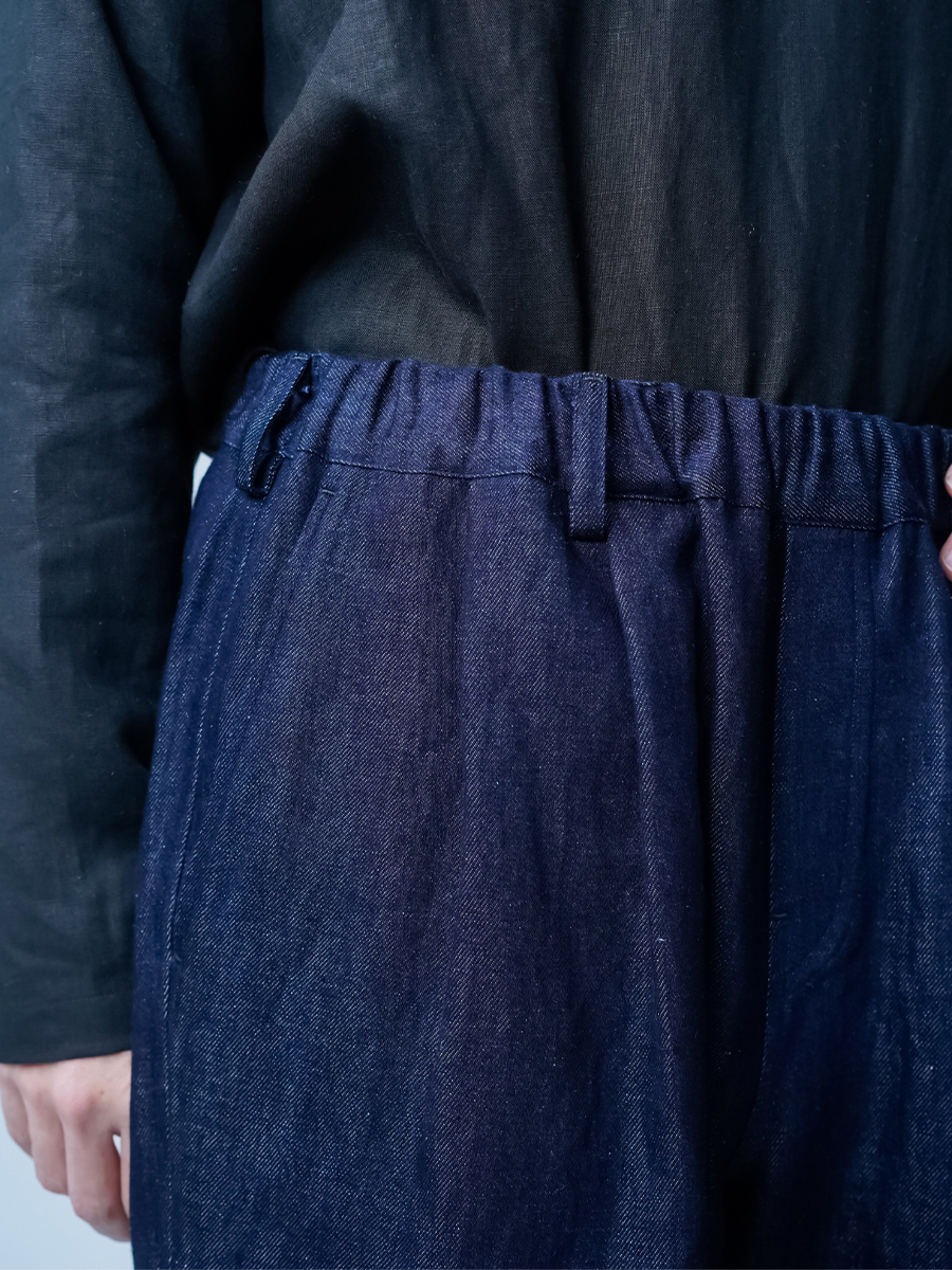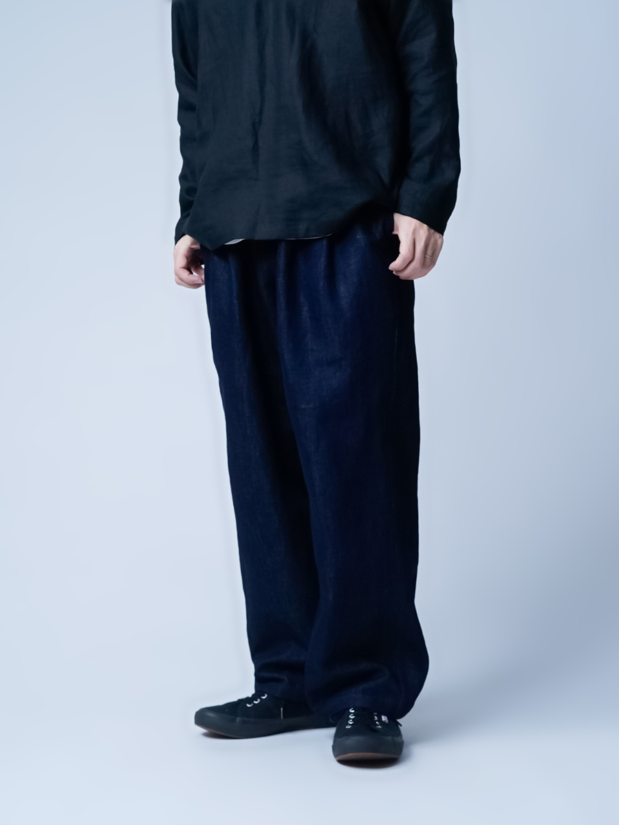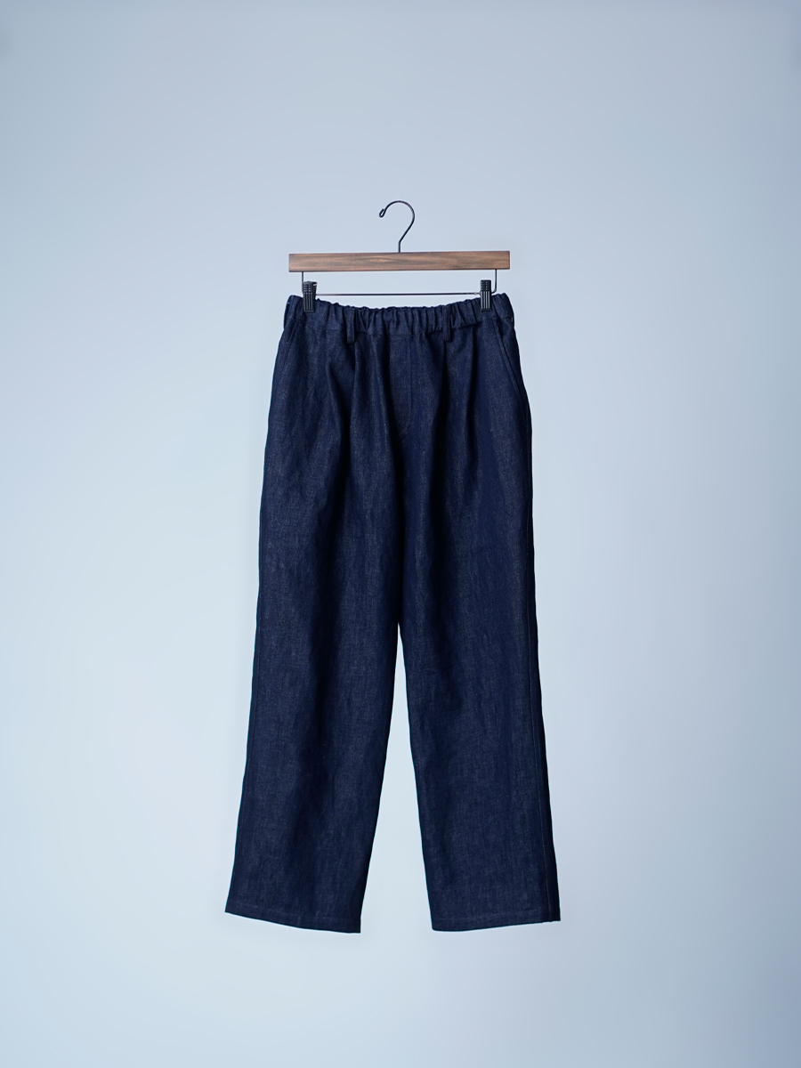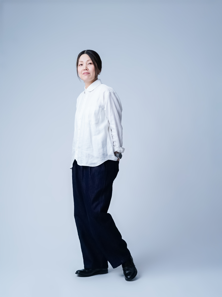 このデニムが育った時、どれだけカッコよくなるのか想像するだけでワクワクします。遠藤さん、今回も最高の一本をありがとうございます。私はMサイズを選びました。ウエストから入ったタックのラインが太ももの半分あたりまで伸びていて、脚をすらりと長く見せてくれます。お尻まわりはラインを拾わず、ほんのりゆとりがあるので、少し下げて腰穿きしても女性らしくサマになります。丈は素足で立ったときに床ギリギリの長さで、落ち感がとてもきれい。ウエストも締め付け感がなく、長時間穿いても快適です。そして今回はリネンデニムで仕立てたことで、まるで別物に大変身。デニム好きにはたまらないこのシルエットです。ウエストに入ったタックが腰まわりのハリを軽減し、すっきり見せてくれます。