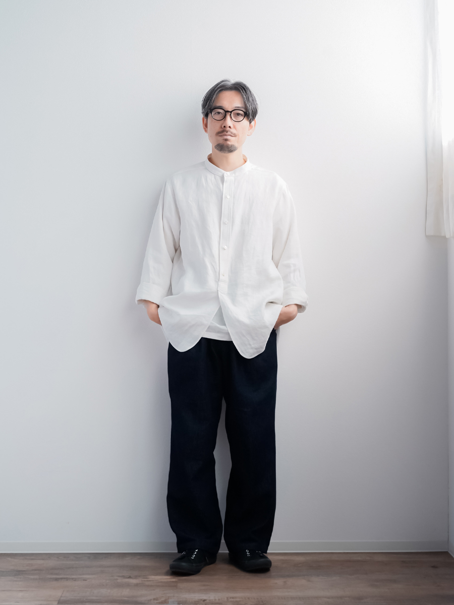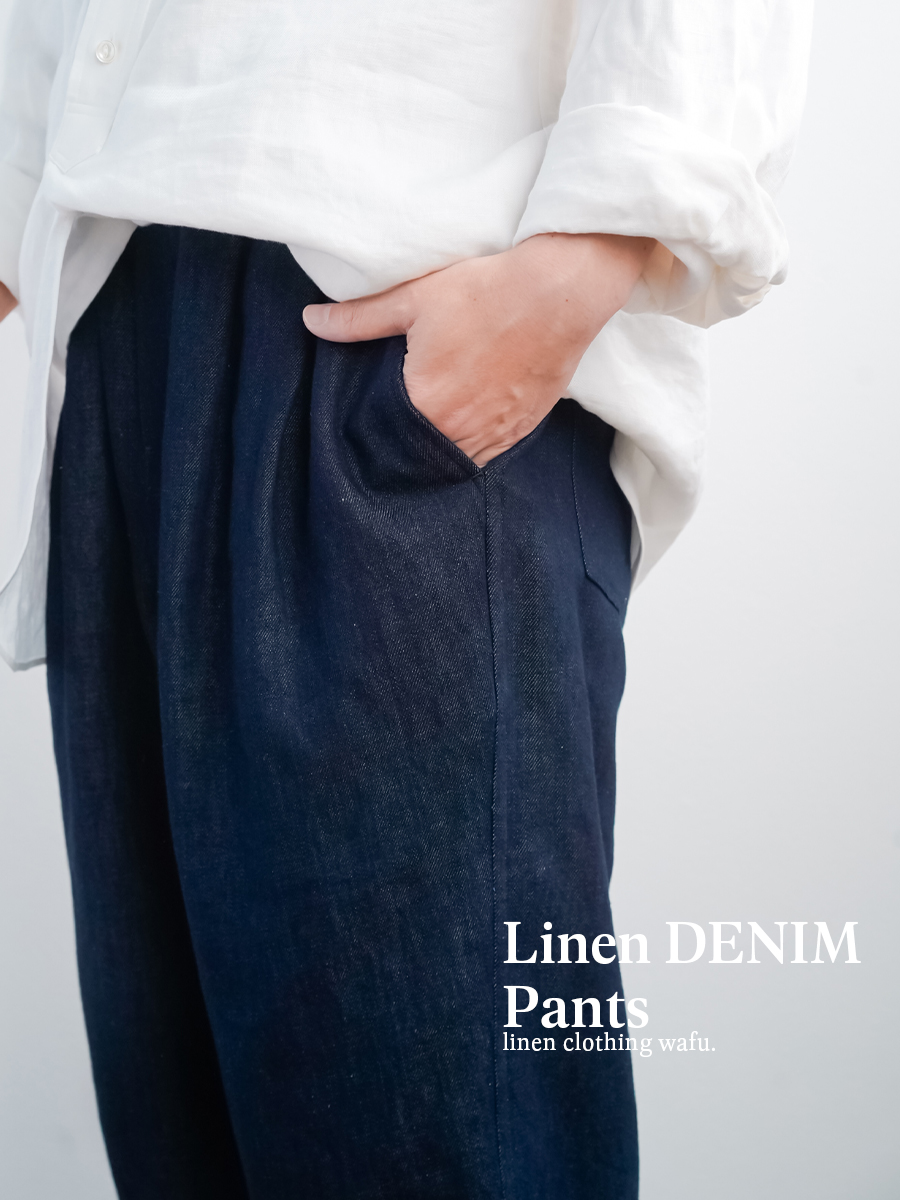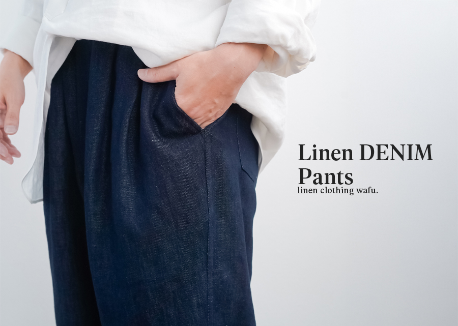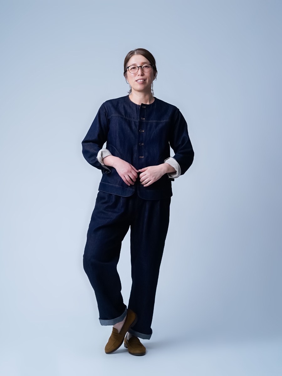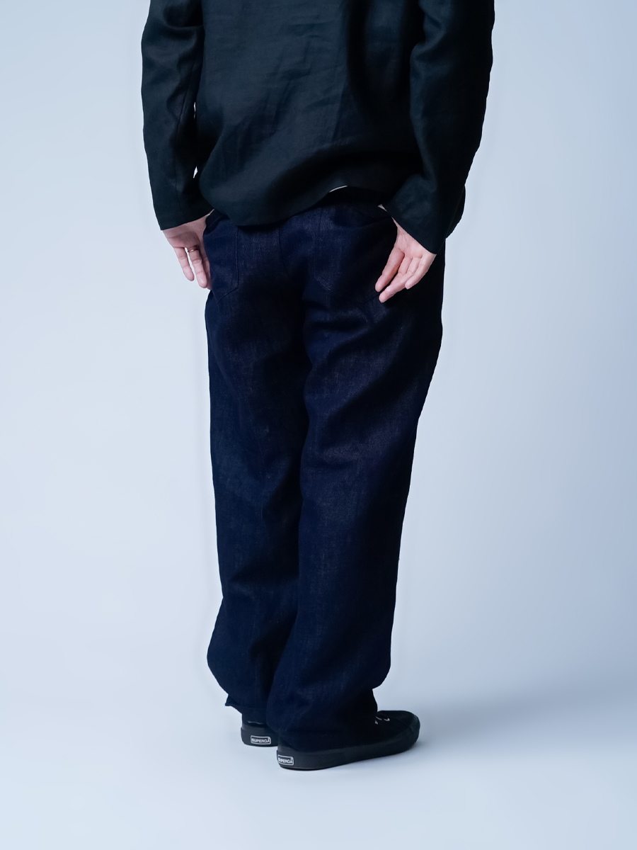 このデニムが育った時、どれだけカッコよくなるのか想像するだけでワクワクします。遠藤さん、今回も最高の一本をありがとうございます。私はMサイズを選びました。ウエストから入ったタックのラインが太ももの半分あたりまで伸びていて、脚をすらりと長く見せてくれます。お尻まわりはラインを拾わず、ほんのりゆとりがあるので、少し下げて腰穿きしても女性らしくサマになります。丈は素足で立ったときに床ギリギリの長さで、落ち感がとてもきれい。ウエストも締め付け感がなく、長時間穿いても快適です。そして今回はリネンデニムで仕立てたことで、まるで別物に大変身。デニム好きにはたまらないこのシルエットです。ウエストに入ったタックが腰まわりのハリを軽減し、すっきり見せてくれます。