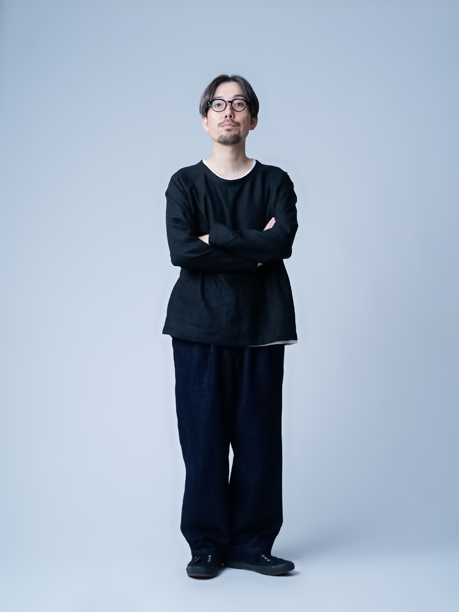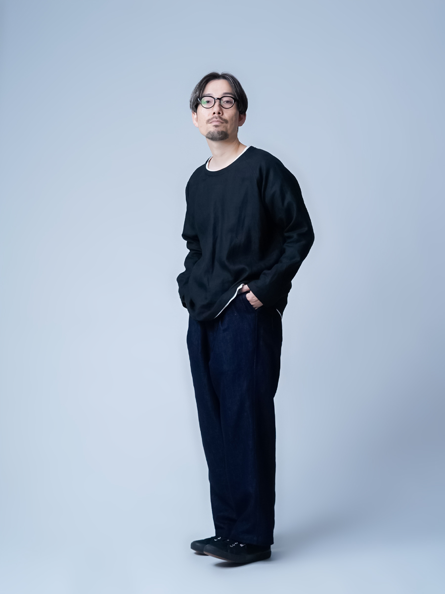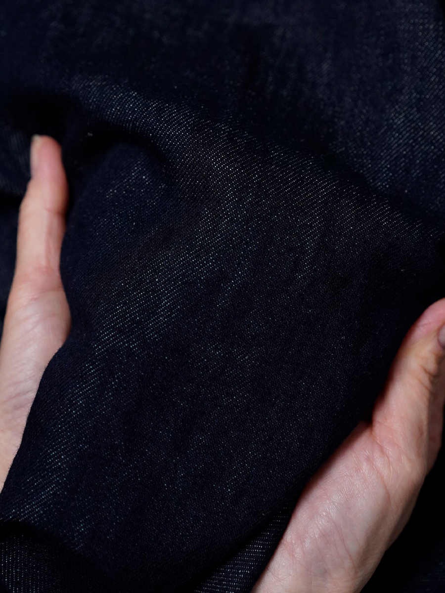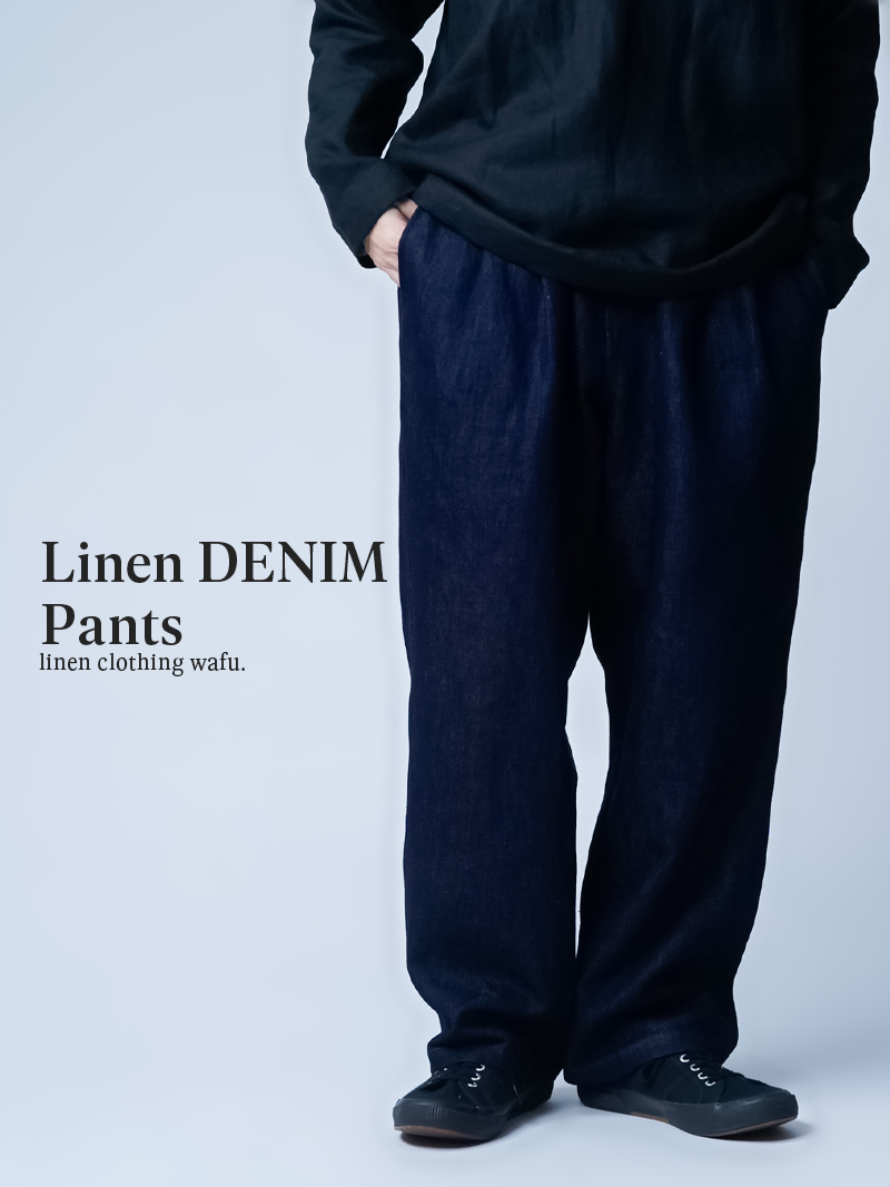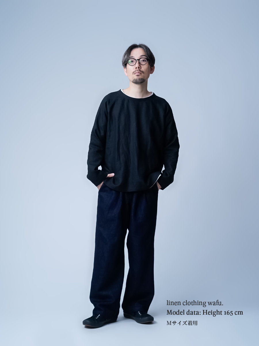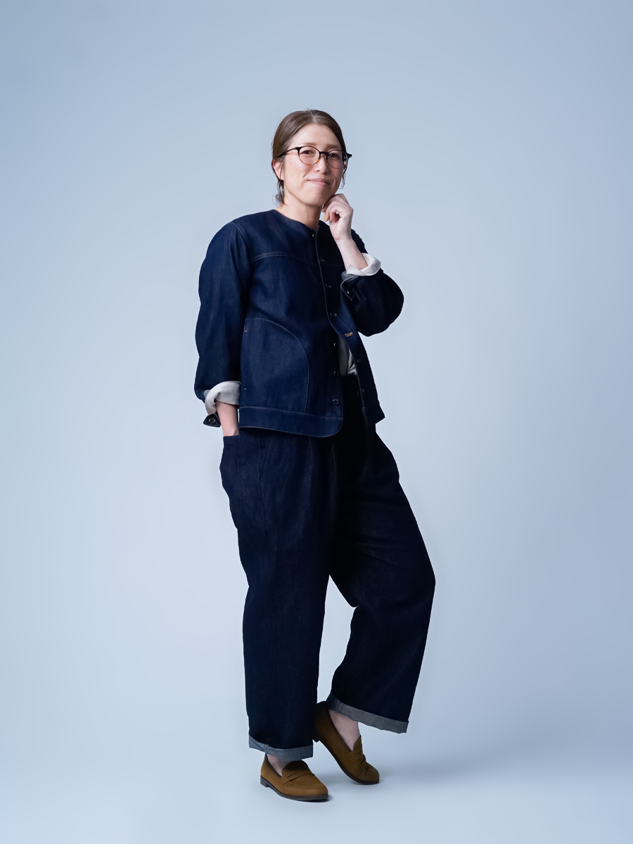 このデニムが育った時、どれだけカッコよくなるのか想像するだけでワクワクします。遠藤さん、今回も最高の一本をありがとうございます。私はMサイズを選びました。ウエストから入ったタックのラインが太ももの半分あたりまで伸びていて、脚をすらりと長く見せてくれます。お尻まわりはラインを拾わず、ほんのりゆとりがあるので、少し下げて腰穿きしても女性らしくサマになります。丈は素足で立ったときに床ギリギリの長さで、落ち感がとてもきれい。ウエストも締め付け感がなく、長時間穿いても快適です。そして今回はリネンデニムで仕立てたことで、まるで別物に大変身。デニム好きにはたまらないこのシルエットです。ウエストに入ったタックが腰まわりのハリを軽減し、すっきり見せてくれます。