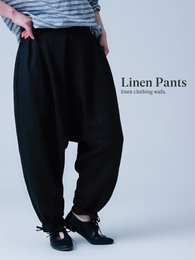 リネンのサルエルは気持ちがいいですね。着丈はぎゅんぎゅんにウエストを上げても裾でクシュッとなる感じでした。ウエストはゆとりがありゴムの締め付けはありません。意外にいろんなトップスとも相性がいいので私もチャレンジしてみようかな。裾の紐も自分で調節できるのもいいですね。