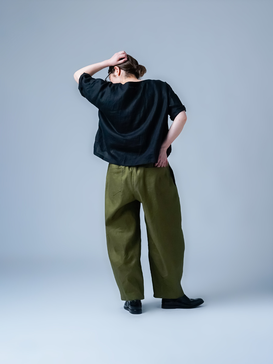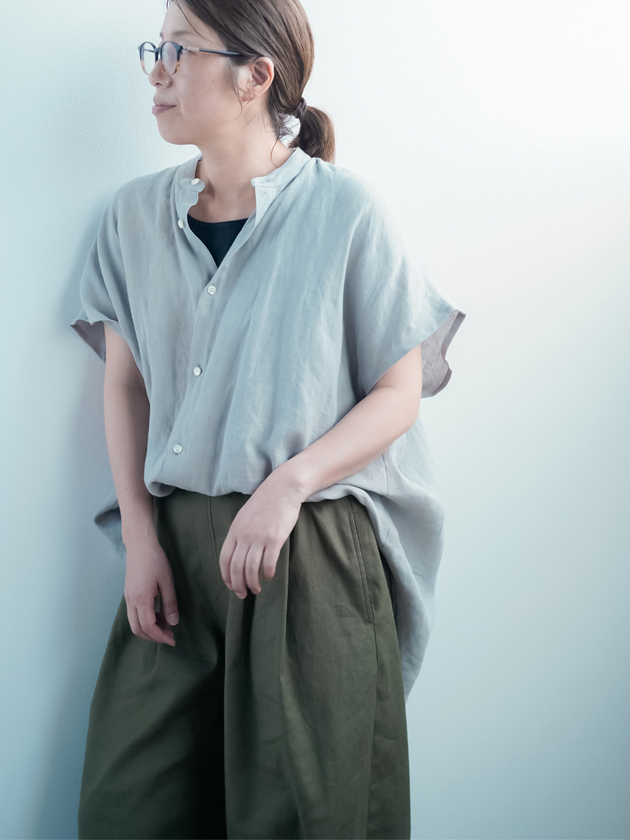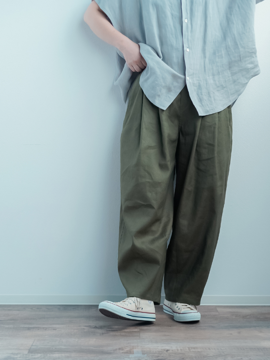 - ※生地工場の生産時期によって色味の濃淡が出ることがございます。セットアップでの着用の場合はご相談下さい。カラーリネンは最初色落ちや生地の性質上、毛羽落ちがある場合がございます。落ち着くまで数回は単品でのお洗濯を。最初は水通しをおすすめします。表面の毛羽立ちがとれて、肌への刺激が極端に少なくなります。リネン特有のネップ、節がございます。