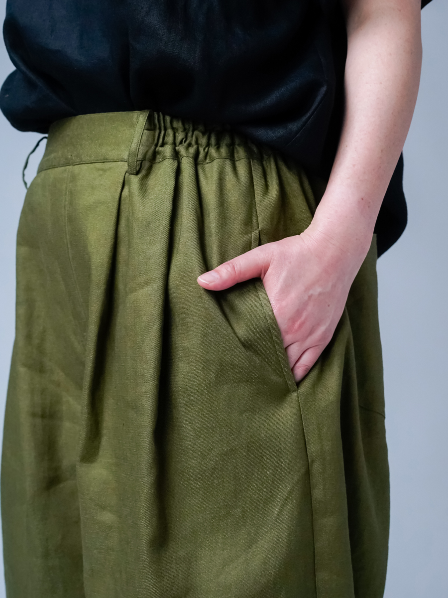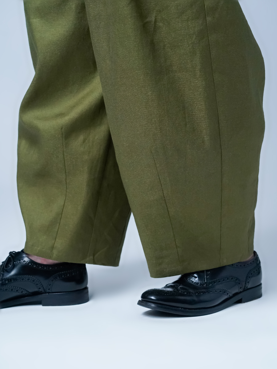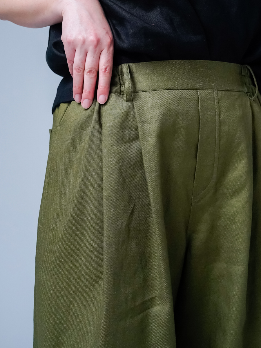 - ※生地工場の生産時期によって色味の濃淡が出ることがございます。セットアップでの着用の場合はご相談下さい。カラーリネンは最初色落ちや生地の性質上、毛羽落ちがある場合がございます。落ち着くまで数回は単品でのお洗濯を。最初は水通しをおすすめします。表面の毛羽立ちがとれて、肌への刺激が極端に少なくなります。リネン特有のネップ、節がございます。