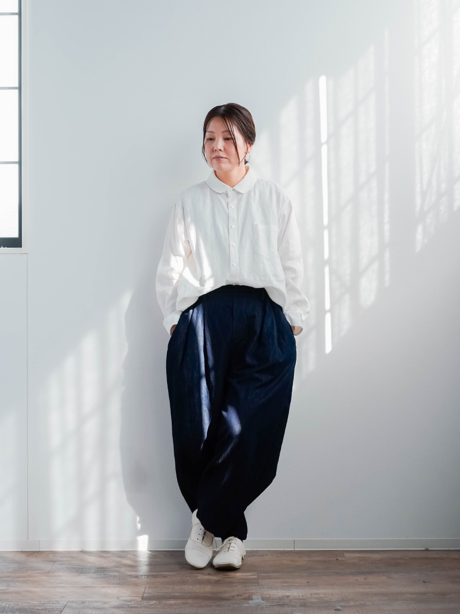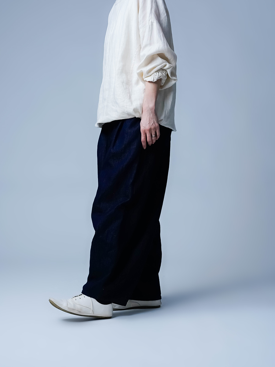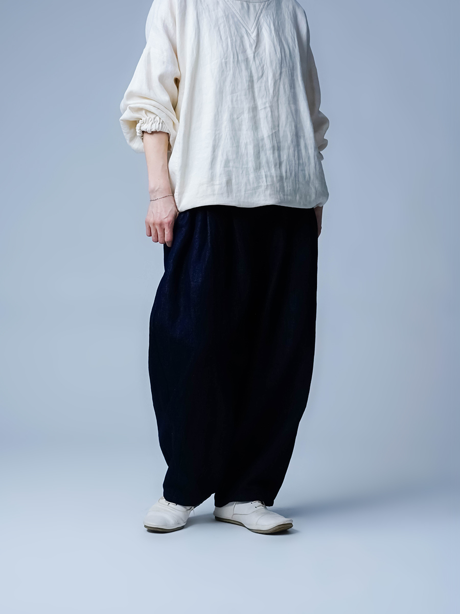 撮影時でもよく使います。シルエットがかわいくおしゃれなのでついつい撮影の時も穿いてしまうこのパンツがデニムになって登場ですね。太さと長さのバランスが絶妙でゆったりしているのにスタイルよく見えてしまうこの不思議な感覚は穿いてみないとわからないです。私はこのお尻のもたつき感がとても好きです着丈はオヘソで穿いて床から3センチほど上くらいです。