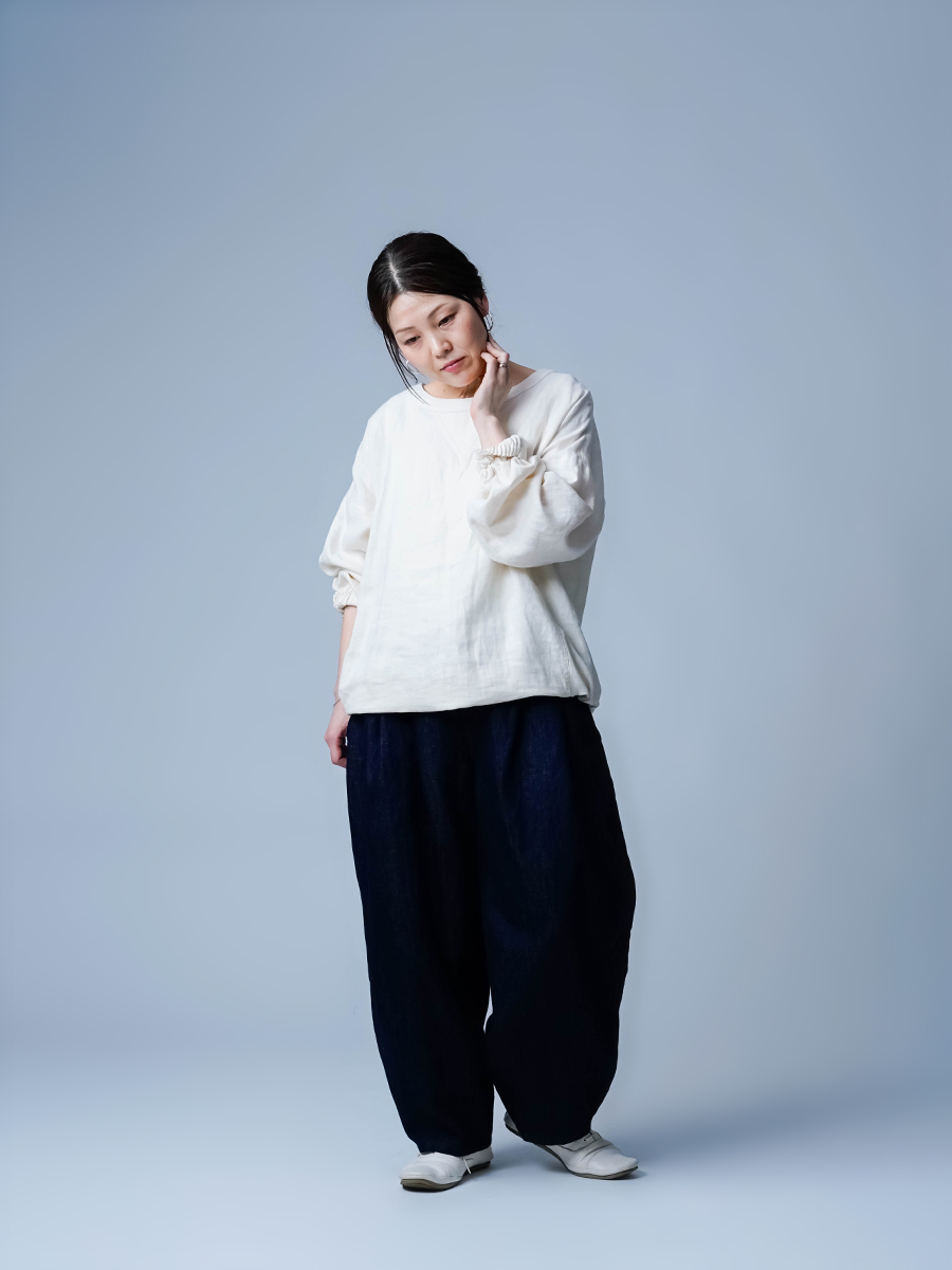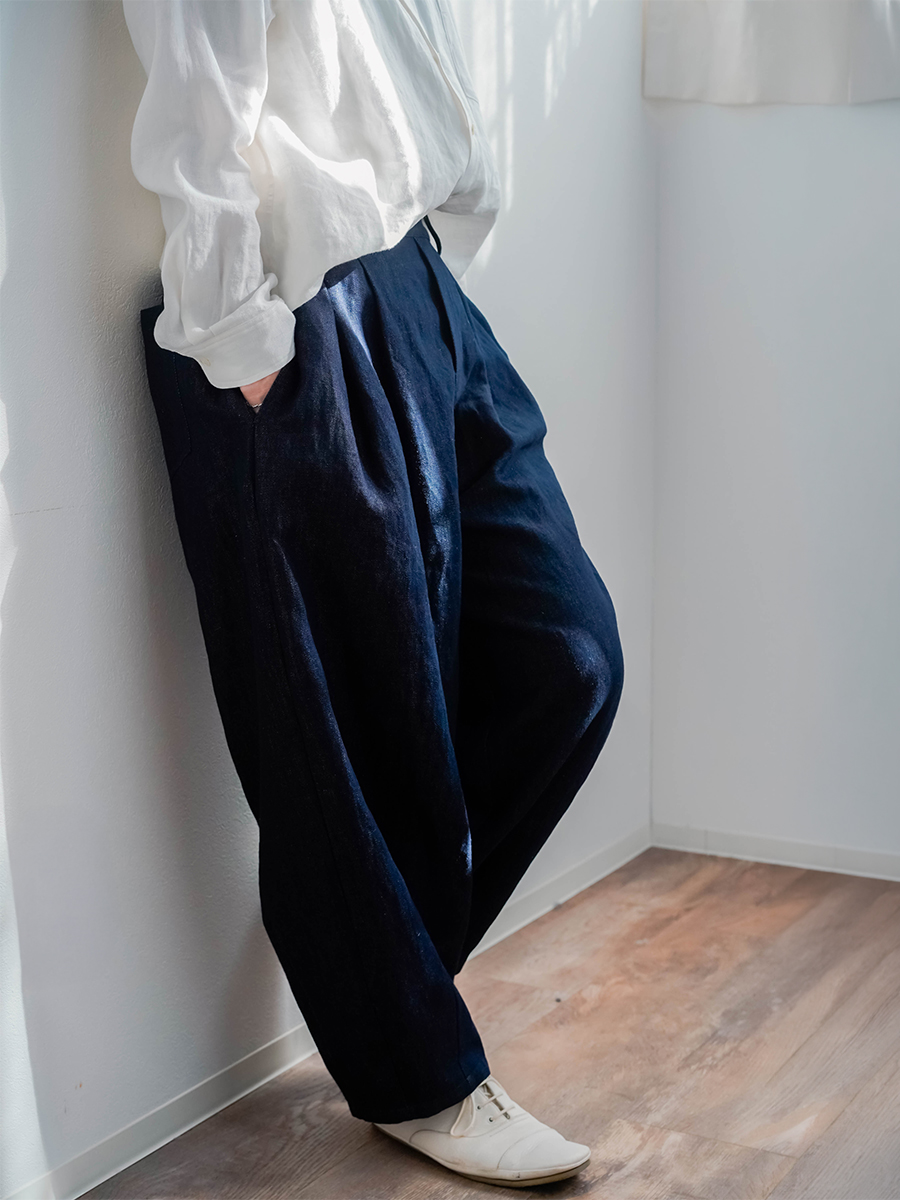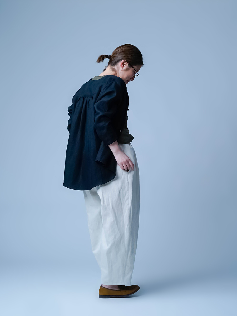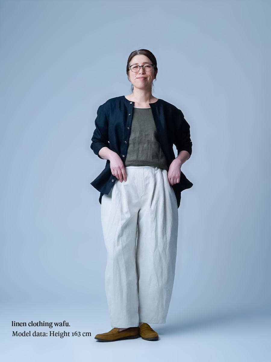 - ※生地工場の生産時期によって色味の濃淡が出ることがございます。セットアップでの着用の場合はご相談下さい。カラーリネンは最初色落ちや生地の性質上、毛羽落ちがある場合がございます。落ち着くまで数回は単品でのお洗濯を。最初は水通しをおすすめします。表面の毛羽立ちがとれて、肌への刺激が極端に少なくなります。リネン特有のネップ、節がございます。