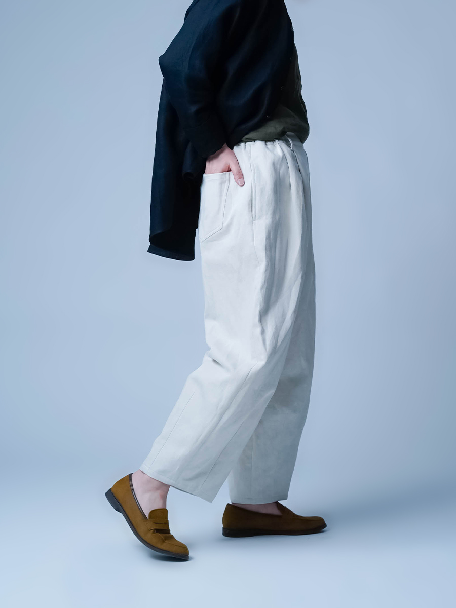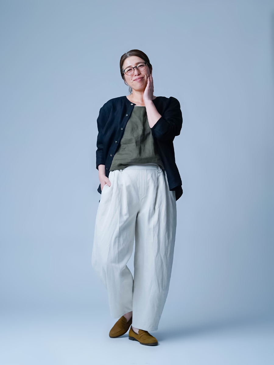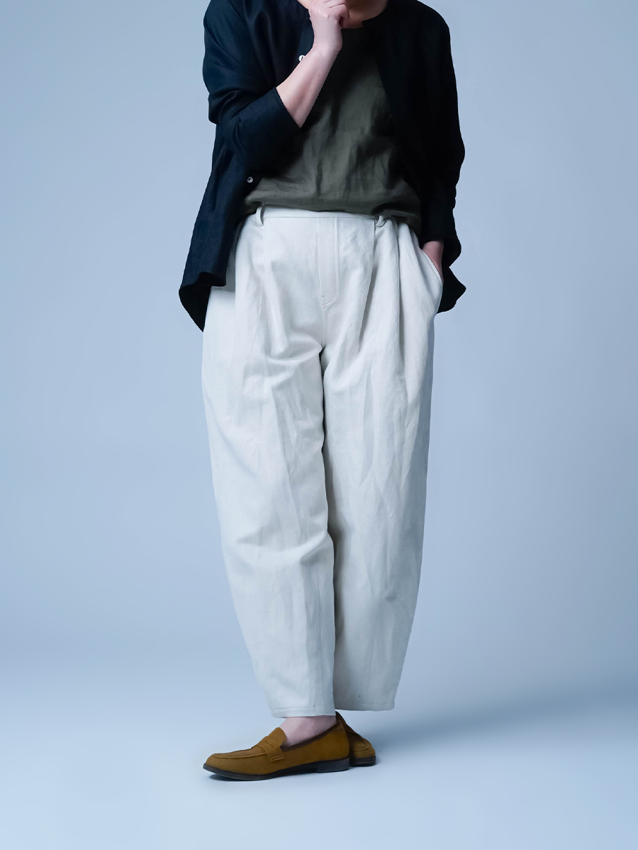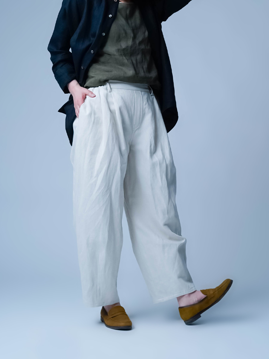 下半身がしっかりめの私もお気に入りの一本。わたり幅をゆったり取っているので、下半身を気にされる方にも安心して履いていただけます。フロントのタックが、前から見たときにすっきりとしたシルエットに。存在感がありながらも、全体はすっきりまとまるパンツです。