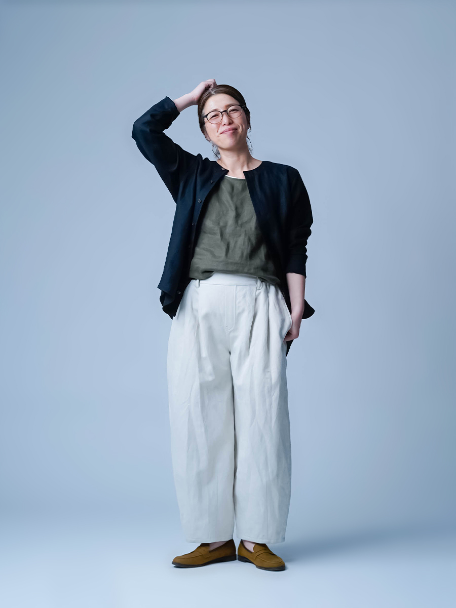 雰囲気あるパンツです。最初は少し大きいかなと思いましたが、馴染んでくると腰まわりのタックがストンと落ち、きれいなシルエットに。体のラインを拾わず、かっこよく履けるパンツだと感じました。丈はおへそ上で着用して足の甲につくくらい。カットをしなくても、そのままで問題なさそうな丈感です。