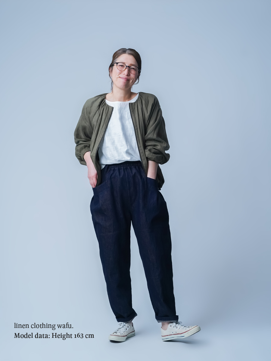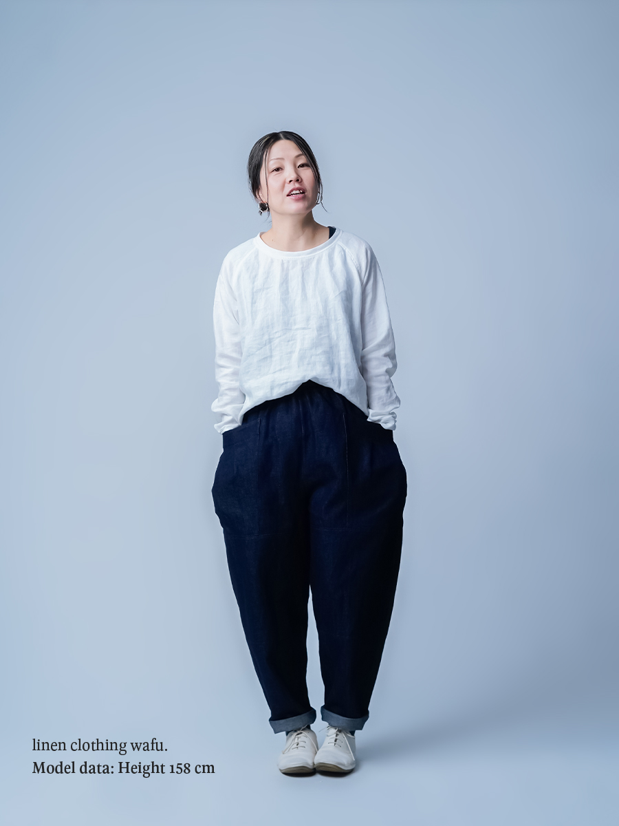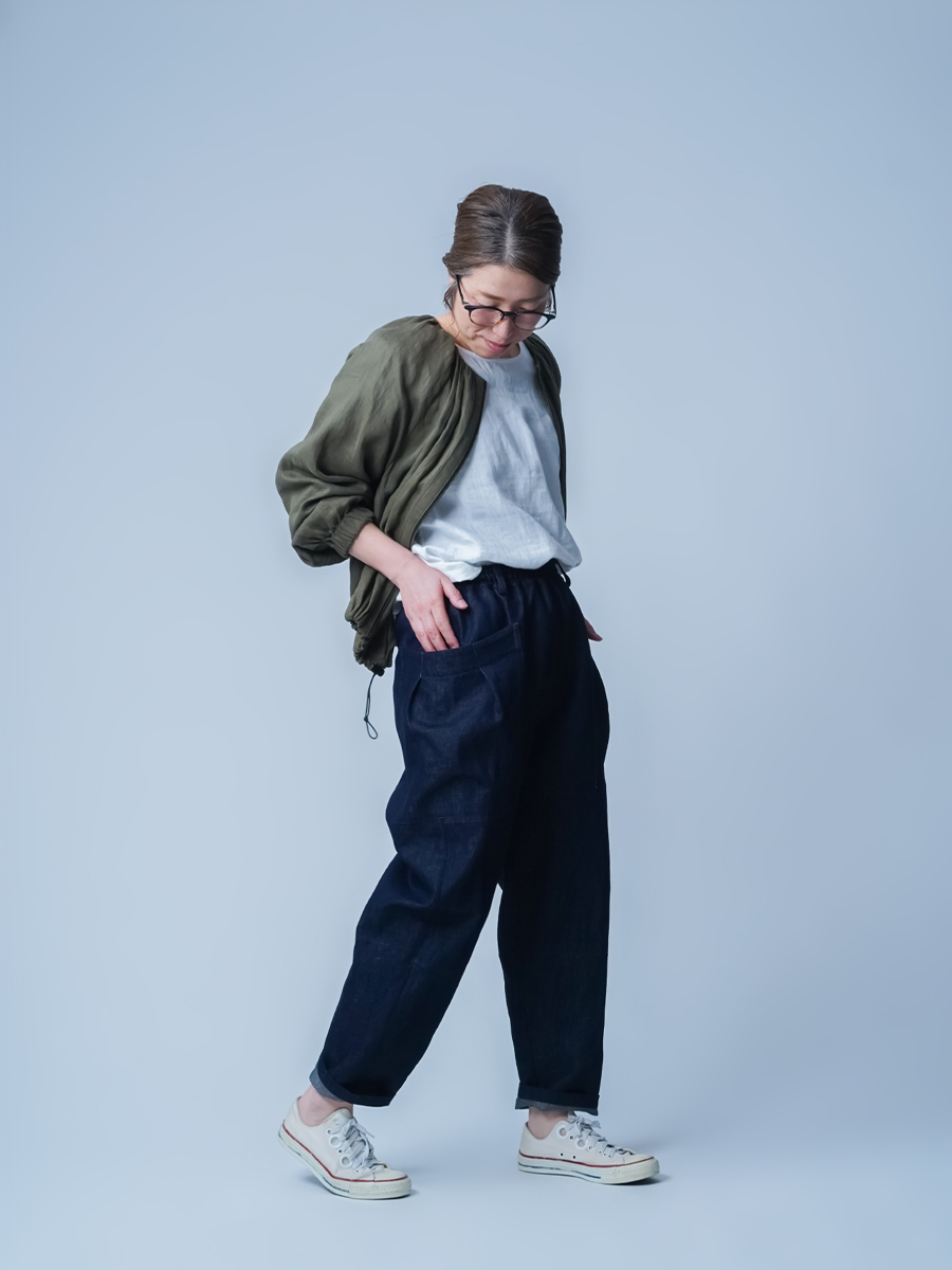 ロールアップで履きたいです。大きなポケットとテーパードのデザインが、なんともおしゃれ。丈はへそ上で履いて足の甲につき、床ぎりぎりの長さ。丈は直さず、2回折りのロールアップで楽しみたいです。リネンデニムならではの柔らかさが心地よく、手放せないパンツです。