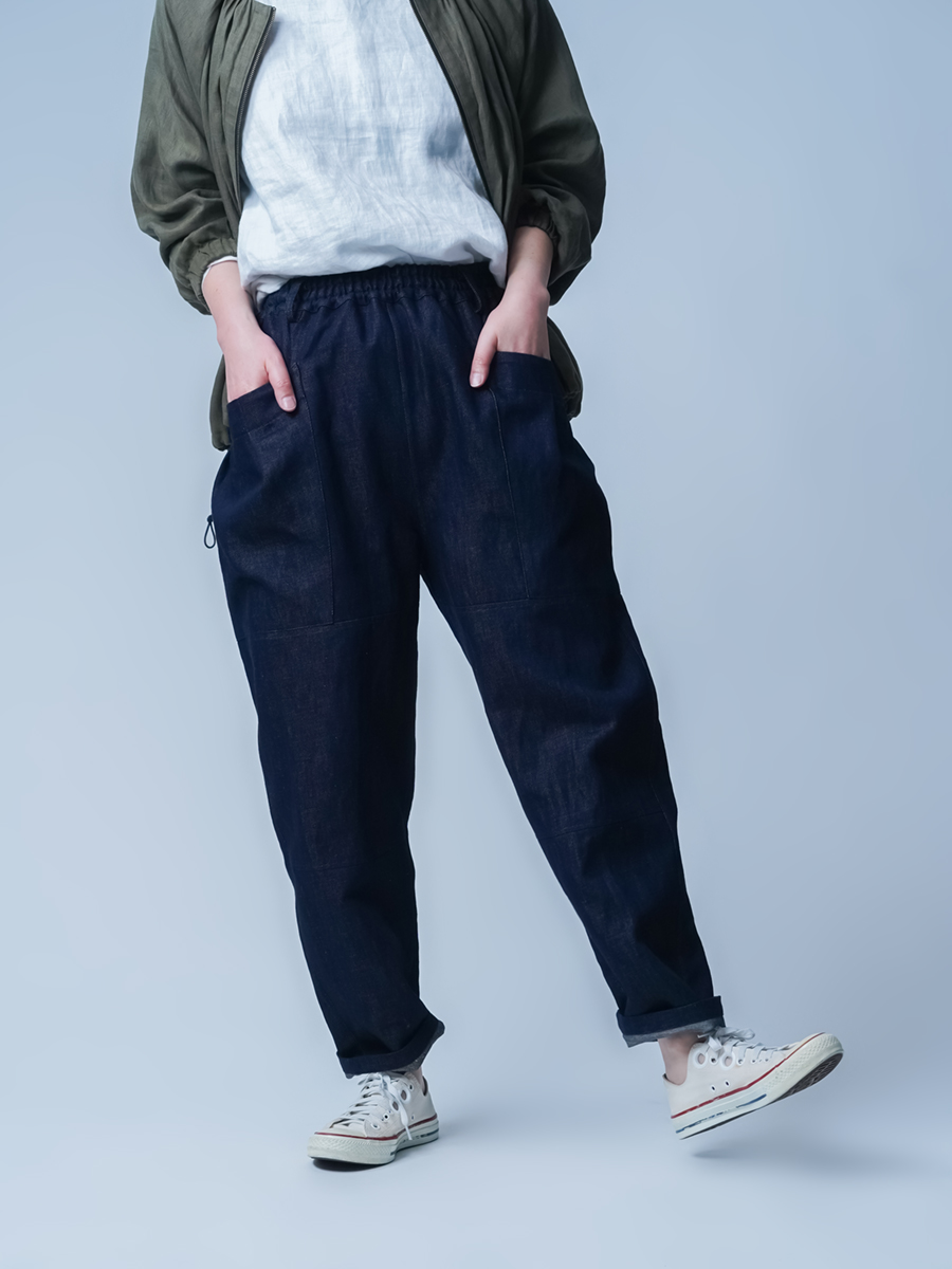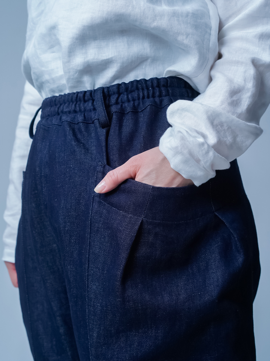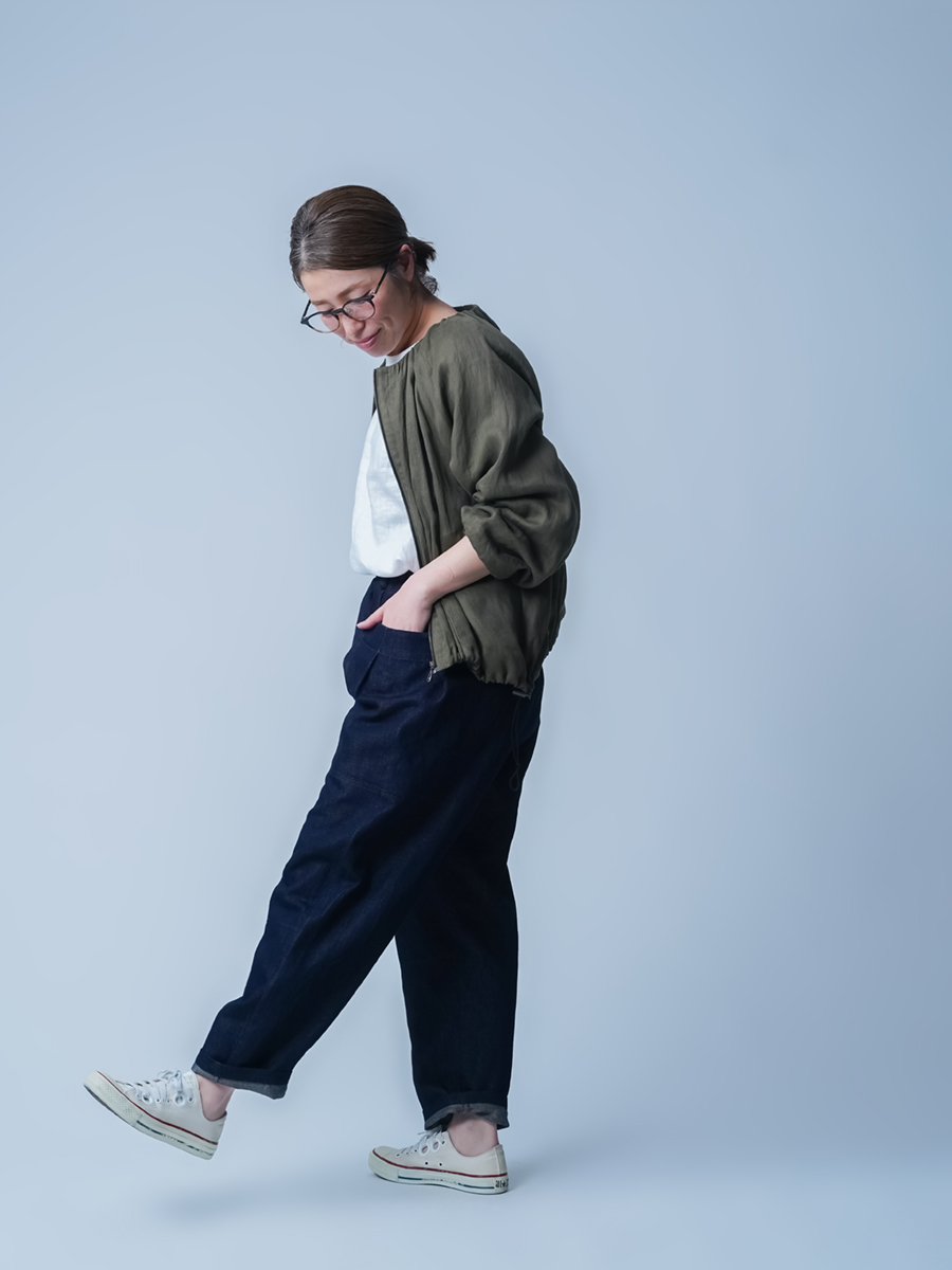 ロールアップで履きたいです。大きなポケットとテーパードのデザインが、なんともおしゃれ。丈はへそ上で履いて足の甲につき、床ぎりぎりの長さ。丈は直さず、2回折りのロールアップで楽しみたいです。リネンデニムならではの柔らかさが心地よく、手放せないパンツです。