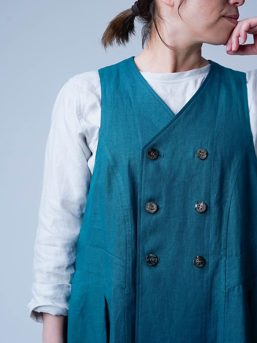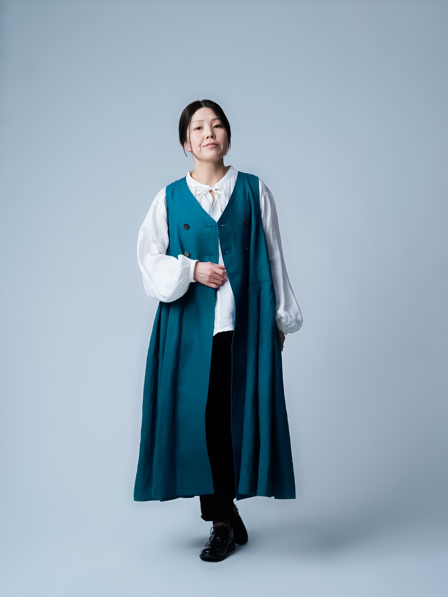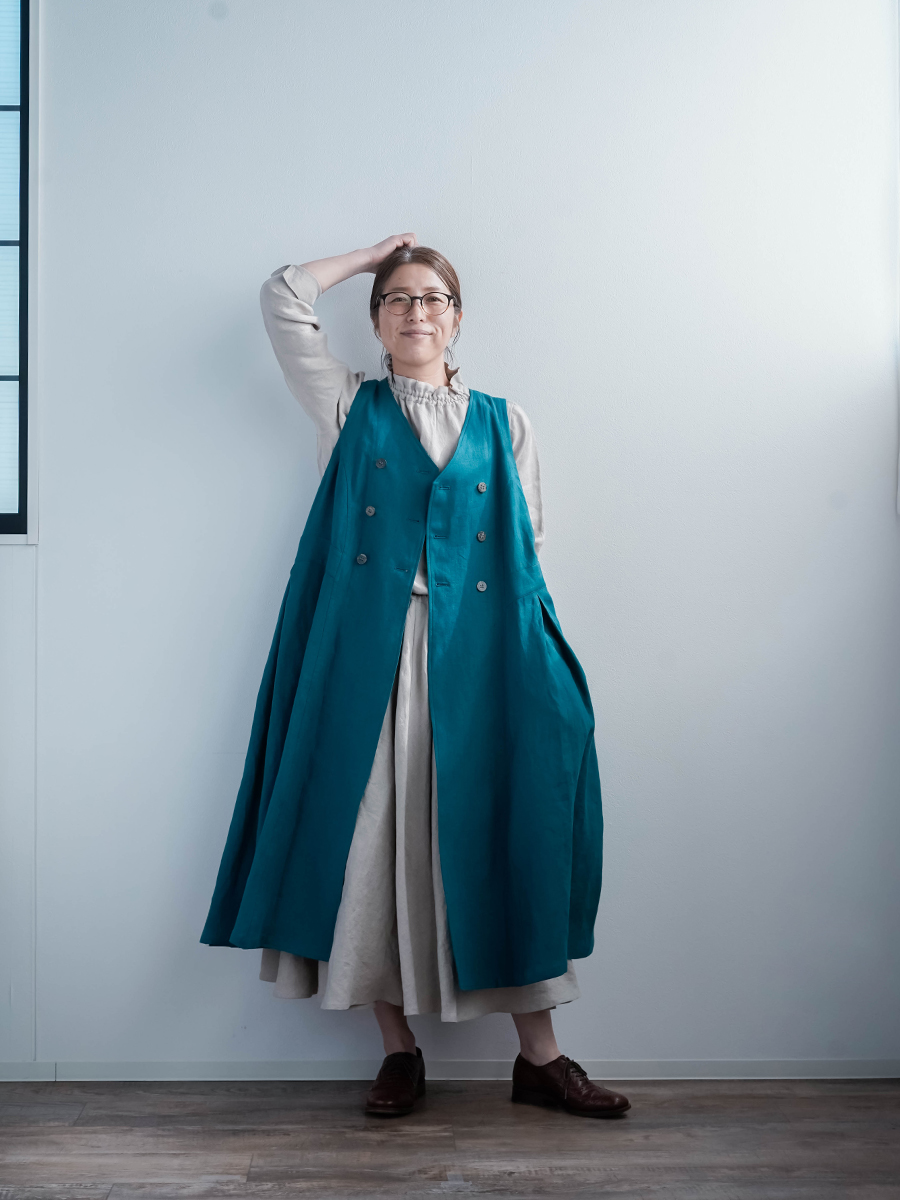 着丈はふくらはぎ半分の少し下くらい。身幅は余裕があり厚手のニットも重ね着可能です。ウエストの切替部分から広がる鍵盤タックとフロントのダブルボタンによってシンプルな合わせでもこのジレでおしゃれに仕上げてくれる素敵なアイテムです。気になるおしりや脚などをおしゃれにカバーしてくれるのもいいですよね。
