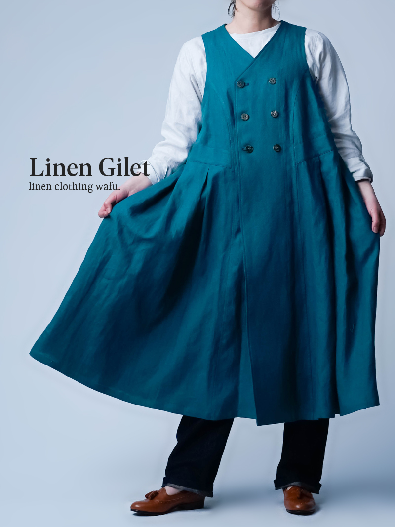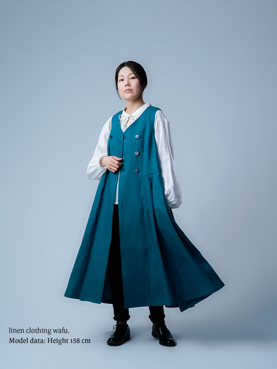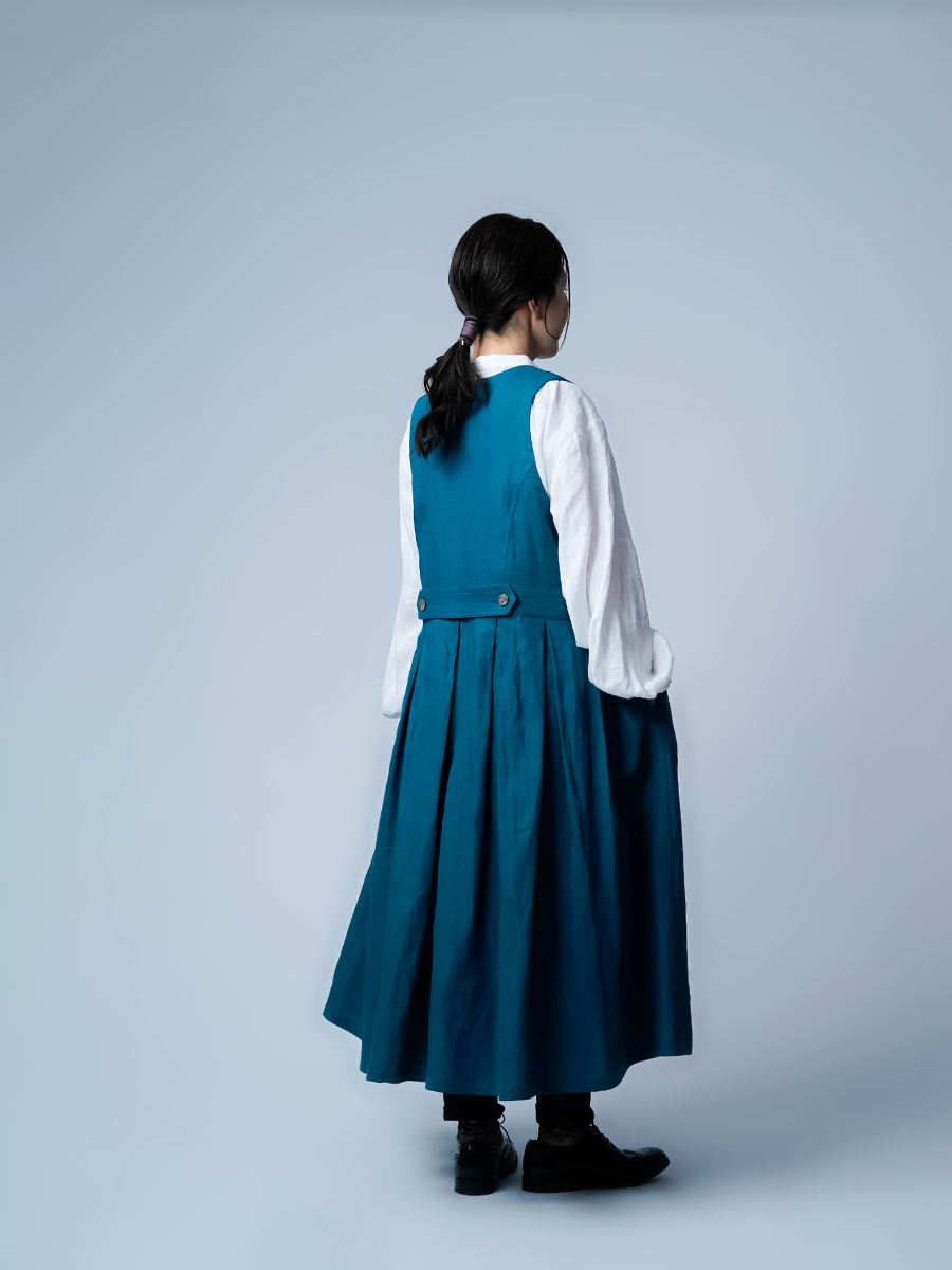 着丈はふくらはぎ半分の少し下くらい。身幅は余裕があり厚手のニットも重ね着可能です。ウエストの切替部分から広がる鍵盤タックとフロントのダブルボタンによってシンプルな合わせでもこのジレでおしゃれに仕上げてくれる素敵なアイテムです。気になるおしりや脚などをおしゃれにカバーしてくれるのもいいですよね。